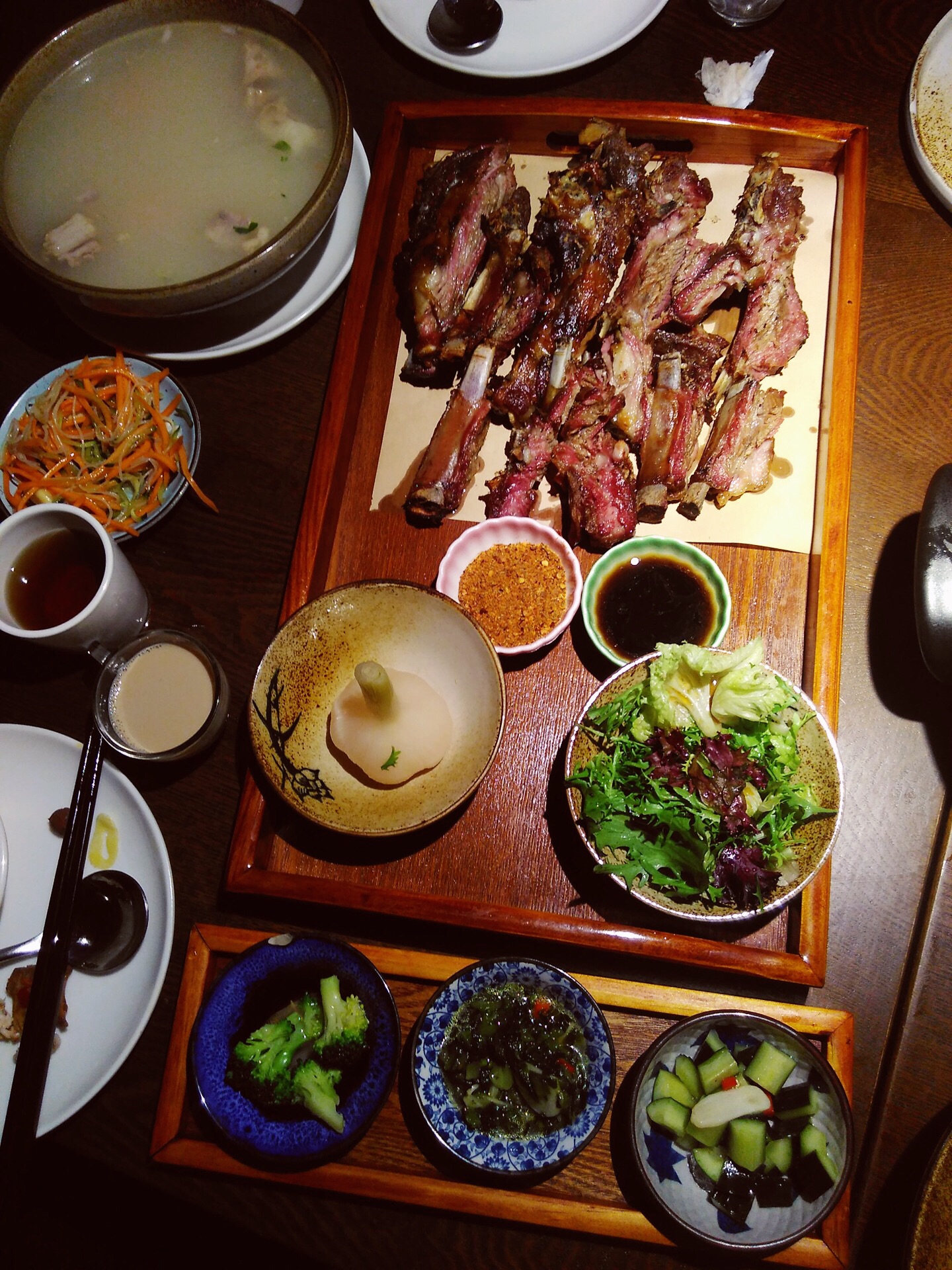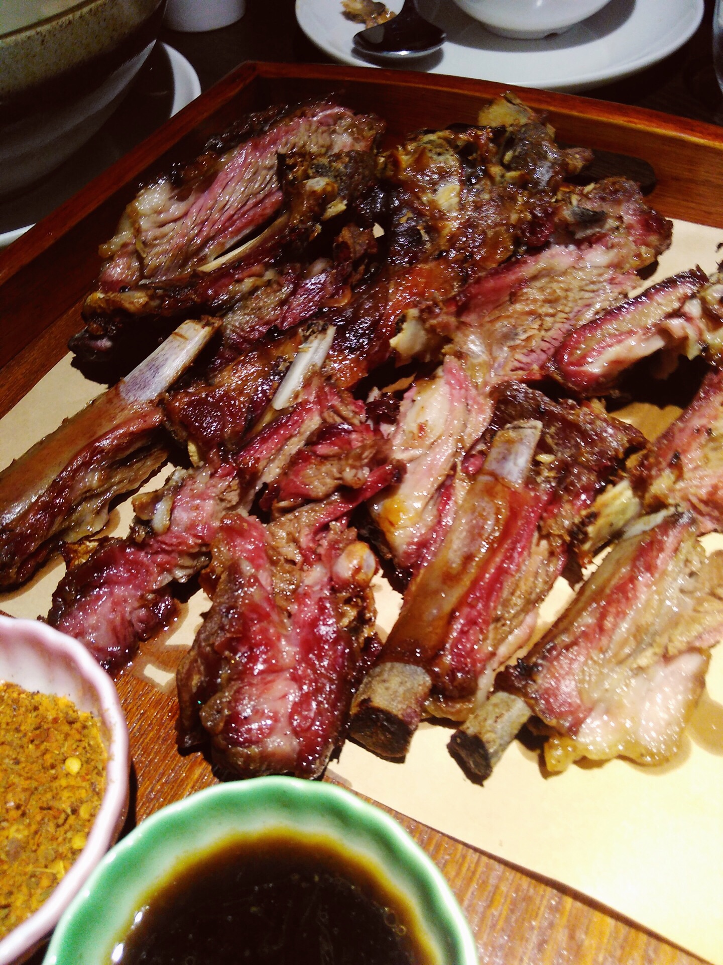 在上海¥200就能吃到一个烤羊套餐,这性价比简直逆天了。 【环境】开在大丸百货的,那时新疆装修的情调很有楼兰古城的味道。 【口味】服务员介绍最新的超值套餐里面有一个烤羊的套餐200都不到,可以摆满一桌。这性价比肯定是要点的,果然不出所料,我们抢到了日内最后一份套餐。 有汤有青菜还有最最关键的是整个的烤羊排。孜然和辣椒粉香气四溢,口感扎实但不油腻,配上店里的解腻奶茶,棒棒哒。 【服务】基本上有求必应生意好的不得了,服务员也非常的热诚。