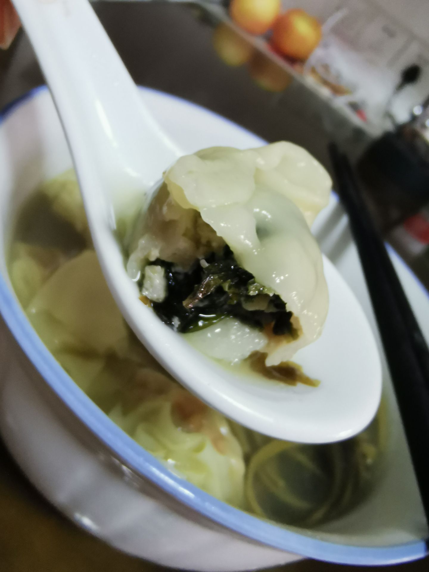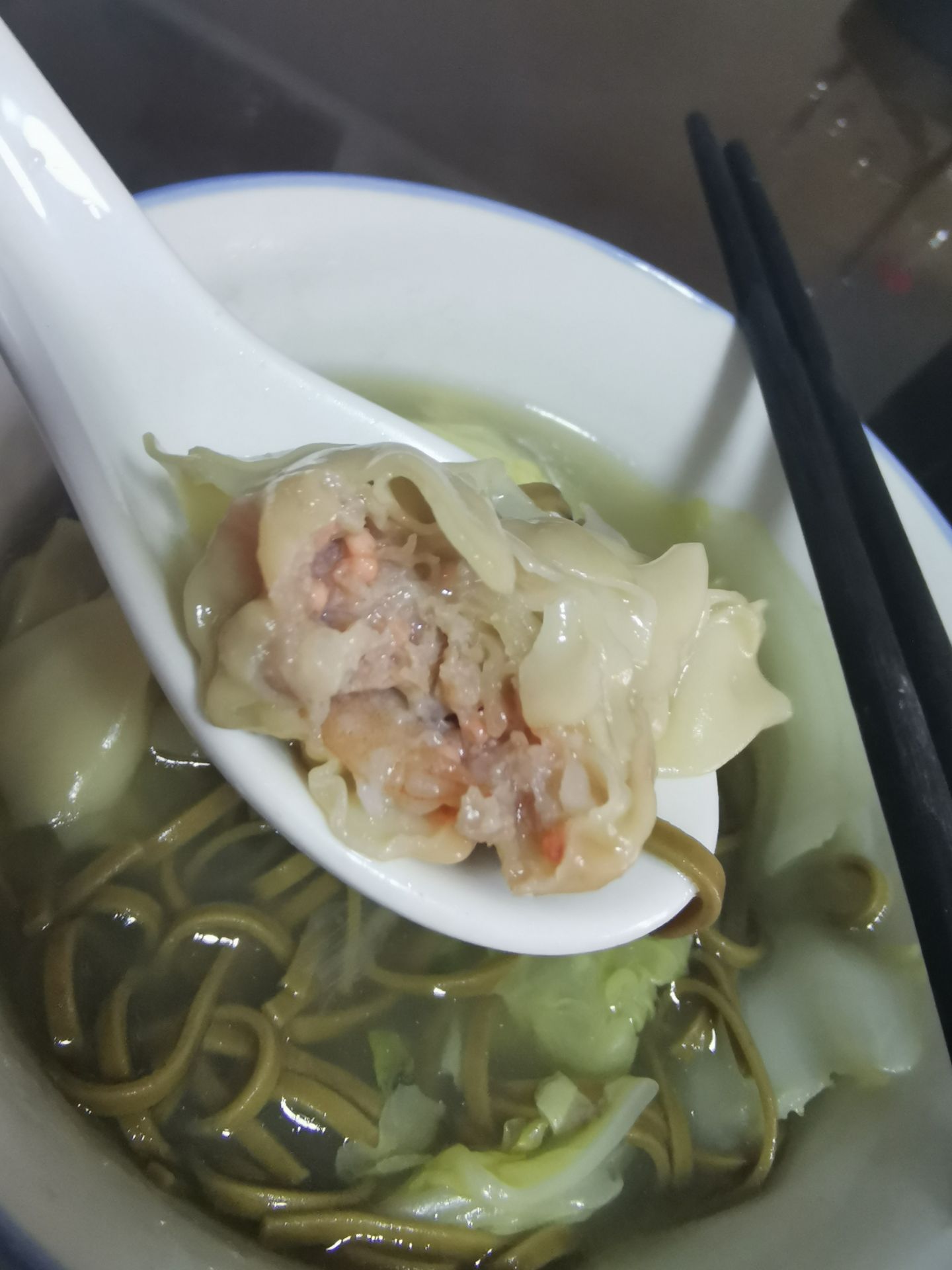 紫菜猪肉饺子,紫菜爽口,加上猪肉的口感,很不错。 炳记在广州已经来了好多年,都是做手工饺子和云吞