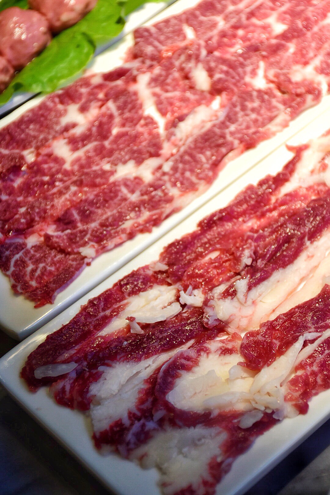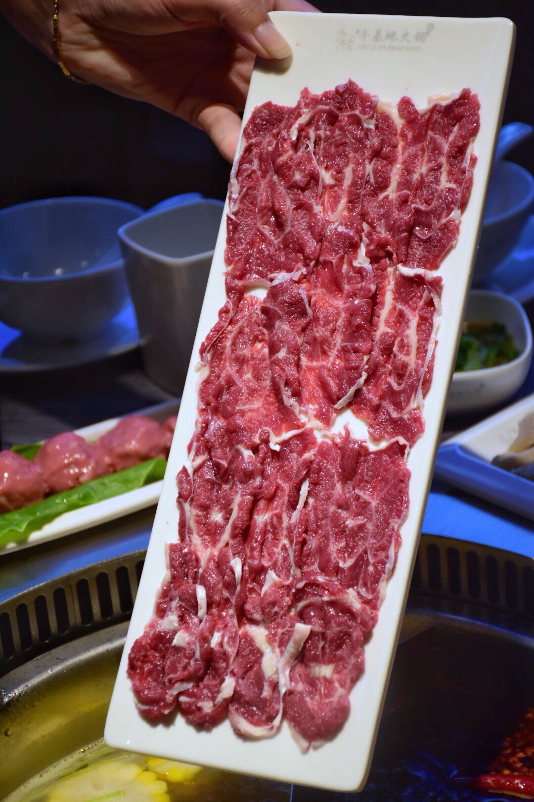 牛基地主打潮汕牛肉锅,只选有温度的好牛,半开放式的橱窗,现点现切新鲜程度看得见。 为了照顾爱吃辣的人儿,店里推出了鸳鸯锅,满足了我和朋友一个重口味一个清淡口味的人。 一次下锅一整盘,分分钟吃完!五花趾、雪花牛肉一次可以吃下好几盘!对了,店里的手打生肉丸味道也很好!!又脆又弹还爆汁!一次可以吃下半份! 店里的蘸水,既有已经调制好的,也可以自己DIY!个人还是最爱沙茶酱+花生酱+芹菜+香菜,无论是吃肉还是吃青菜都很百搭!配万物哈哈哈!