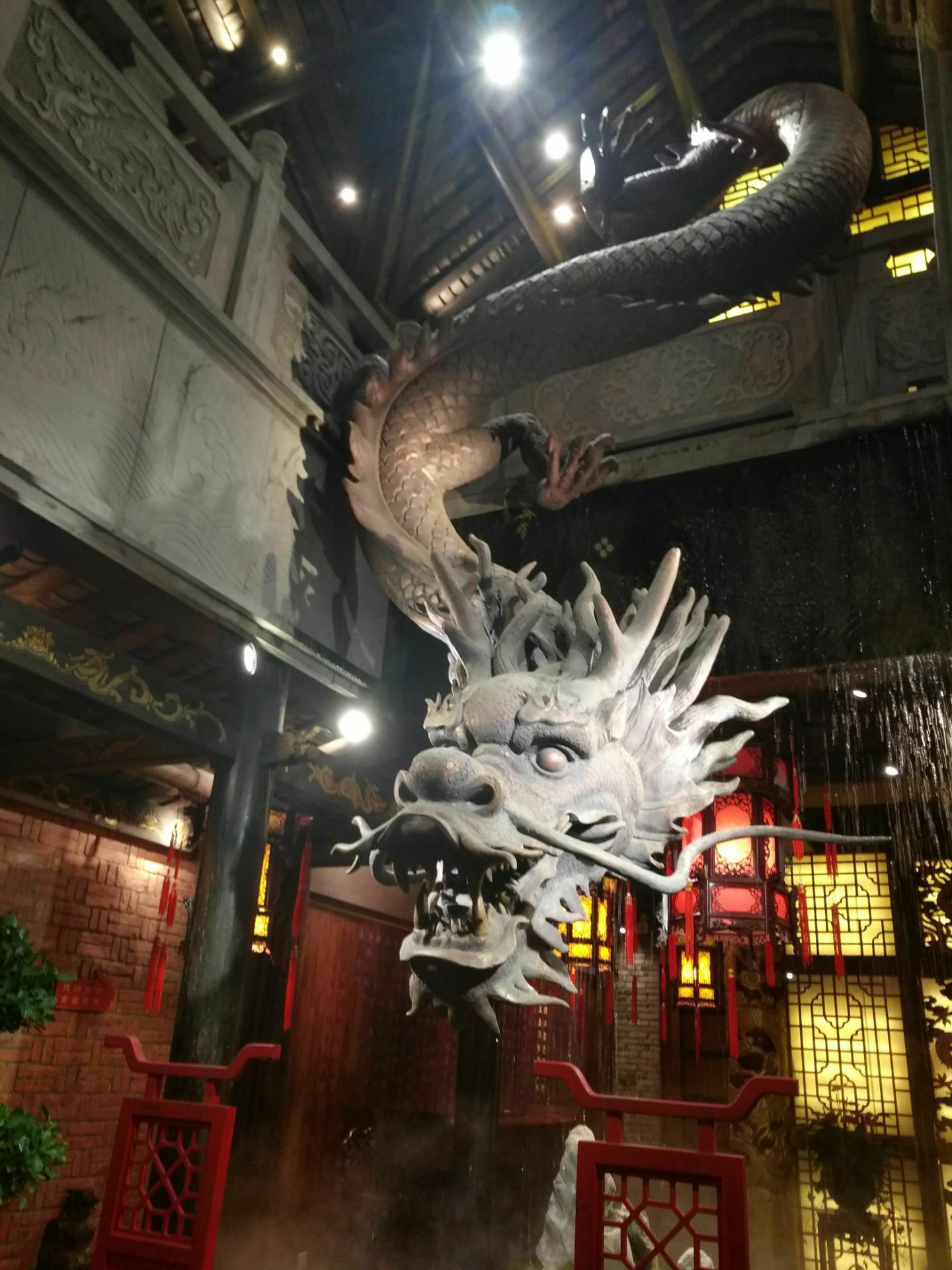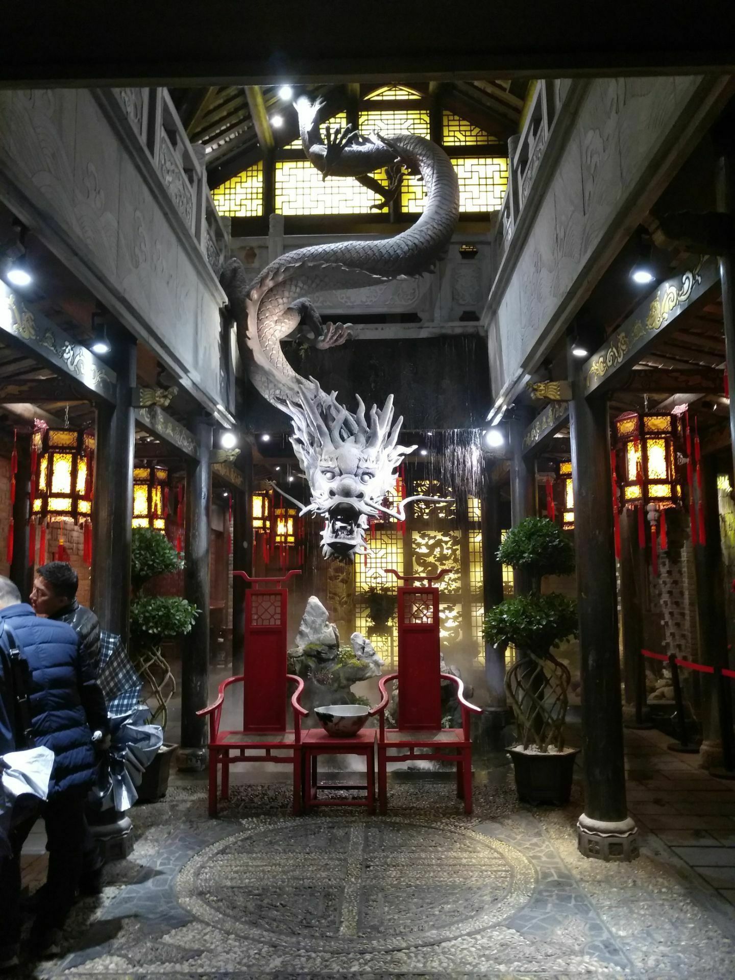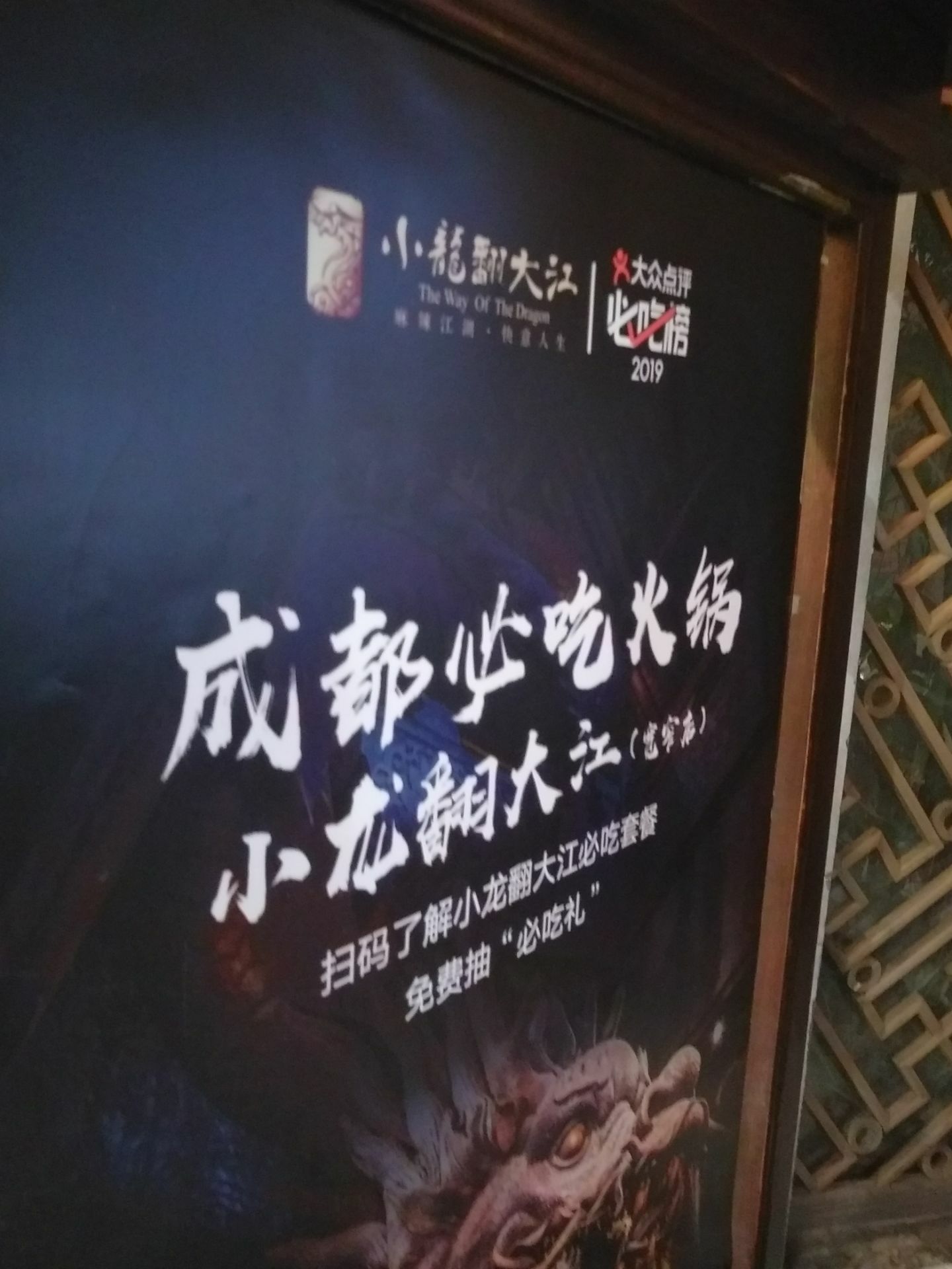 这个店因为它位于宽窄巷子之上,所以人流都非常大。我们来这里并不是因为他的名气,而是因为路过的时候看见了一条龙横跨店门之上。来到了成都怎么能够不吃火锅,来到了宽窄巷子怎么能够不品尝一下小龙翻大江火锅里面的火锅呢,这是我们当地同事对我们说的话。