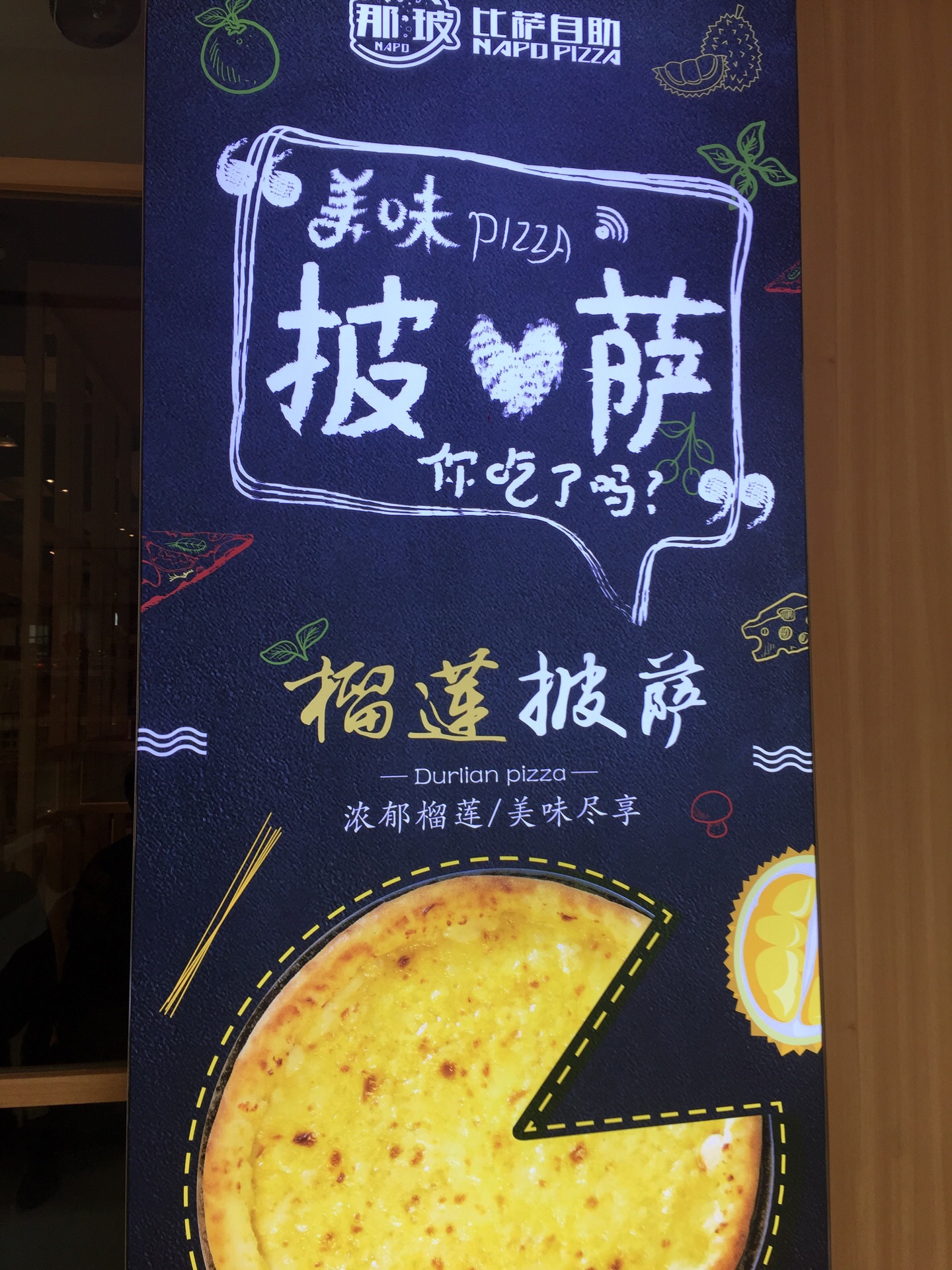 在万达的四楼,进门就是一个收银台,有好几个工作人员在门口发传单呢,里面好大,7字型的吧,中间就是美食了,披萨不多,就5个品种,然后又别的啊,炒粉炒饭,汤啊,水果,还有蔬菜沙拉,甜品有,好容易饱哦。口味还不错,会想念的。
