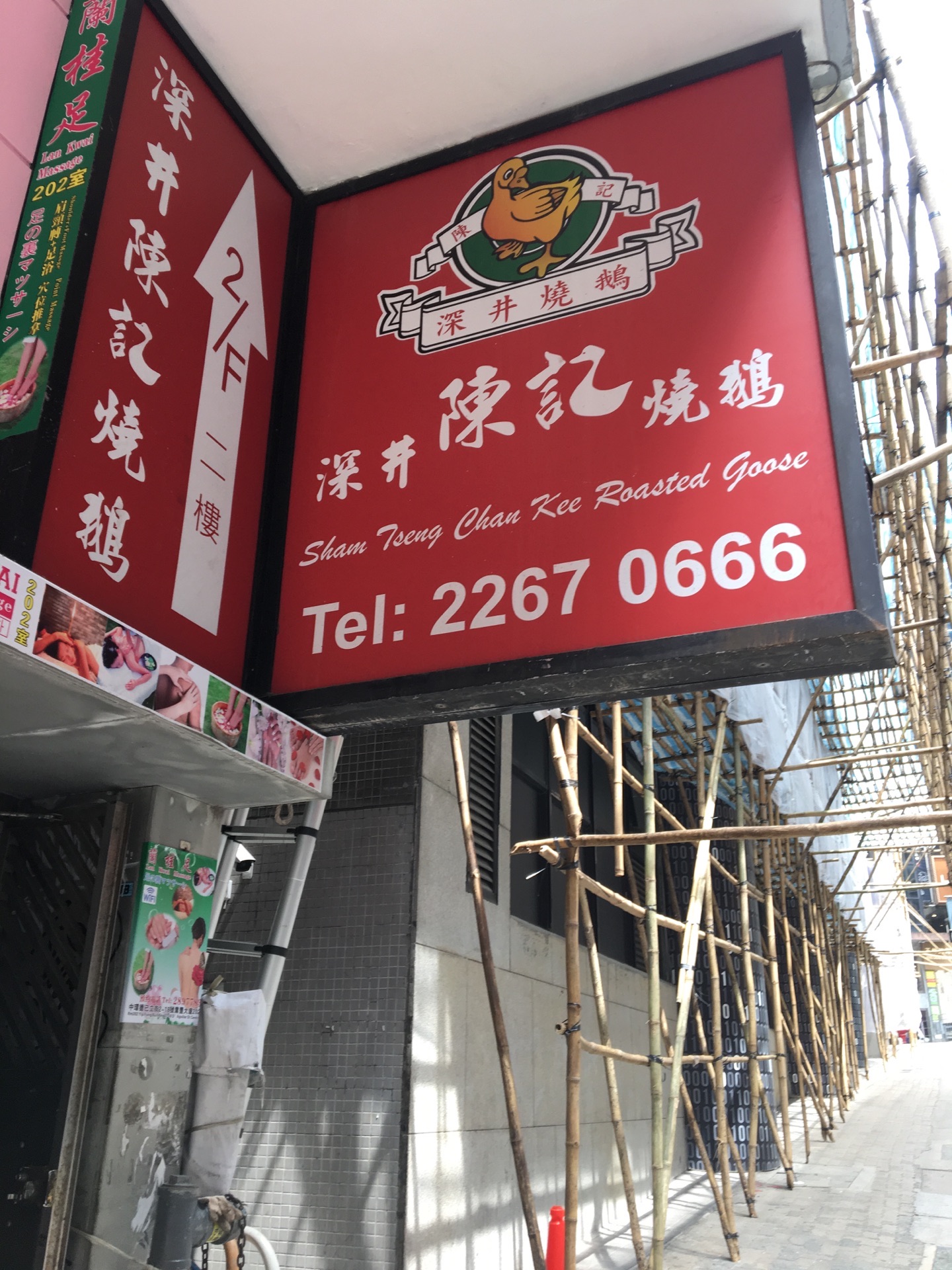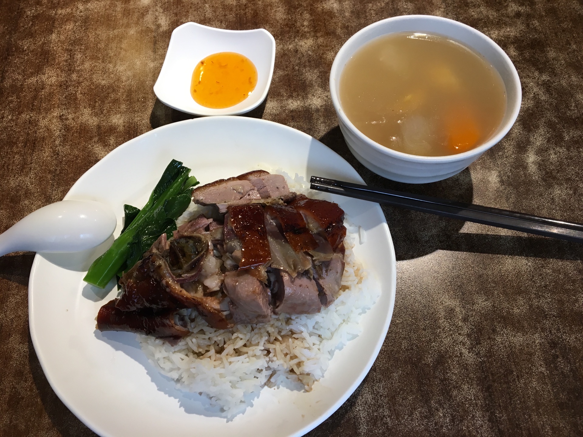 深井的总店位于香港的郊区,真的要去总店吃一次是不容易的,好在位于中环繁华的地段就有深井的分店,虽然门店很小,但是招牌足够大,还是很容易看得到的。窄窄的楼梯上去发现餐厅其实蛮大的,装修的也还不错,必吃的烧鹅是一定要点的。一份烧鹅饭会搭上一碗例汤,另外还有几根蔬菜,这就是最常见的香港人的午餐。