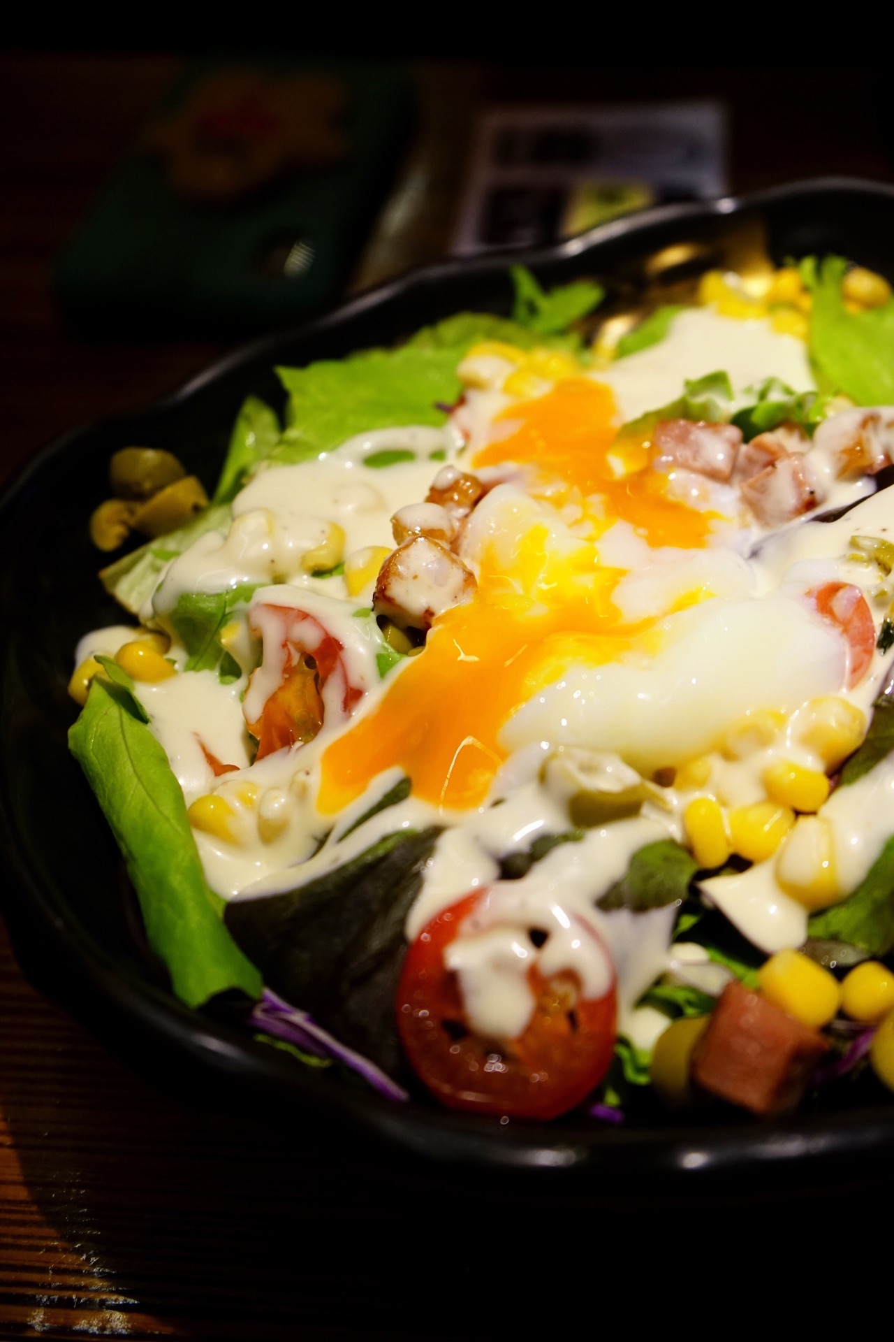 威宁路仙霞路这一带居酒屋遍地,味道都差不多吧大同小异。喜欢大志,所以爱屋及乌对小大志也存有些许好感。 墙上贴着海报,陈列各种价位的清酒,居酒屋画风一贯如此。待夜幕降临,店里逐渐热闹起来,上菜速度也开始变慢。 烤物系列挑了自己爱吃的鸡软骨和牛舌,软骨脆脆的很有嚼劲,牛舌火候适中,又香又嫩。 火山烤肉块几乎桌桌必点,五分熟肉色娇嫩。蘸黄油的吃法令我的罪恶感徒生,铁盘上的土豆泥更是浓香绵密,好吃到停不下来。 凯撒沙拉很大份,温泉蛋戳破内心暗爽,爽口的绿叶菜一解烤肉带来的油腻。 极上豚骨拉面是两种吃法,先喝汤吸面,再把米饭倒入。汤底厚重,稍微有些腻,叉烧肉肥厚的一大片,调味咸了点。溏心蛋是加分项哦,我的最爱。