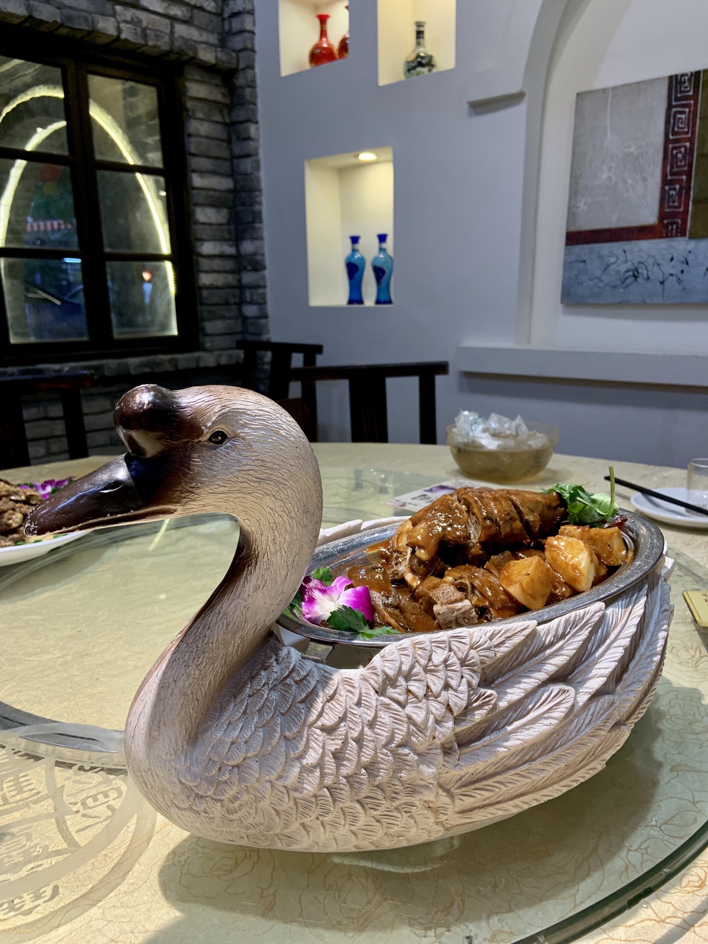被惊艳到的一家餐馆!!!建议必去!!! [薄荷]环境: 餐馆在一个小村里,看门面以为仅仅是家私房菜,进店后还没吃就被吸引了,四处鸟语花香, 每个包间错落有致,有室内包间、草屋包间、庭院包间、小艇包间…装饰各异,一开始以为是原本的大院改建,却听说是特意做旧,用回收的旧材料重新建的,真是惊掉我的双下巴,还有老板这么花功夫经营一家餐馆。 [服务铃]服务: 服务员没有过分刻意的服务,让到来的人自己感受现场的环境,品味该餐馆的美食,棒棒哒 以为只是环境有心思还很不够,这里的菜品也是扛扛滴,不是很名贵的菜肴,但有吃得出的心思。[调皮] 「五味鹅」虽然整只鹅上,实际分量不大,天气冷,底下有小火加热,鹅肉还是有点凉,不过味道咸淡适宜,非常入味,鹅肉松软,可轻易咬开。 「陈皮鸭翅」很喜欢的一道菜,陈皮味很清新,下酒下饭都很不错。 「沙姜乳鸽」味道是不错的,但乳鸽腌制的时间可能过长,肉质有点不是很新鲜的样子。