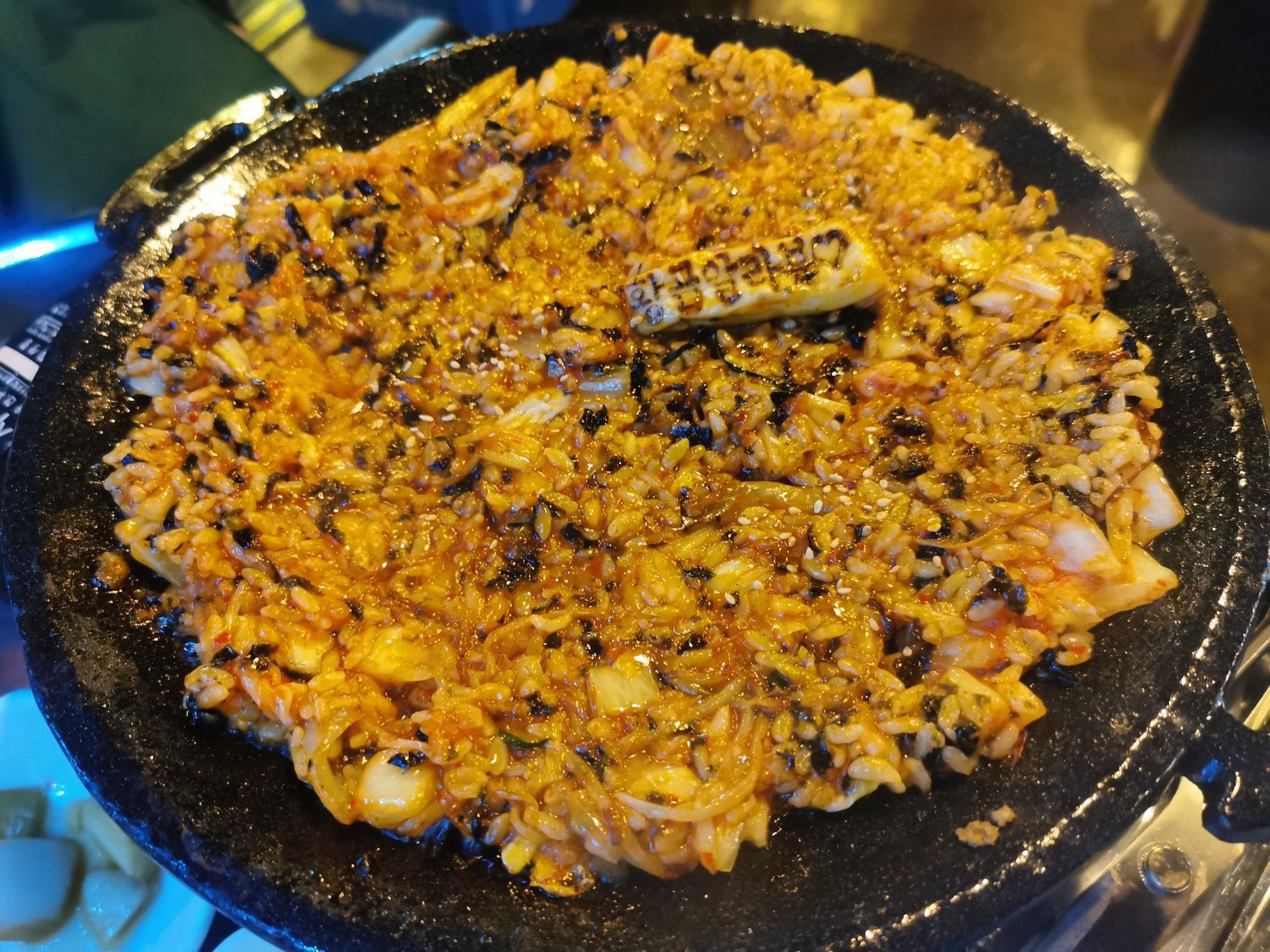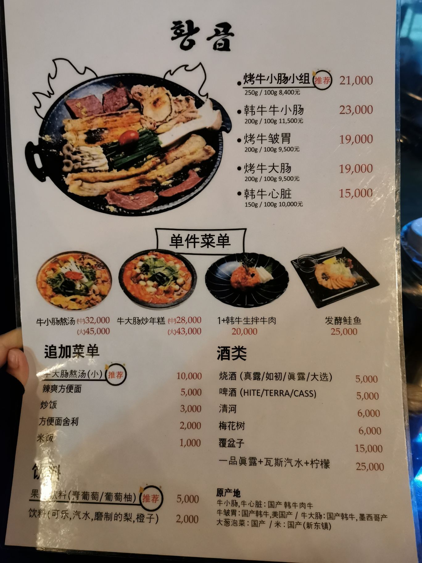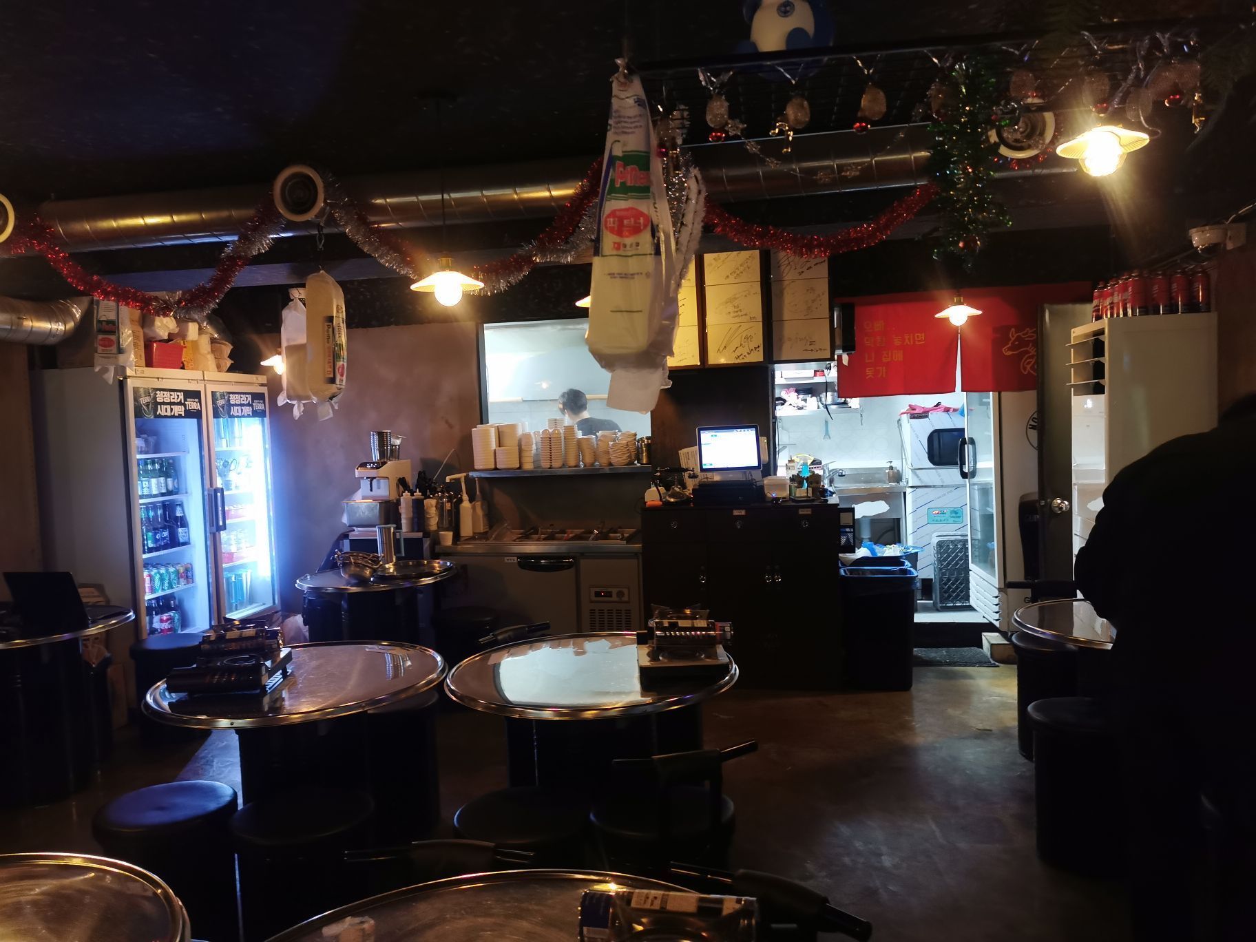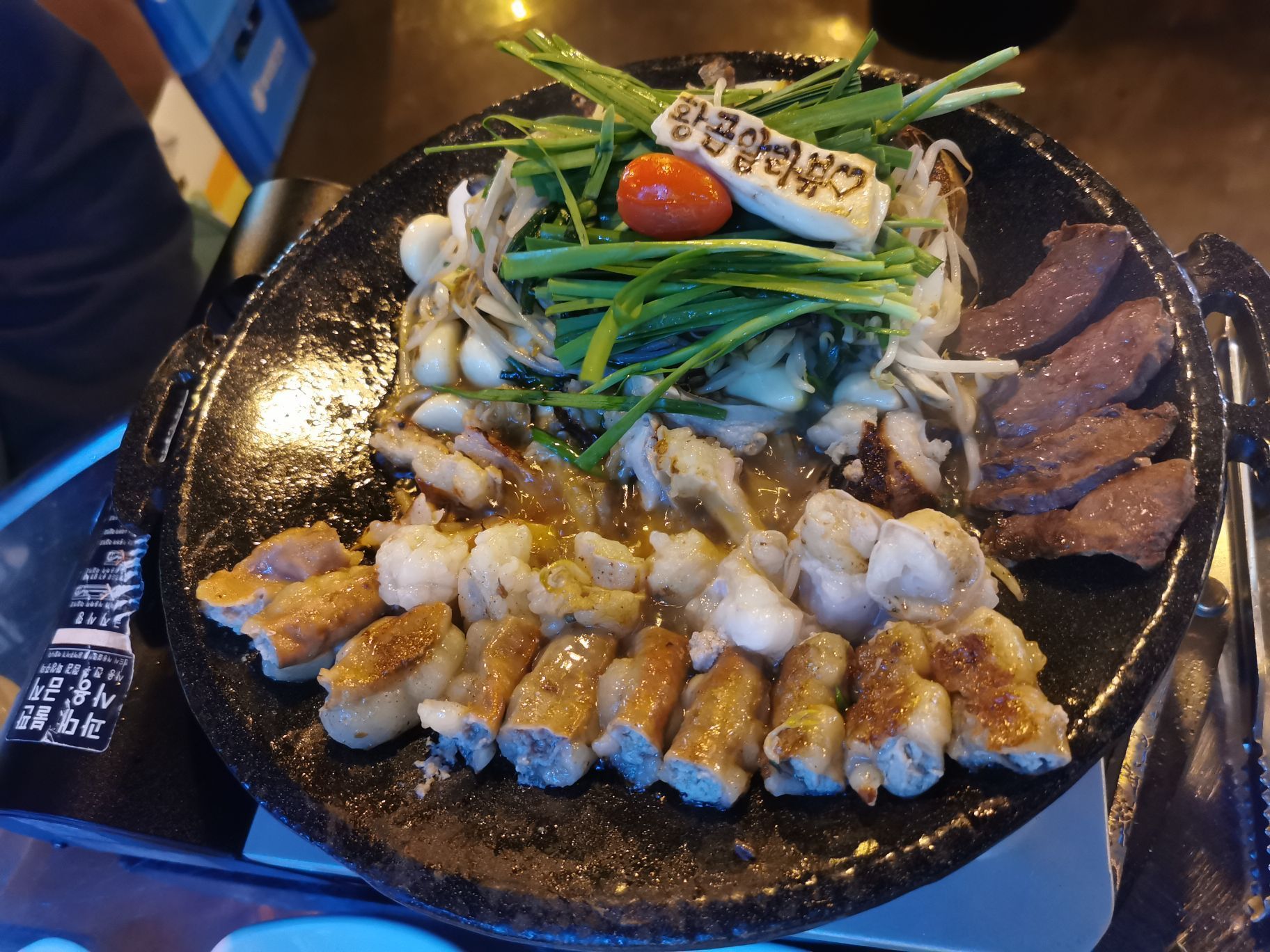 韩国人除了烤肉以外,非常喜欢烤牛肠。我也是来韩国以后喜欢上了这个味道。 弘大这家的牛肠店,韩国比较接地气的店了,经常爆满,我们特意早早去的,虽然店铺不大,圆桶和圆桌的标配是韩国人喜欢的感觉。经常很多人一起吃着牛肠喝着酒非常适合聊天约会。店铺里有中文菜单,我们点了两人份牛小肠,小菜和牛血汤都是送的。牛血汤有一点青辣椒,微辣爽口。牛小肠摆的太好看了,老板帮我们把它剪好又摆好了,还告诉我们先吃哪一部位后吃哪一部位,沾着酱汁更好吃呢!!! 最后一定要来个炒饭,香的不行,我们俩人点了两份炒饭~