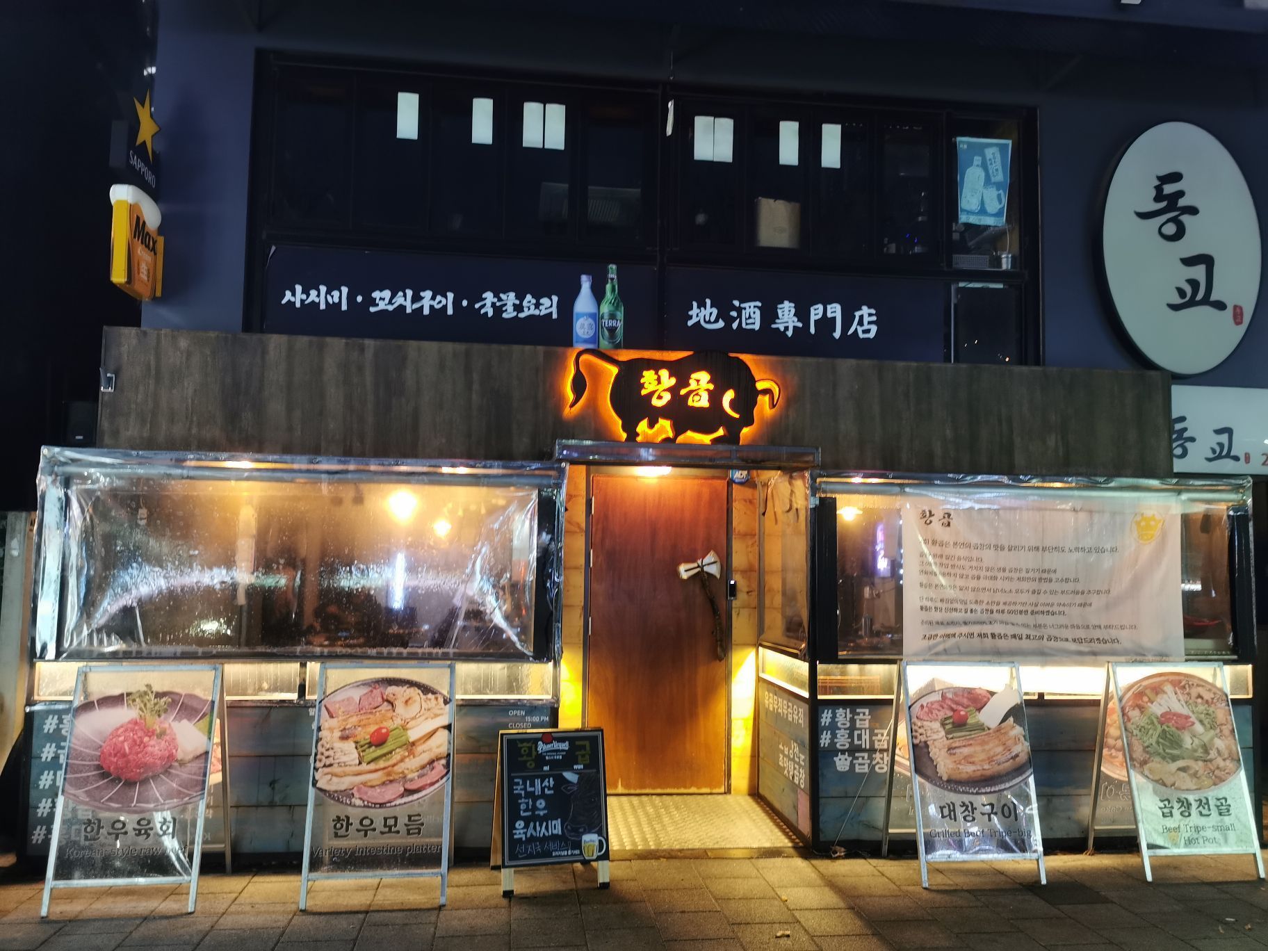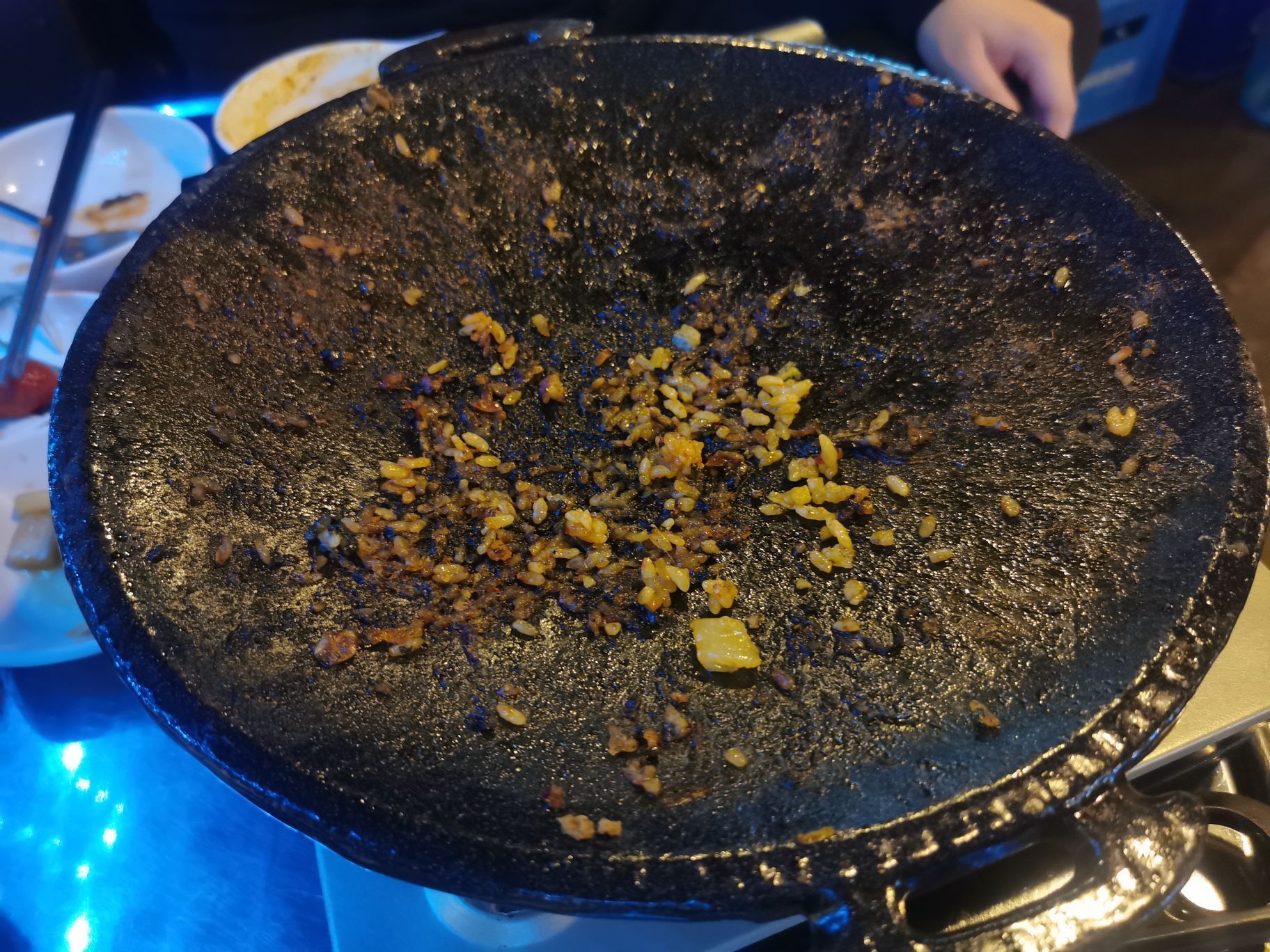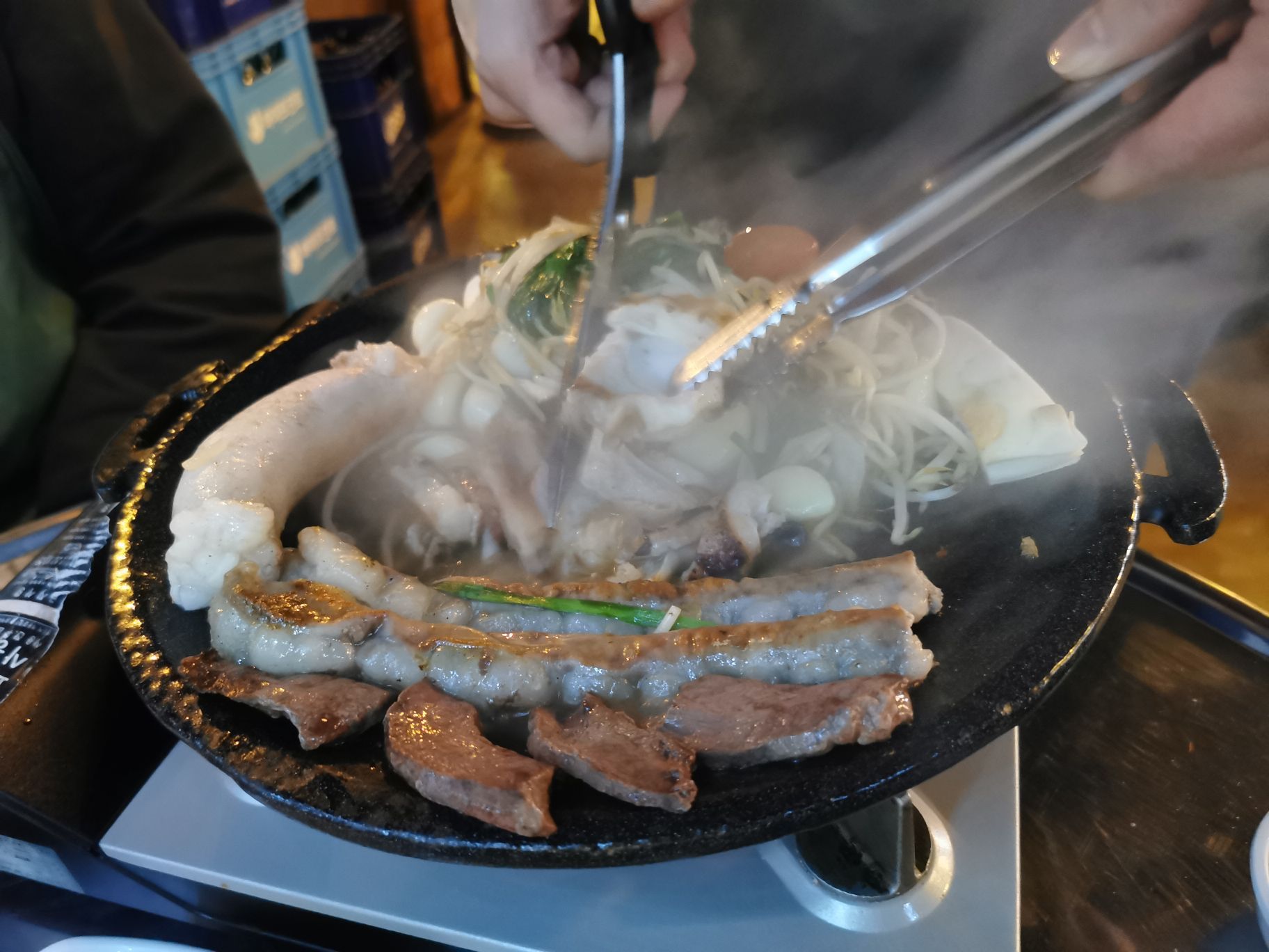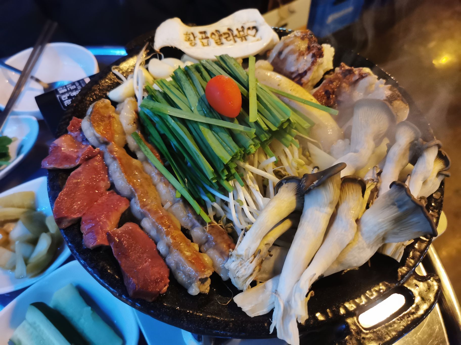 韩国人除了烤肉以外,非常喜欢烤牛肠。我也是来韩国以后喜欢上了这个味道。 弘大这家的牛肠店,韩国比较接地气的店了,经常爆满,我们特意早早去的,虽然店铺不大,圆桶和圆桌的标配是韩国人喜欢的感觉。经常很多人一起吃着牛肠喝着酒非常适合聊天约会。店铺里有中文菜单,我们点了两人份牛小肠,小菜和牛血汤都是送的。牛血汤有一点青辣椒,微辣爽口。牛小肠摆的太好看了,老板帮我们把它剪好又摆好了,还告诉我们先吃哪一部位后吃哪一部位,沾着酱汁更好吃呢!!! 最后一定要来个炒饭,香的不行,我们俩人点了两份炒饭~