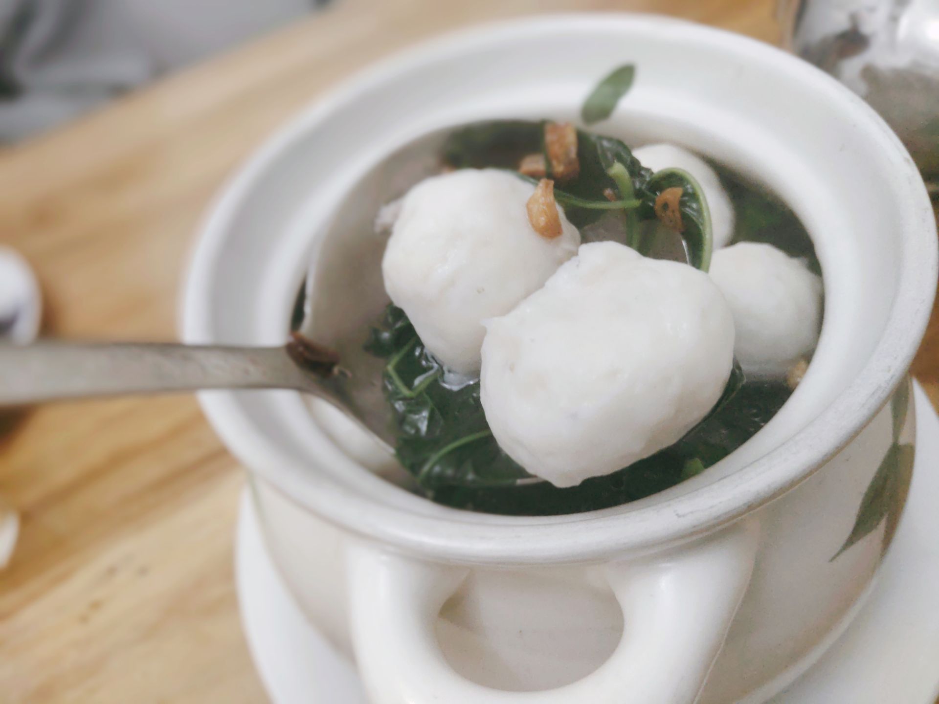 |鲨鱼丸枸杞叶汤^丸子Q弹,从口感上就能吃出是纯手工制作,配合枸杞叶熬汤喝,非常养身