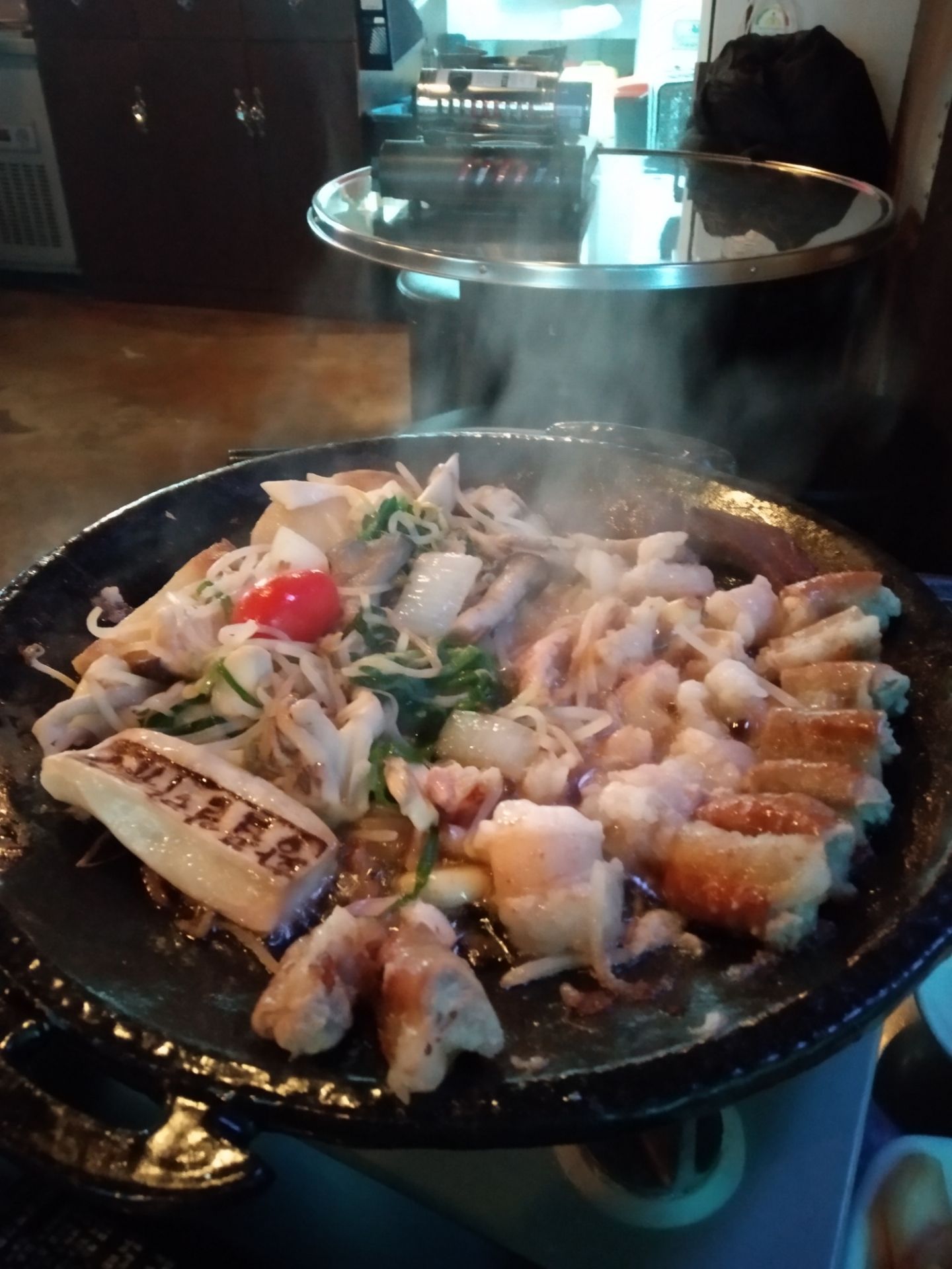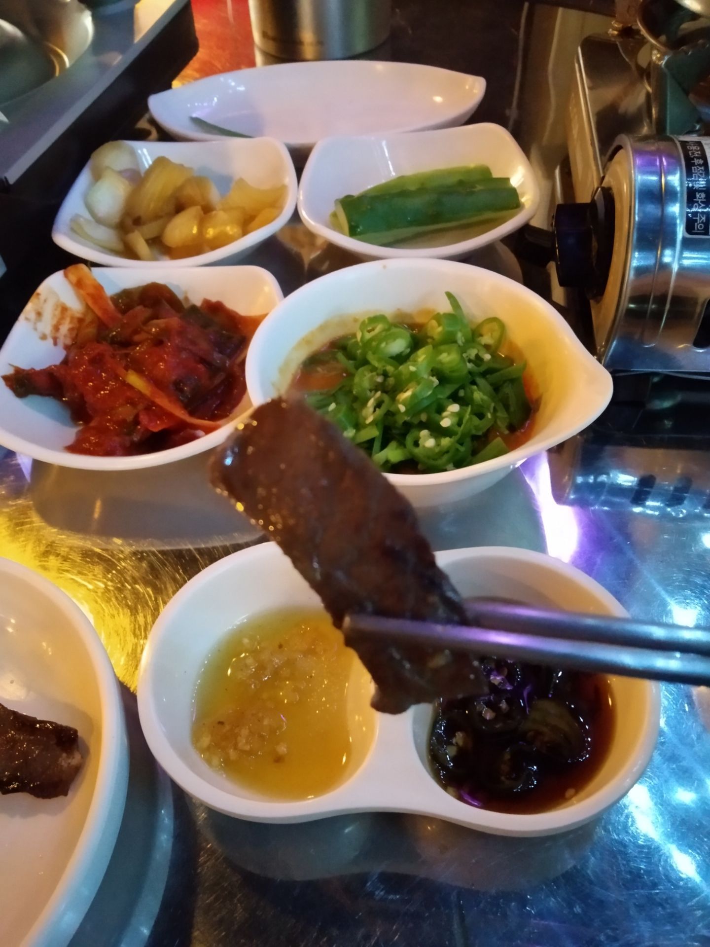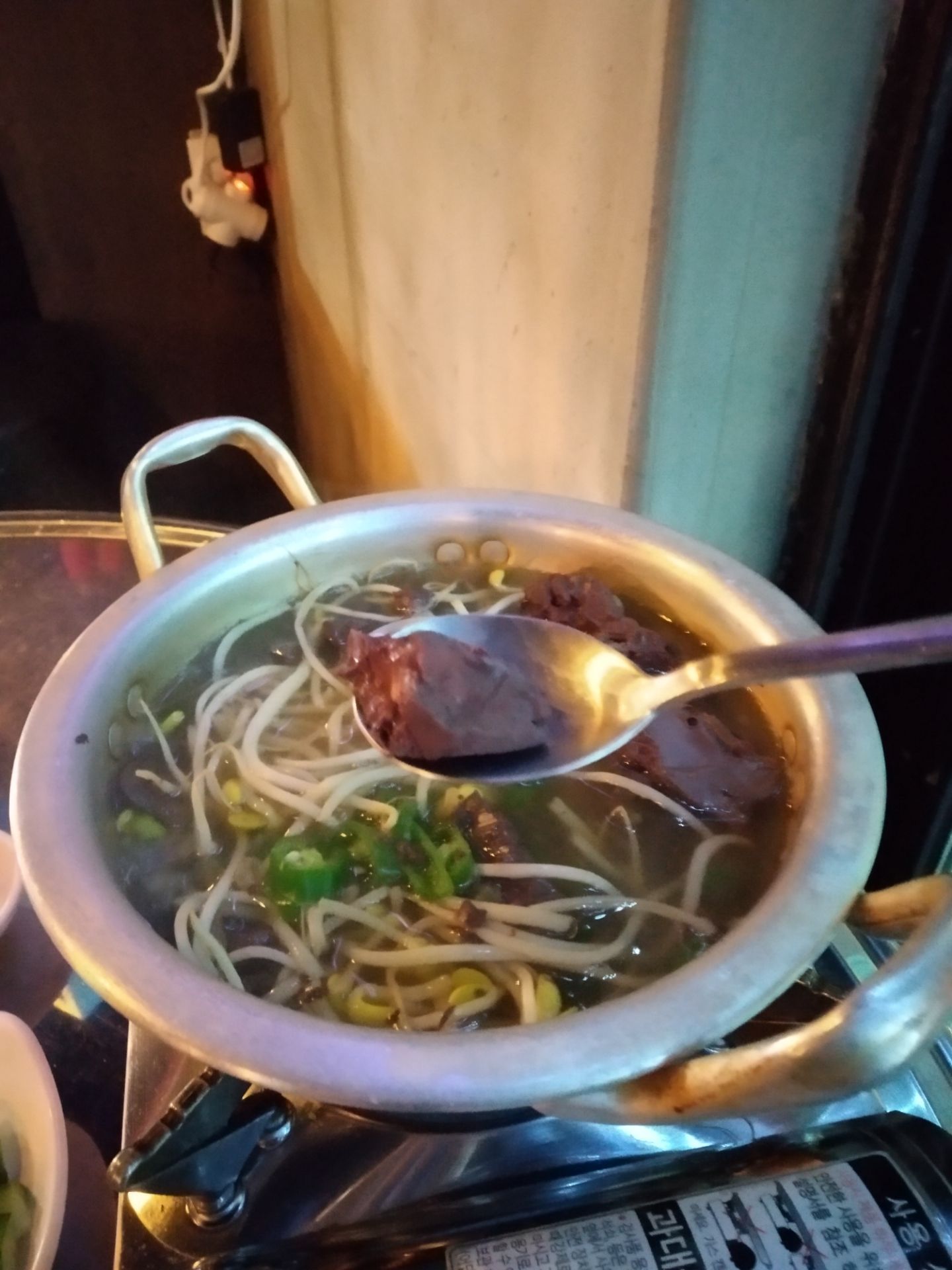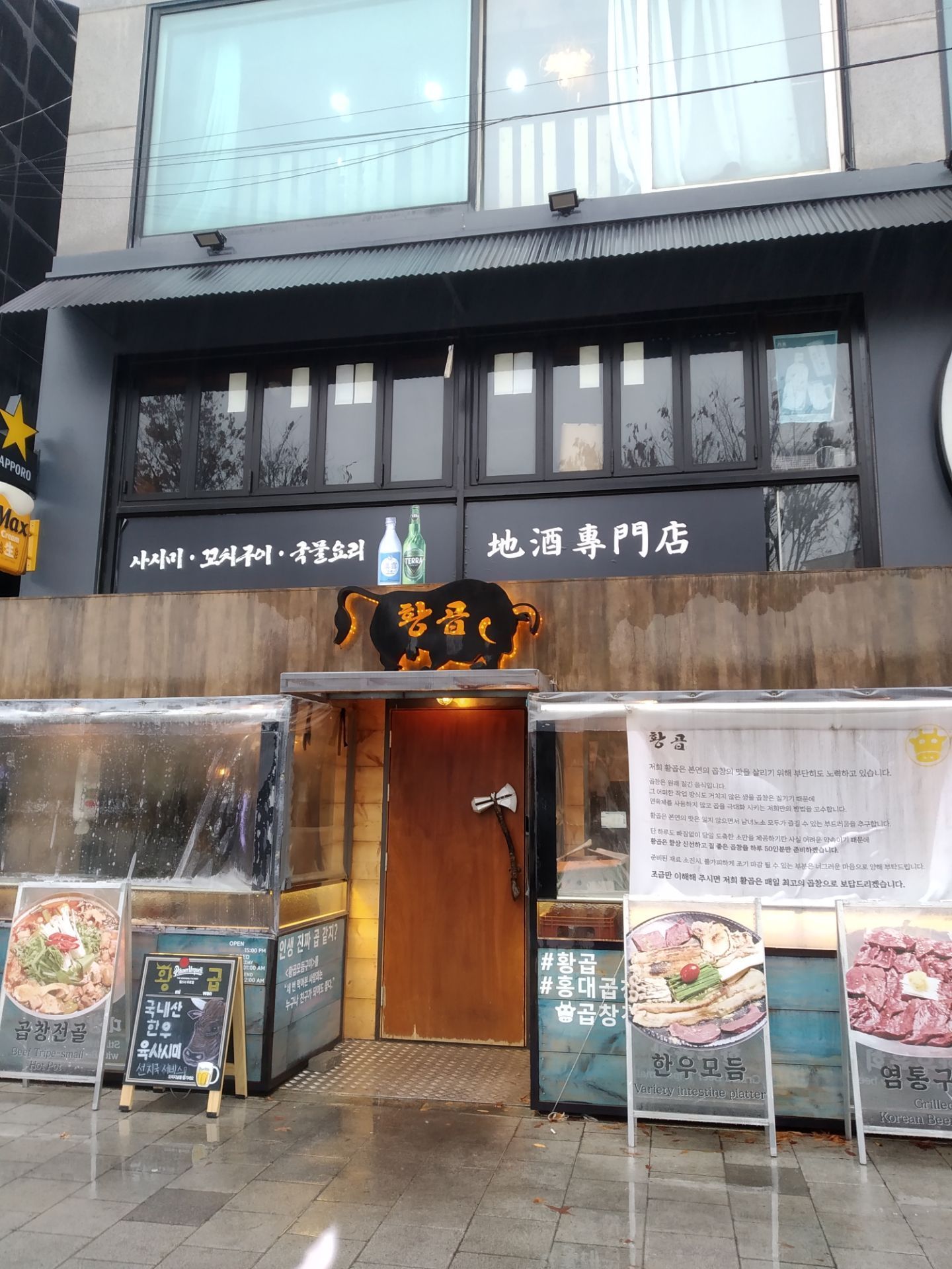 今天又和朋友约了一波烤牛肠,我们点的是烤牛小肠小组,里面有牛心、牛小肠、牛大肠、牛胄胃四个部位,还有韭菜豆芽菌菇土豆等配菜 上来的时候被那个印着店名的杏鲍菇给萌到了~老板好有创意啊!而且老板很贴心地帮我们剪牛肠,自己不用动手就可以享受美味大肠 牛肠被烤得焦黄,吃起来真的好满足,觉得被烤牛肠治愈了 另外我还很喜欢老板送的牛血汤,中国人吃猪血、鸭血比较多,其实牛血也好好吃!牛血比猪血鸭血硬很多,吃起来口感也是很特别的啦! 吃完再逛逛弘大,在附近吃个甜点,完美!