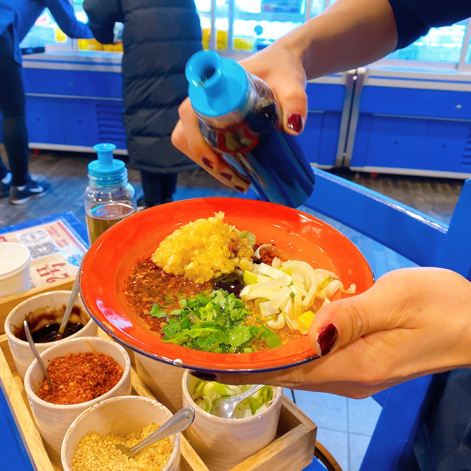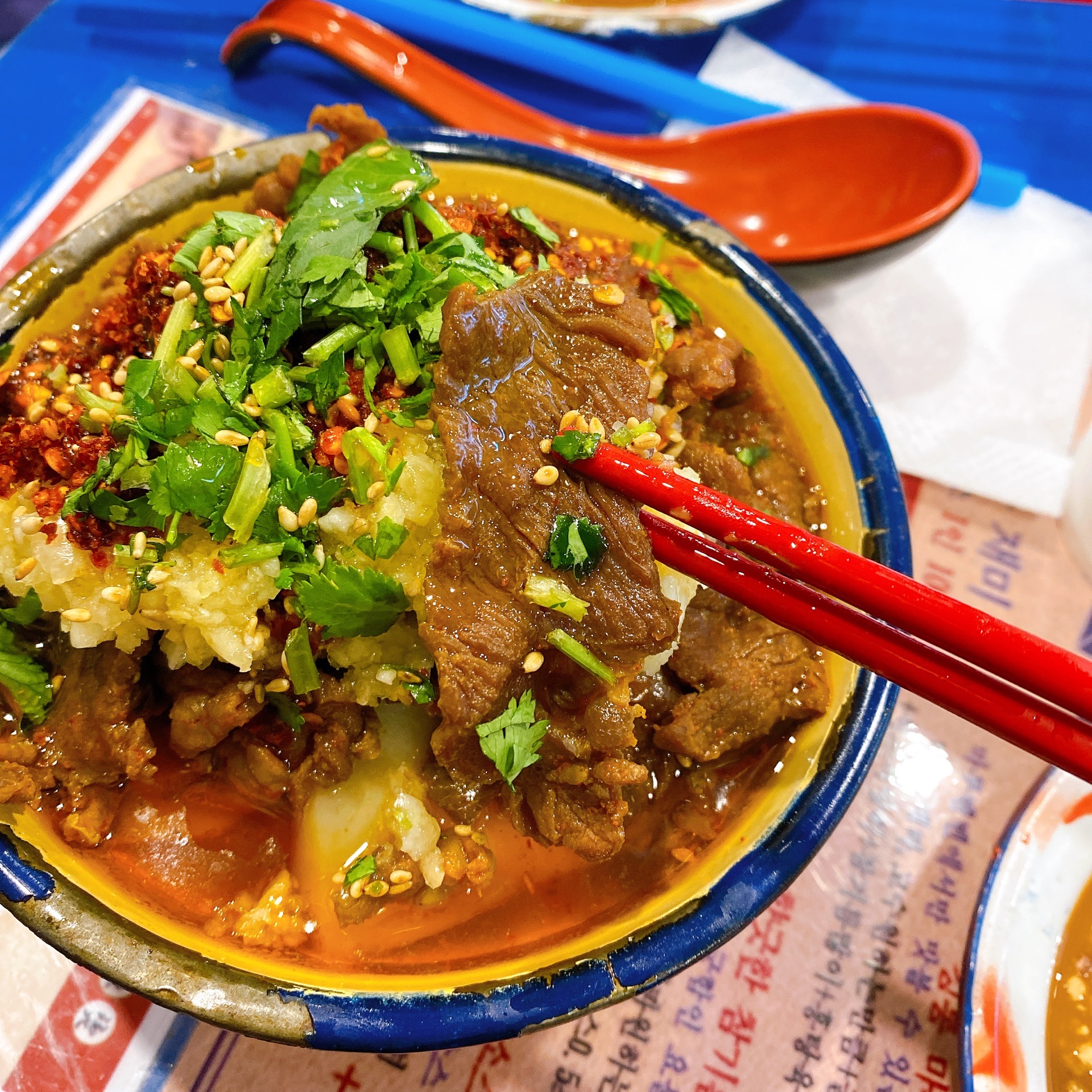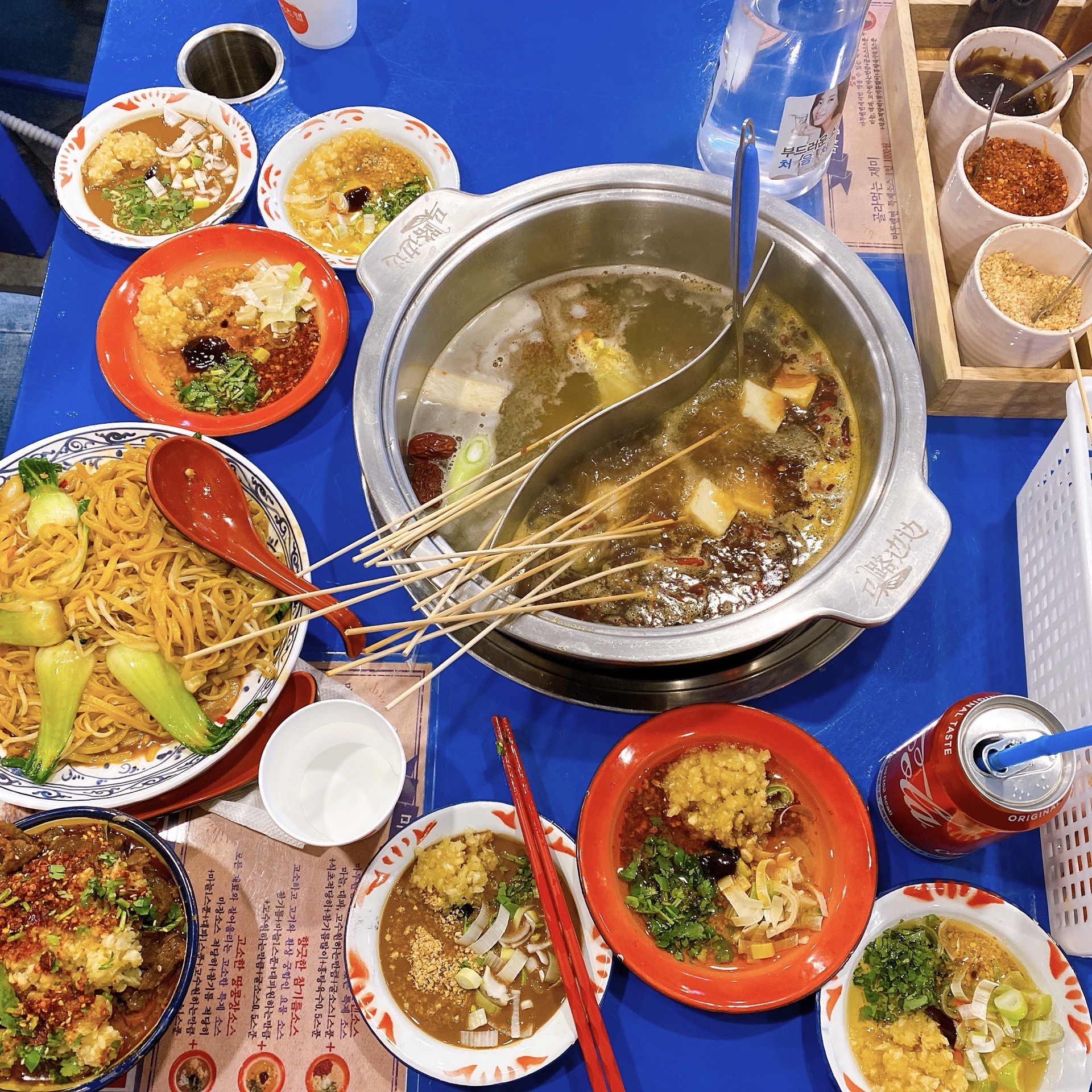 马路边边开到韩国来啦! 一直特别想吃吃看马路边边 但是没时间去南方 一直成了我的心结 偶然间知道明洞居然开了马路边边! 我马上拉着我朋友去吃了 结果太好吃了吧 在韩国第一次吃到这么香的串串锅 一串400韩币不算贵哦 按盘子颜色收费 小姐姐给我和朋友一个人调了3种调料 我最喜欢的就是香菜牛肉串 我一个人差不多能吃了10个 太魔性了 我和朋友两个人吃了30串 又点了个牛肉冒菜 好吃哭了 也不贵 满满一碗牛肉 下面是土豆 被调料浸透的 不喝可乐不行♂️ 又点了个玉米炒面 香油味很浓 很开胃 就是点太多了 两个人的话要适当 千万不能因为便宜点很多