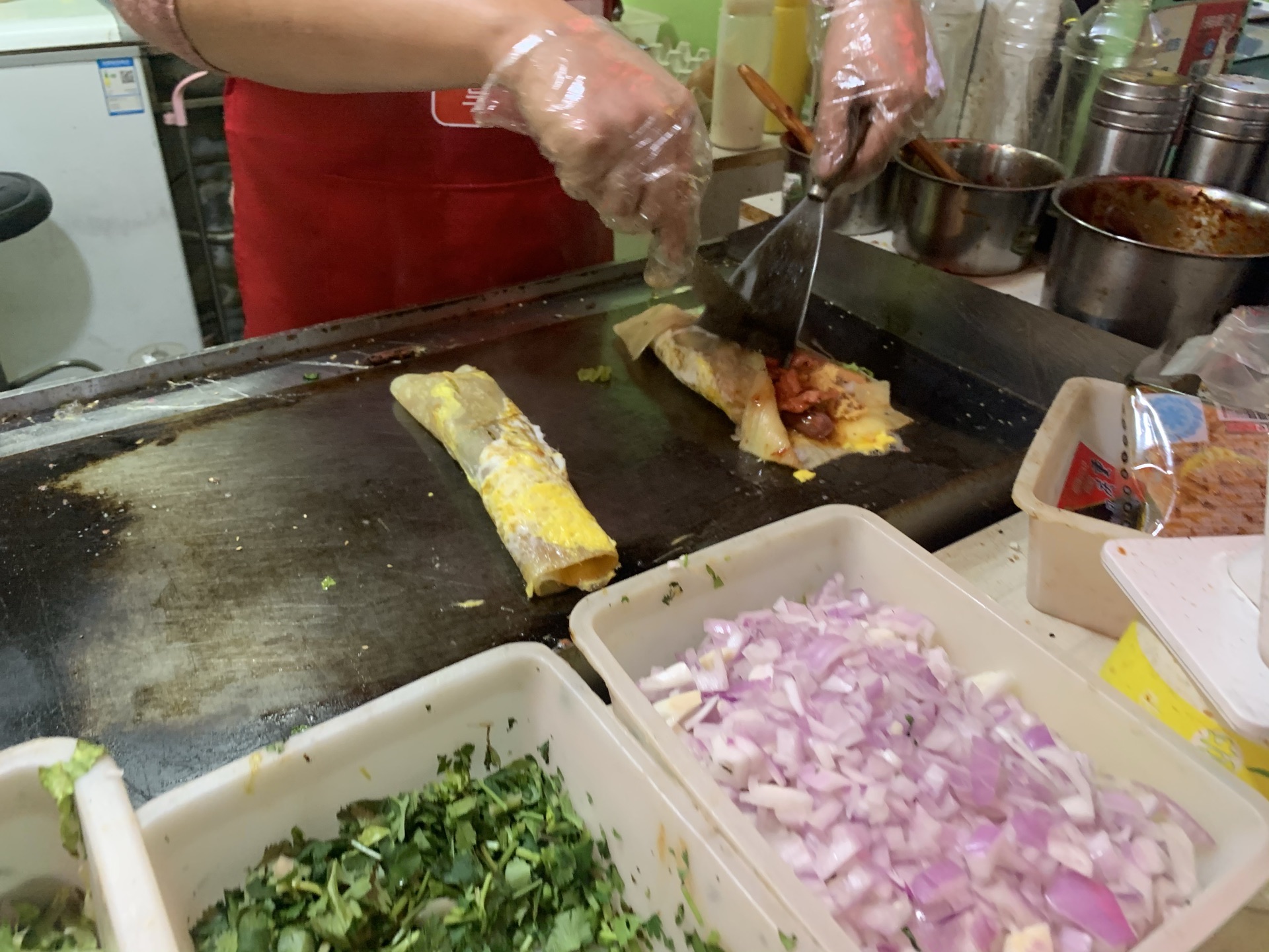 烤冷面有人排队,我也就跟着买了,味道不错,可选的配料很丰富,食材很新鲜,很好吃