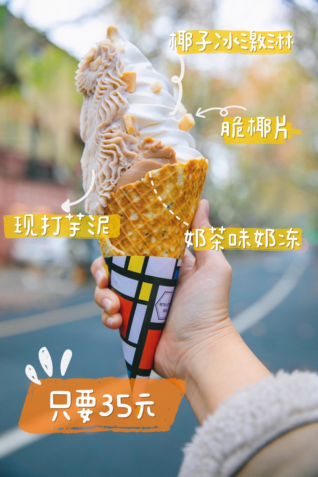 魔都巨无霸芋泥冰激凌‼️35元2个人吃到撑 姐妹们快看看上海这家神仙冰激凌啊!奶茶冰激凌➕椰子冰激凌➕芋泥➕芋圆➕奶冻➕脆椰片,这是什么华丽丽的搭配哦,只卖35元‼️ 冰激凌名为【珍珠奶茶冰激凌巨无霸】,个头真的很大,举起来都觉得沉!刚拿到手只能见到满满的芋泥+2种冰激凌,往下挖到中间是滑嫩嫩的椰子奶冻,再往下是超弹牙的芋圆,配料无敌丰富!要重点夸的荔浦芋头打成的芋泥,每一份都是现做的可以选甜度,绵密柔润散发着芋头清香,建议选微糖,真的不甜~(无糖可能就完全没味道哈哈) 这个冰激凌不管是分量还是味道都真的太了,我和小伙伴2个人愣是没吃完,超超超满足!店里的【黑陨石蛋黄酥】也相当给力,蛋黄酥还能加热,里面是Q糯麻薯➕咸蛋黄➕红豆➕肉松的组合,还能买团购打7.2折~ 【椰莎悦甜】 南昌路87号 10:30-21:00