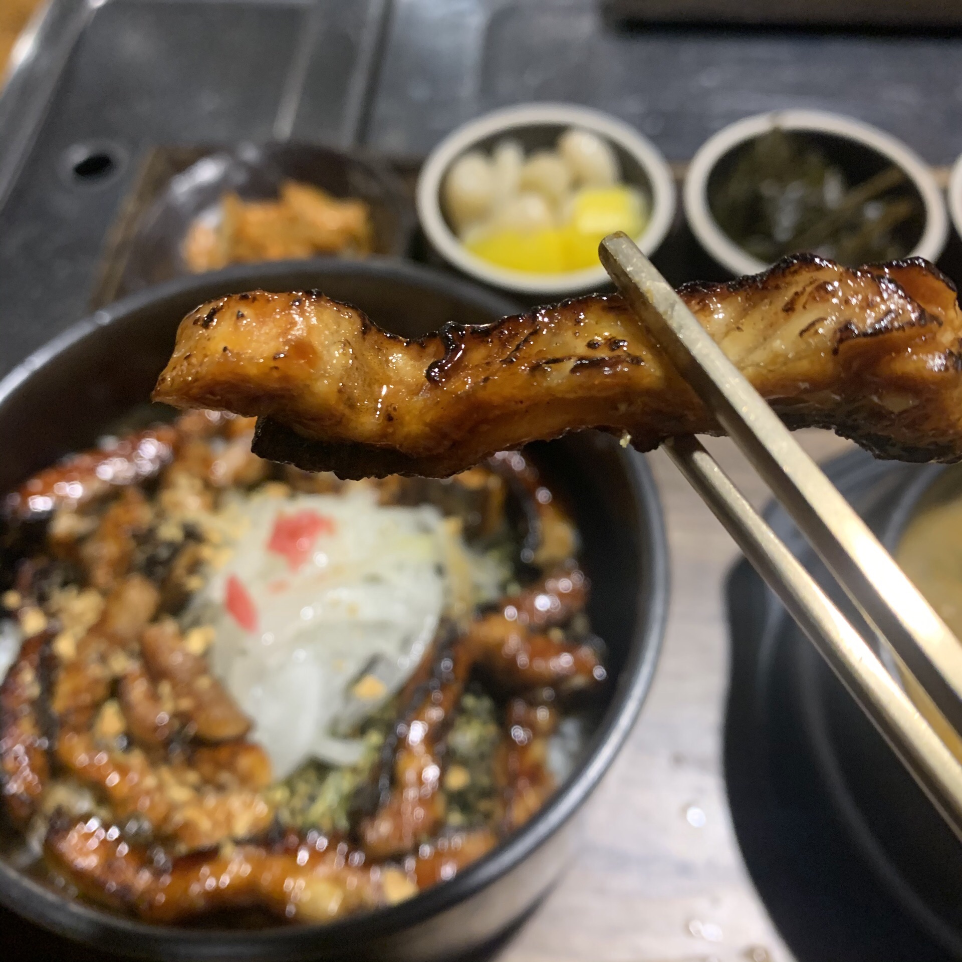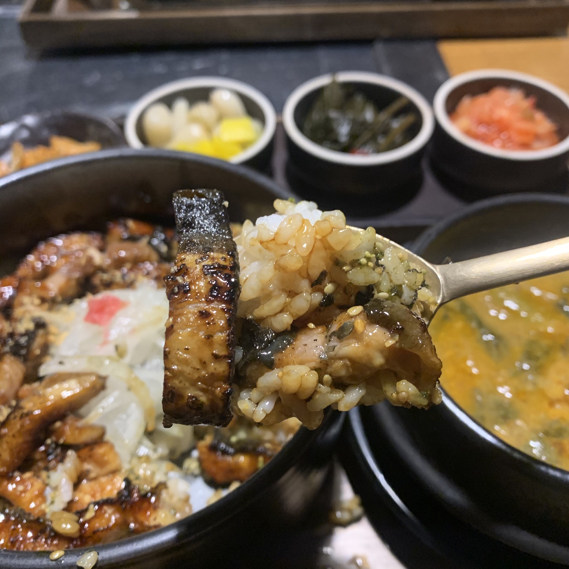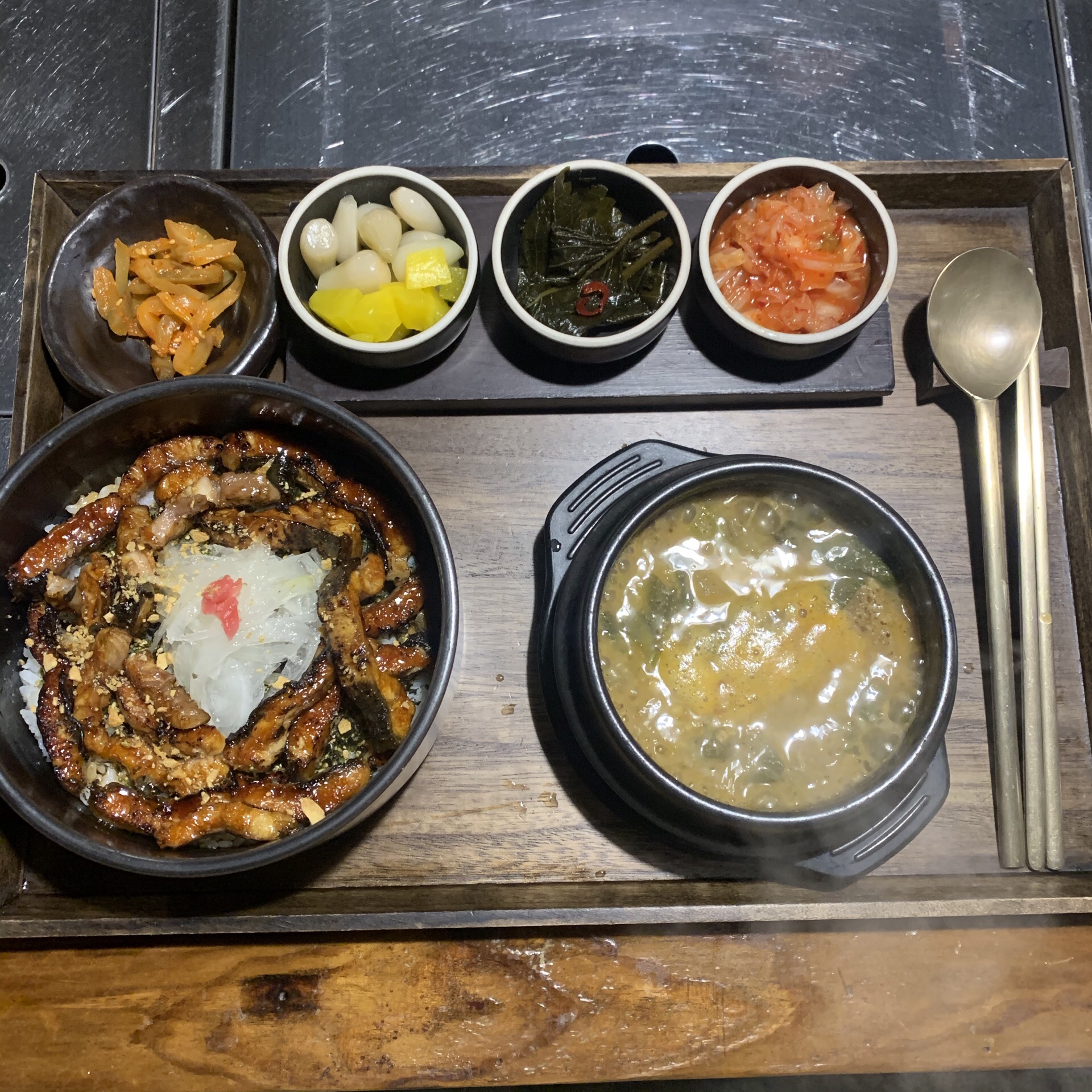 店里有烤鳗鱼和鳗鱼盖饭 韩国的鳗鱼比较贵 推荐可以点鳗鱼盖饭定食 有一个鳗鱼盖饭,一个鳗鱼汤,还有一碗米饭和各种小菜 一个人量非常足了 鳗鱼非常肥美 烤得刚刚好 一点也不腥 肉质鲜美 还有一丝丝的甜味 配着小菜和鳗鱼汤一起吃 鳗鱼汤味道也很浓郁 又营养又美味 非常不错