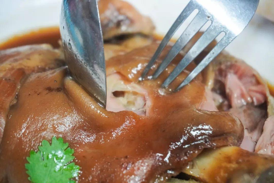 他们家以卖猪脚饭闻名,每天都排长队。肘子炖得稀烂,拿叉子轻轻一拨,骨头和皮肉就分离开来。蘸上汤汁,送进嘴里轻轻一抿,胶质在口腔化开。