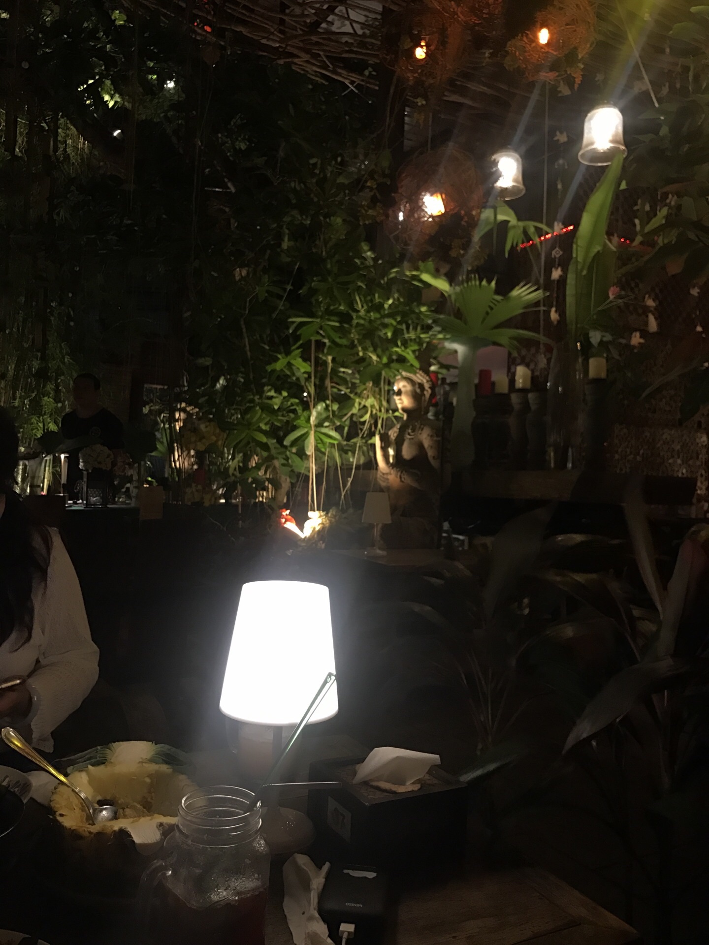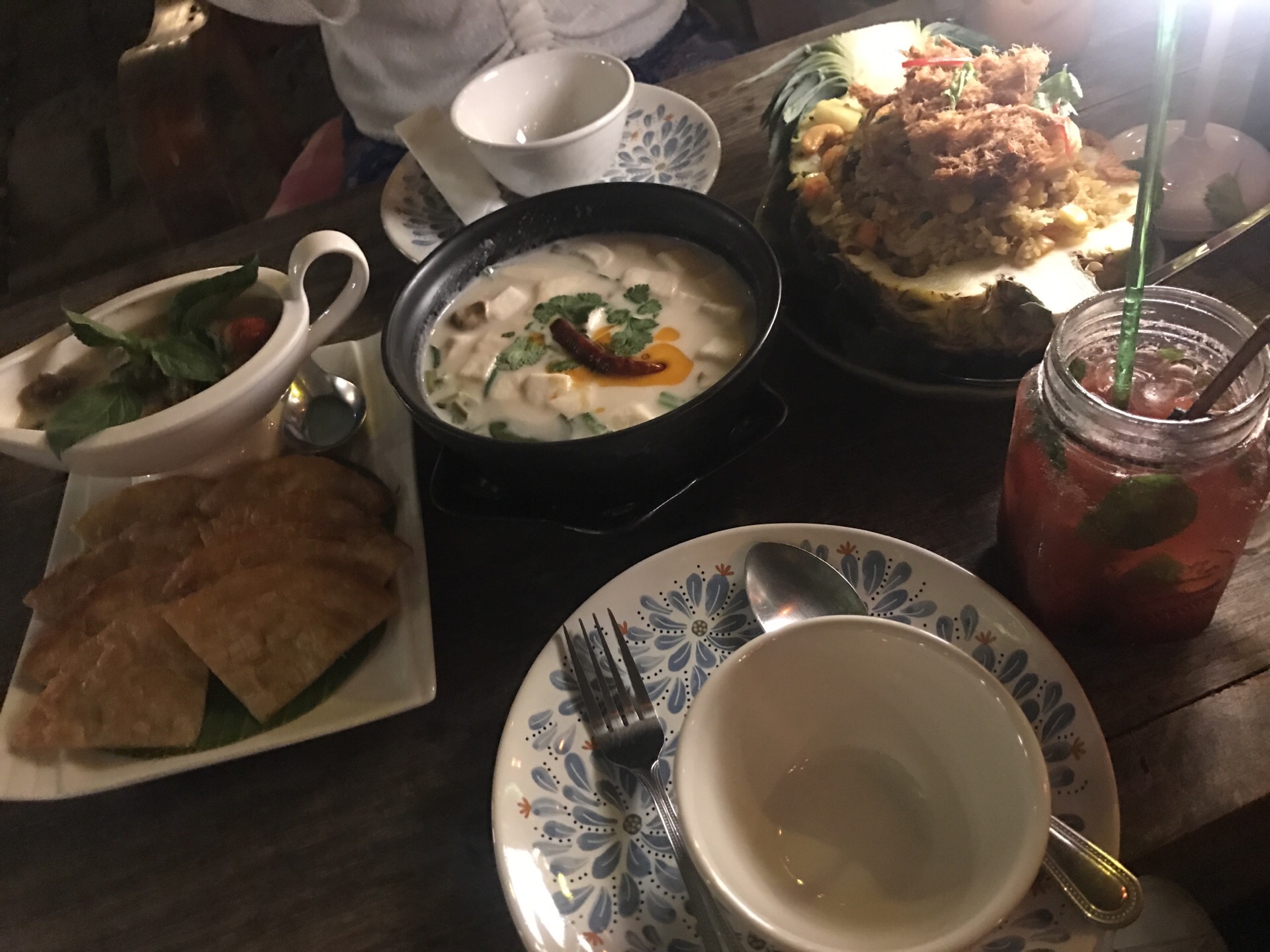 我非常满意这家店。 【口味】点了椰汁鸡汤和菠萝炒饭,绿咖喱,分量足,非常好吃。饮品是点了泰式奶茶和莫吉托,嗯哼,我喜欢 【环境】环境不要太有调调哦!外面看着像古庙,进去后,漫天星,放着舒缓的音乐,1月的清迈,吹个小风,喝个小酒,听着音乐,太舒服了 【服务】英文交流,对我来说没有问题,店里西方老外居多。人均一百➕吧