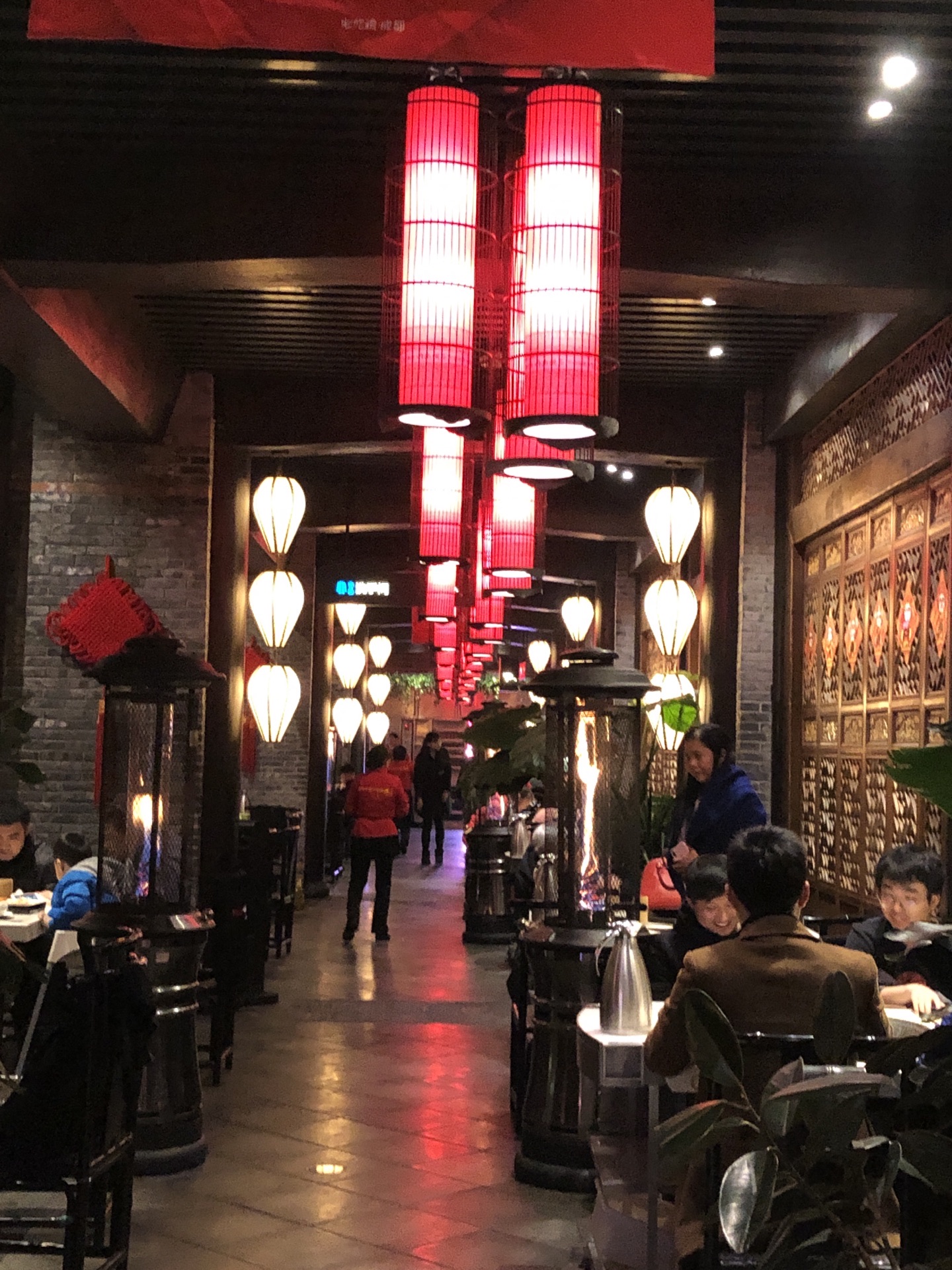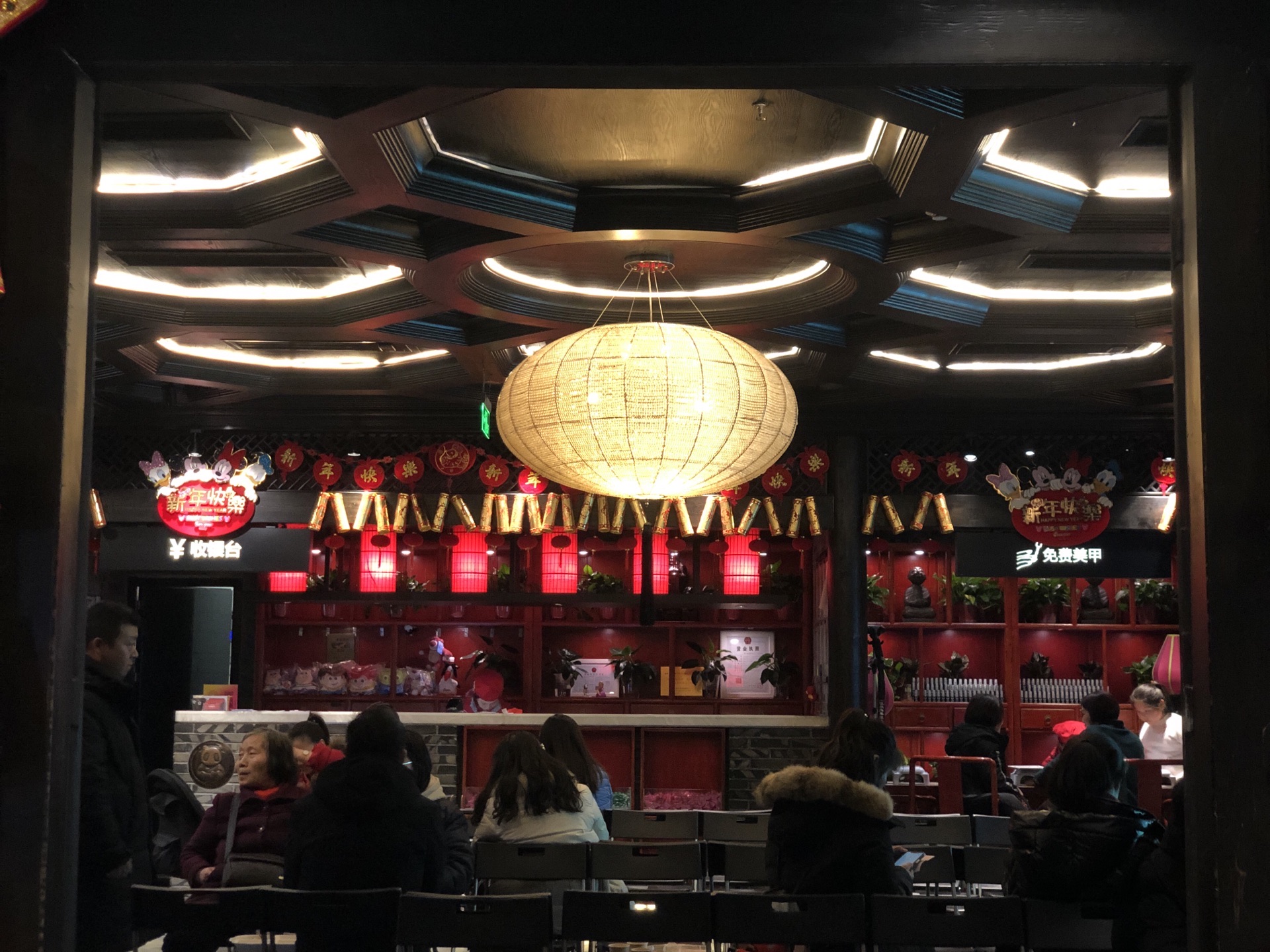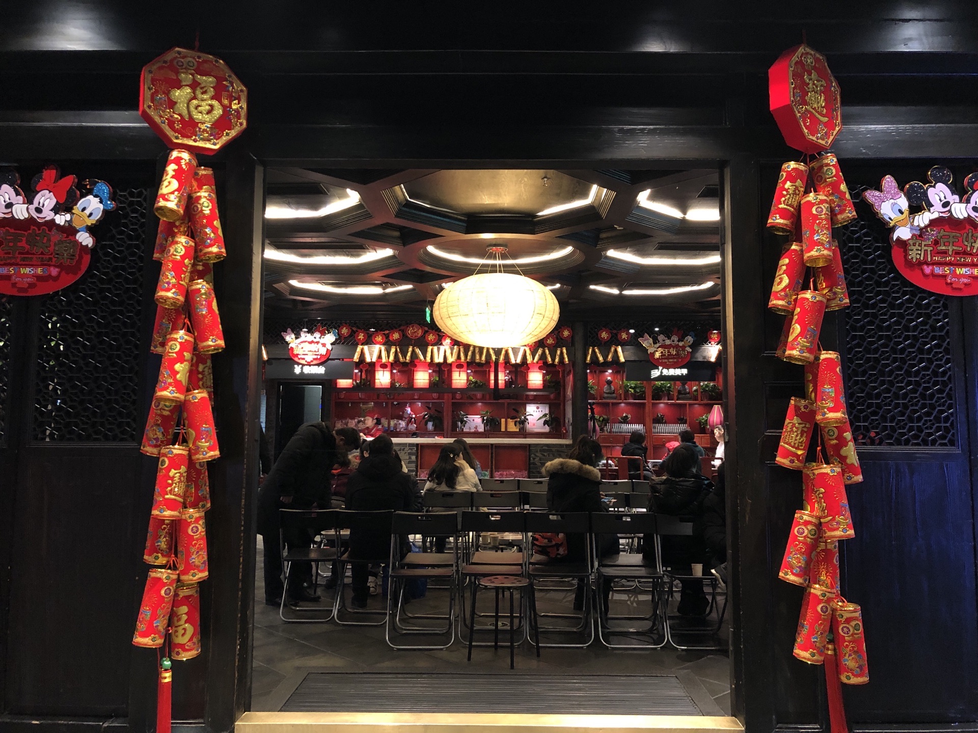 火锅店可能还留了一些临时的桌子,但是非常少,今天晚上肯定没有了。要过年了装饰的也非常有年味