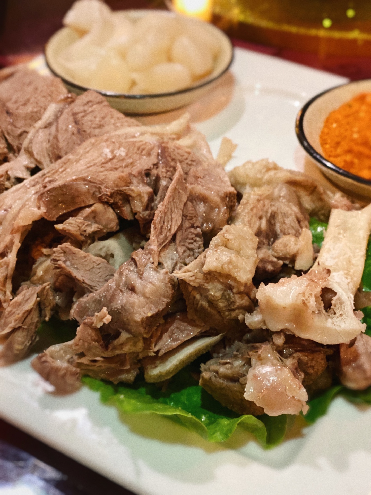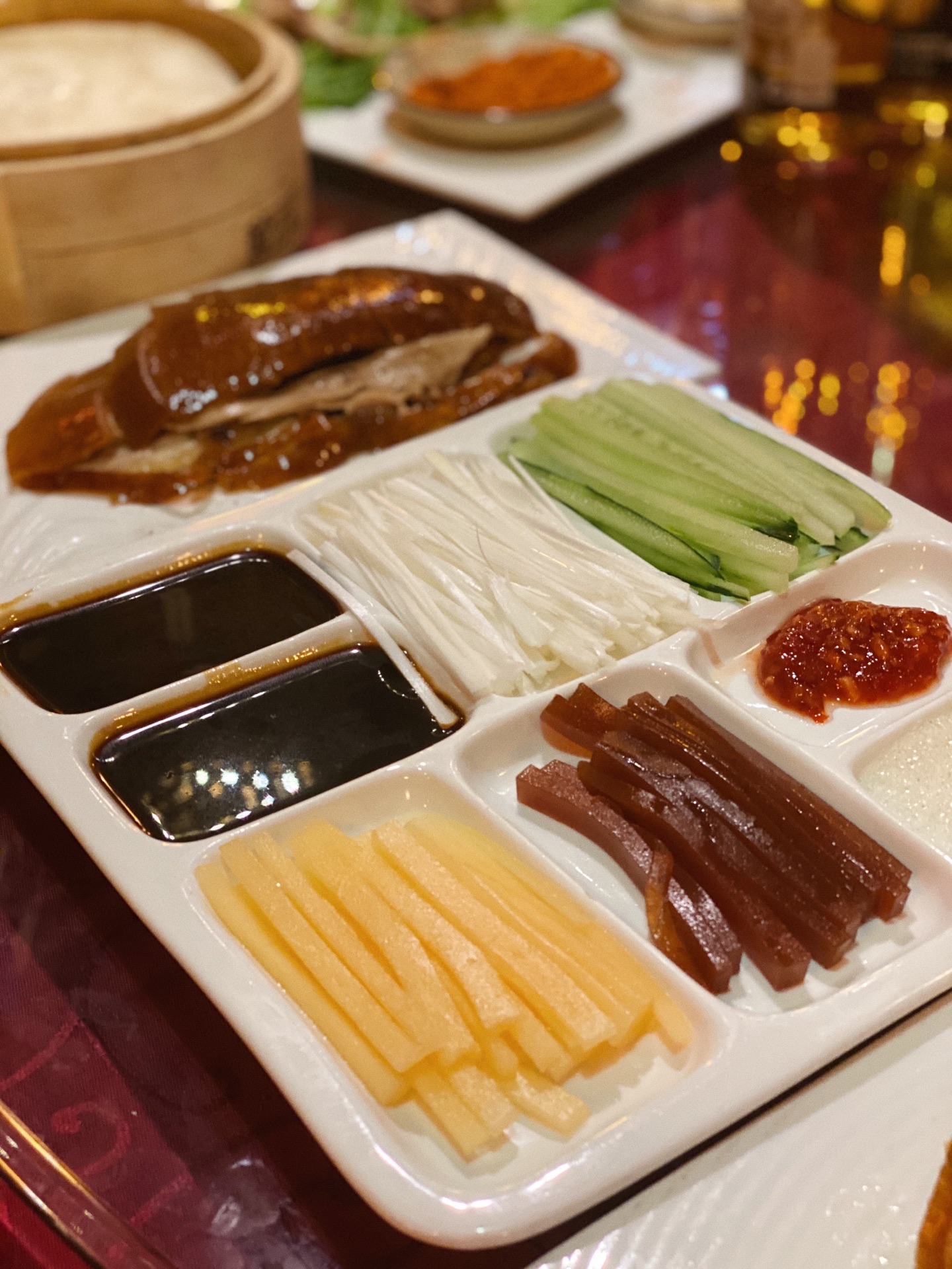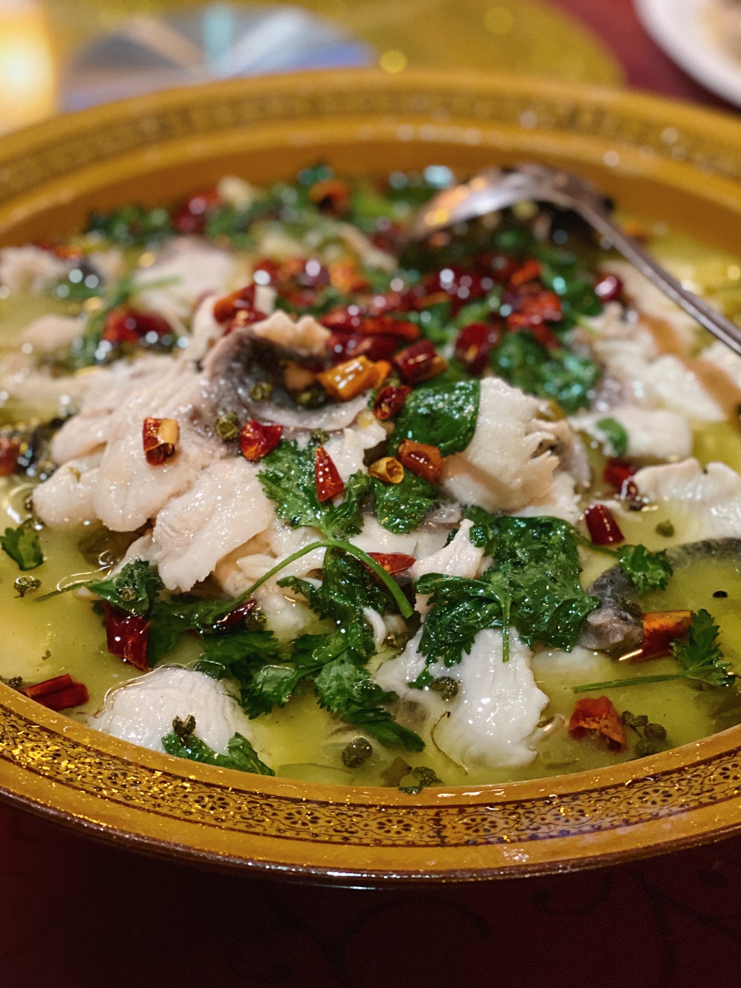 部门聚餐来的 其实已经是第二次来 第一次坐的蒙古包 当时不管味道还是服务还是环境都觉得满意 可以给五星的那种 但这次 可能因为年底尾牙的原因 座位也比较紧缺 坐的地方冷风吹得都要老寒腿 菜品也都较之前退步 有些菜明明第一次很惊艳 这次就只有感觉尚可了 先从一鱼多吃说起 店内主打千岛湖有机鱼 楼下小泳池养了好多鱼 超大条 可以鱼头煮汤 鱼身水煮 鱼尾炭烤 味道是都不错 有保持水准 特别鱼汤 又鲜又热乎 羊腿则觉得腻 因为不是烤的 肉又多 真的吃一块就吃不下第二块 北京烤鸭之前吃觉得超棒 但这次也是感觉一般 不过烤鸭架还能爆炒 又算一菜二吃啦 酱猪肉觉得卤料包的味道过重了 ️ 这次很幸运 车能停在店门前 不然江头路边市政停车位2小时就20+ 或者可以停开明电影院 每小时5元