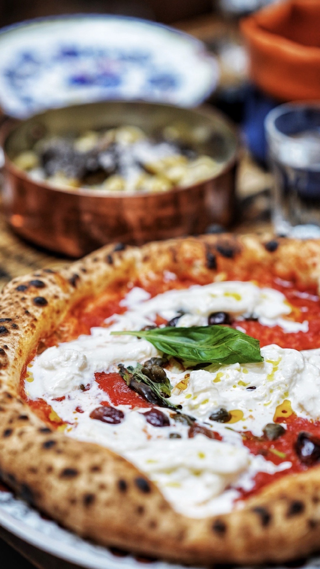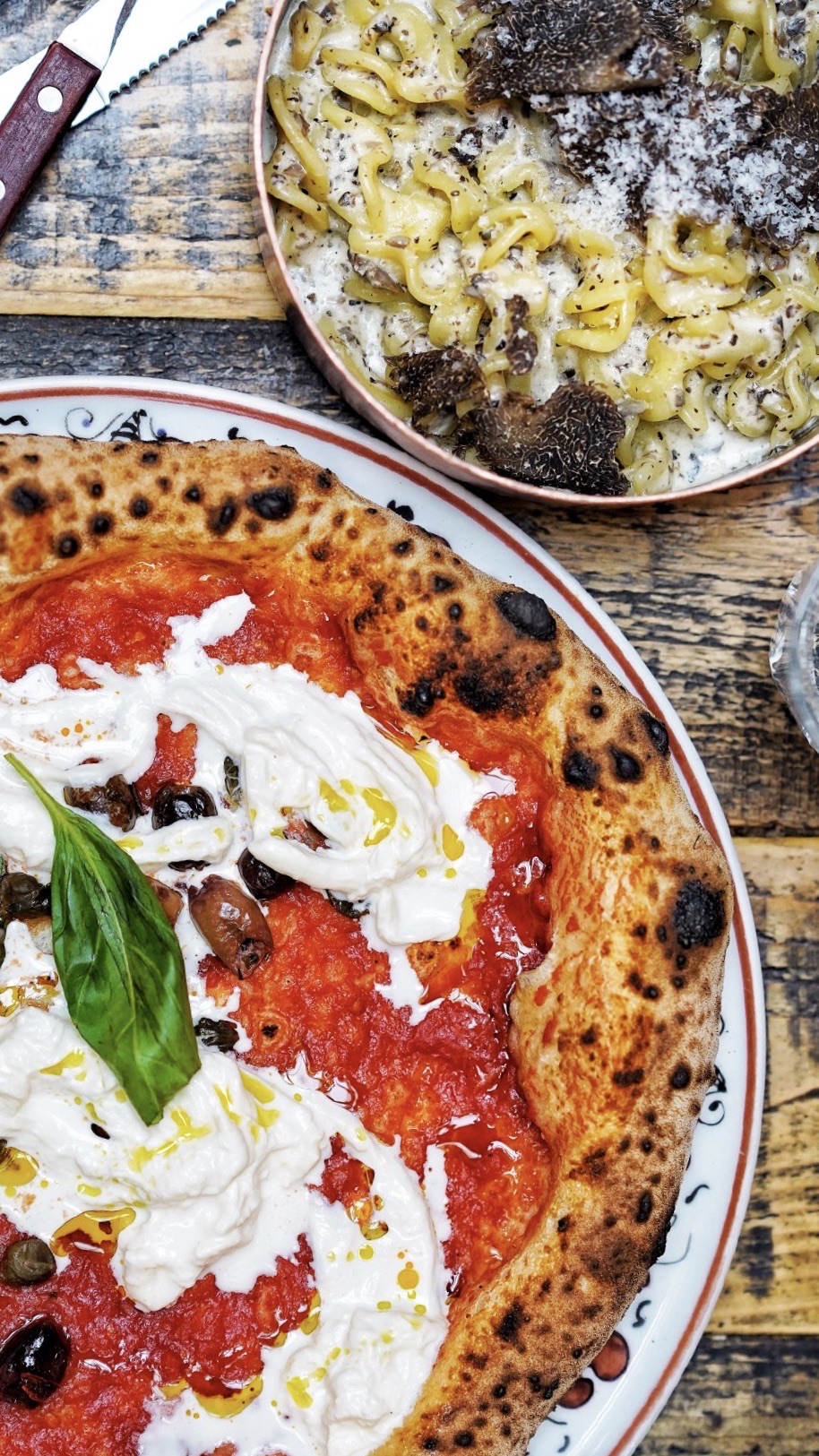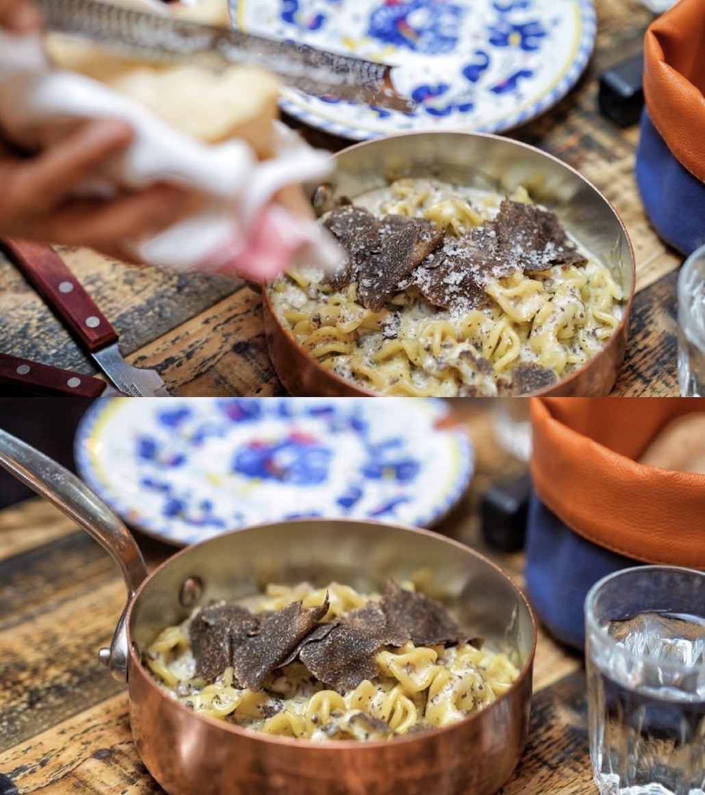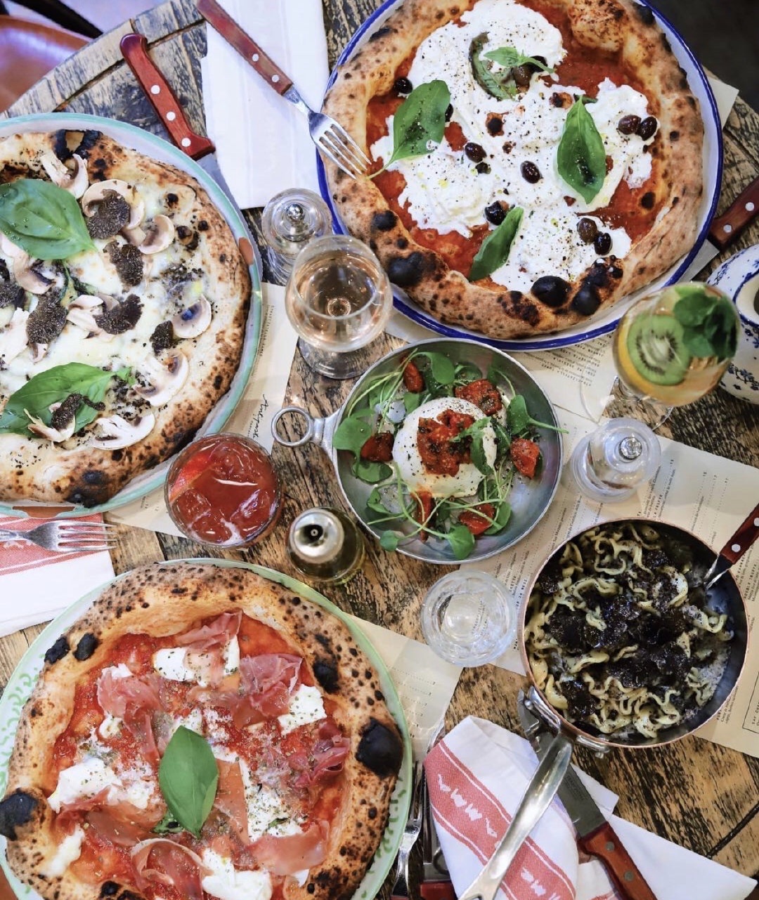 食物味道、团队颜值、餐厅环境,深刻印象。服务生的T恤是特制的,每人专属肖像T恤。 我们选择坐在了开放式厨房旁边,能够更加清楚的看见厨房的操作,听着里面传来一声声的意大利语,完全感觉不到自己在巴黎了。 另外,他们家菜量有一点大,披萨一份两个人吃刚好。 【生牛肉夏季沙拉】本地生牛肉切火腿薄片配当季甜油桃、苦苣和法棍薄脆在清新甜美味道中增加了爽脆口感,新鲜的组合,奇妙的味道。 【那不勒斯披萨】纯粹意产的圣玛扎诺西红柿酱配上马苏里拉水牛奶酪,那不勒斯作为意大利披萨的圣地,也是没什么必要再清晰描述了。简单纯粹无杂味,好食材的呈现总是异常的坦率直接。 【黑松露意大利面】除了黑松露还是黑松露,几米开外的距离已经要急于宣布它来了。每一口都是满满的黑松露香气,值得一提的是面体的熟度,刚刚好保持了口感劲道和硬芯,曲折的宽面更多的吸满黑松露香气。