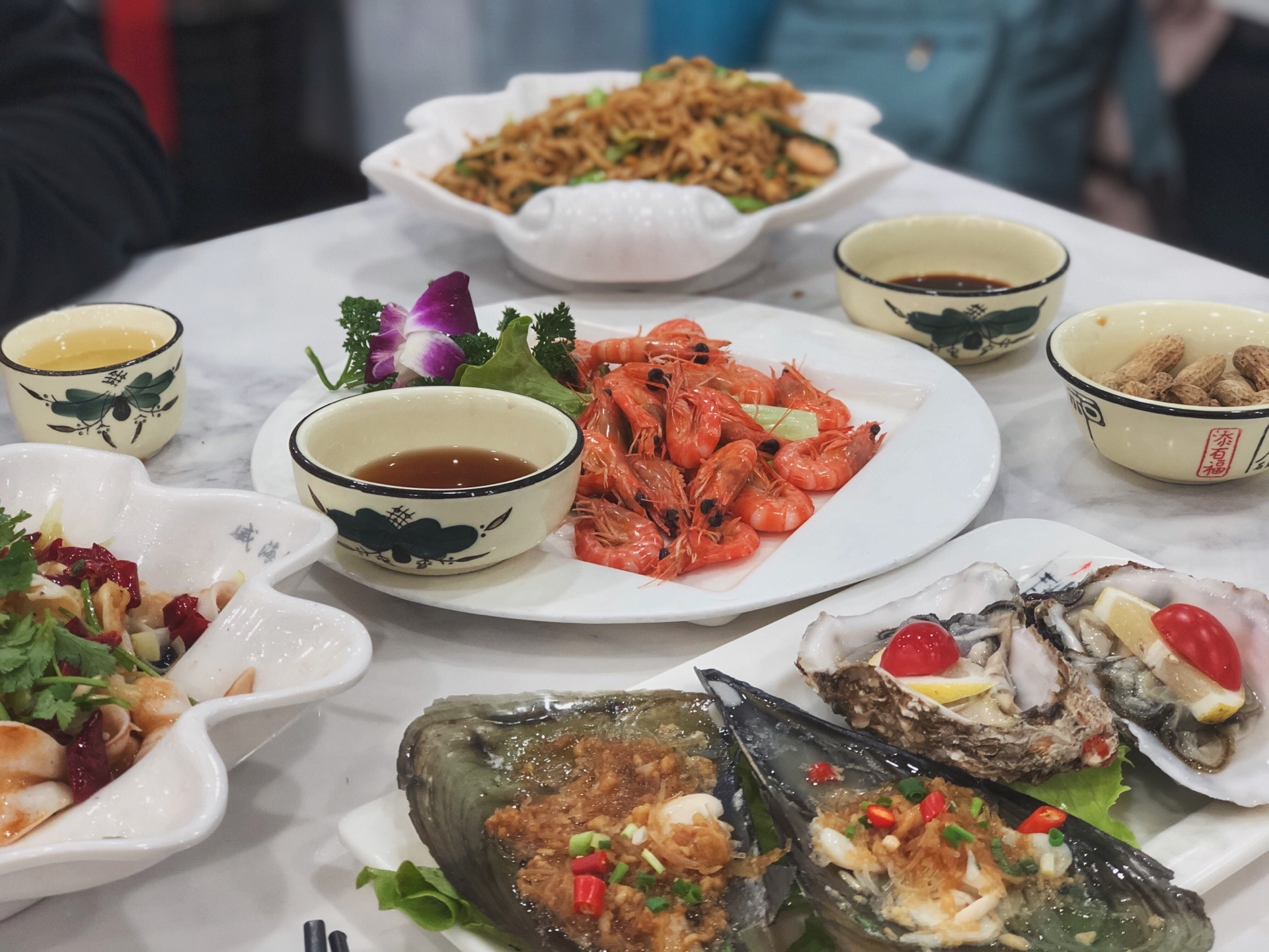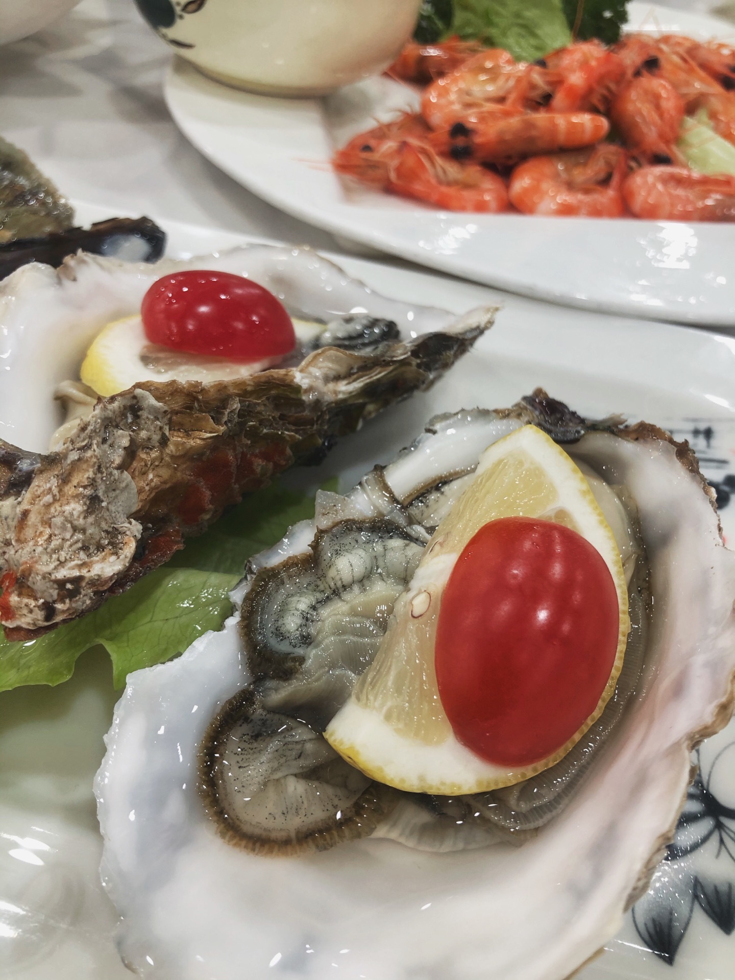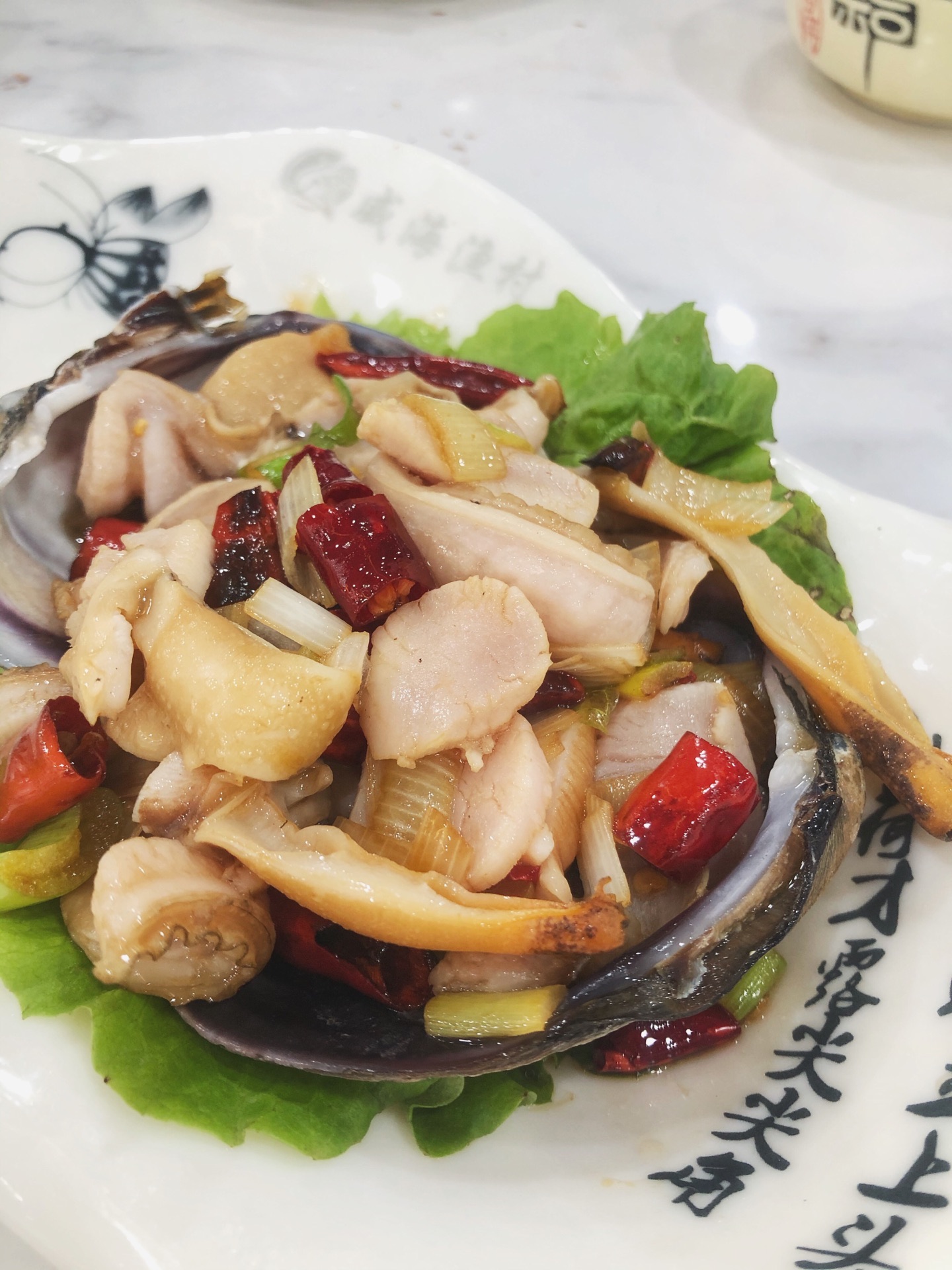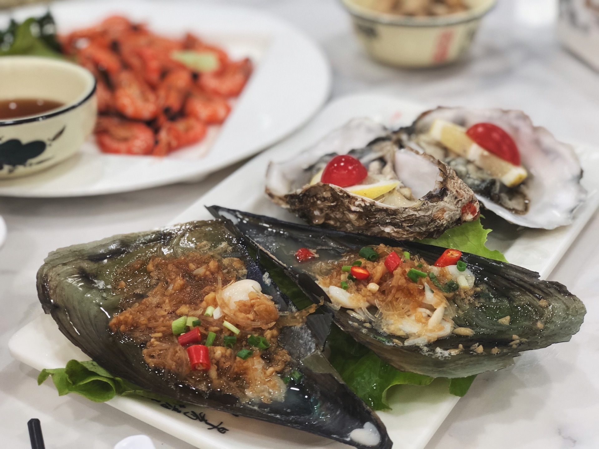 黄兴路附近很火爆的一家平价小海鲜店, 如果不提前预定的话,就要等位咯… 老板招呼很热情,等了一桌就轮到我们了, 点了一些招牌菜,都挺不错… 斑节虾按斤来算,两个人半斤,上菜很快, 白灼的做法展现食材原味,虾肉很有弹性。 葱油天鹅贝,两只起卖,很入味,喜欢! 还有鸟贝,可以选白灼或者葱油的做法, 选了葱油,里面还加了莴笋,下次试试白灼的… 生蚝刺身,生蚝个头又大,挤点柠檬汁,