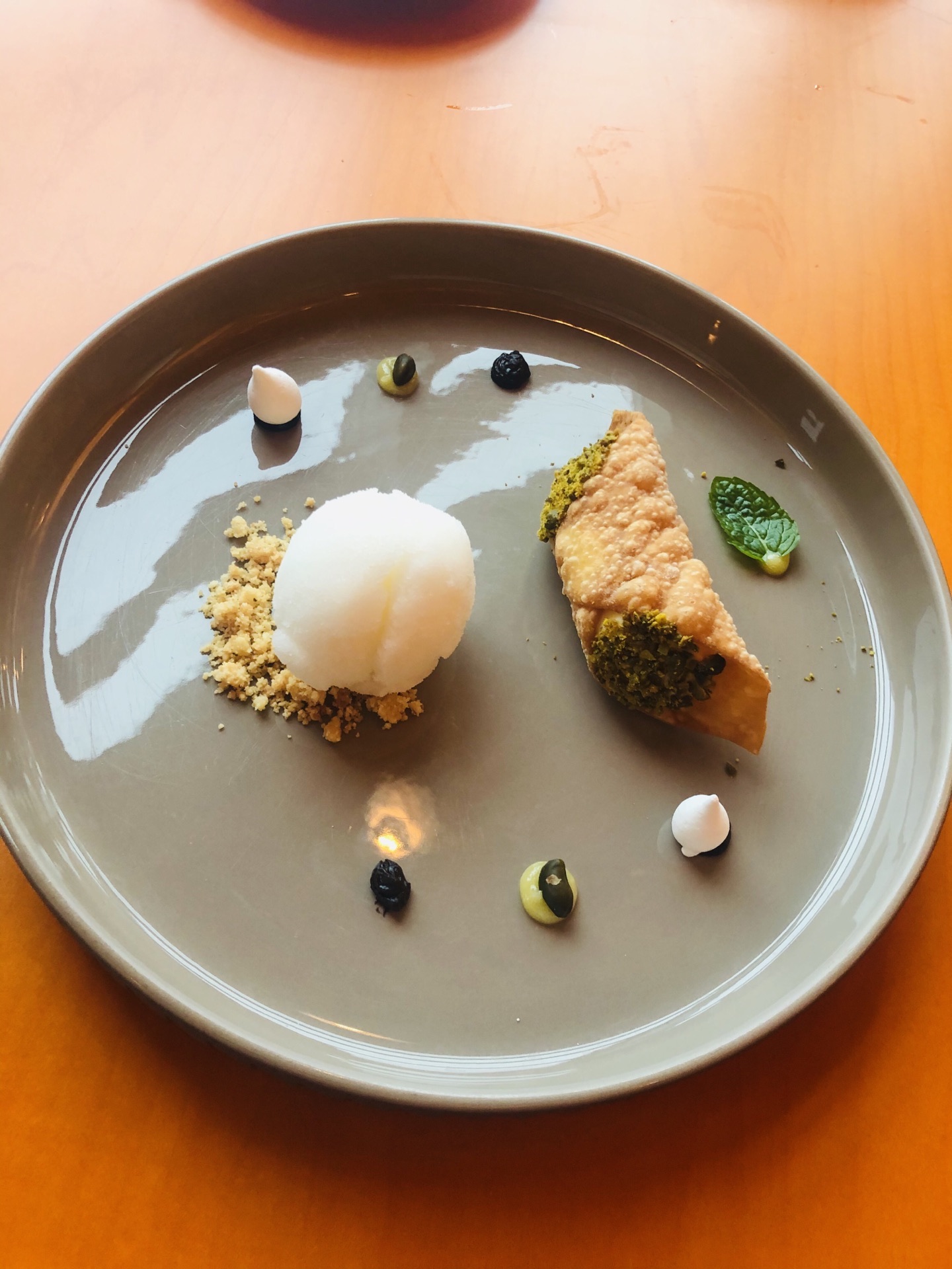 过年前约闺蜜提前吃个年夜饭,约了凯宾斯基酒店的二楼的意大利餐厅,浦东也有段时间没来了。 [薄荷]环境: 海蓝餐厅面积很大,装修气派,餐厅里还有漂亮的鱼缸。靠窗的位子有风景。 【菜品】中午有多种选择,有套餐,可以单点,也有半自助。 【炸藏红花米球】下面铺满加热过的石头。闺蜜说就冲这石头就能给五星。 【奶皮包水牛芝士奶沫】乍一看还以为一个水铺蛋,其实是芝士,外面奶皮有点小时候牛奶烧开了结成一层薄膜的感觉,里面流心的。创意十足,口感超级棒。 【牛肉莫泰拉火腿饺】意大利风味的饺子皮子加了蔬菜汁,馅是火腿的,外面加了乳清芝士、杏仁片和黑松露。 感觉餐厅的厨师很会搭配,每道菜使用的芝士也是不同的。 [服务铃]服务:五星级酒店的服务总是无可挑剔的。
