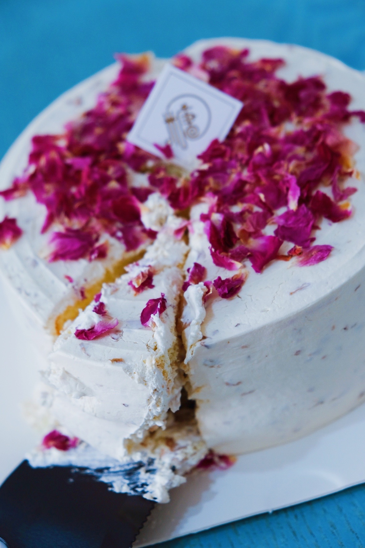 老板还会暖心提醒路上当心 玫瑰荔枝蛋糕 蛋糕软绵绵,奶味浓郁,夹层涂了玫瑰花酱,蛋糕表层也撒上...