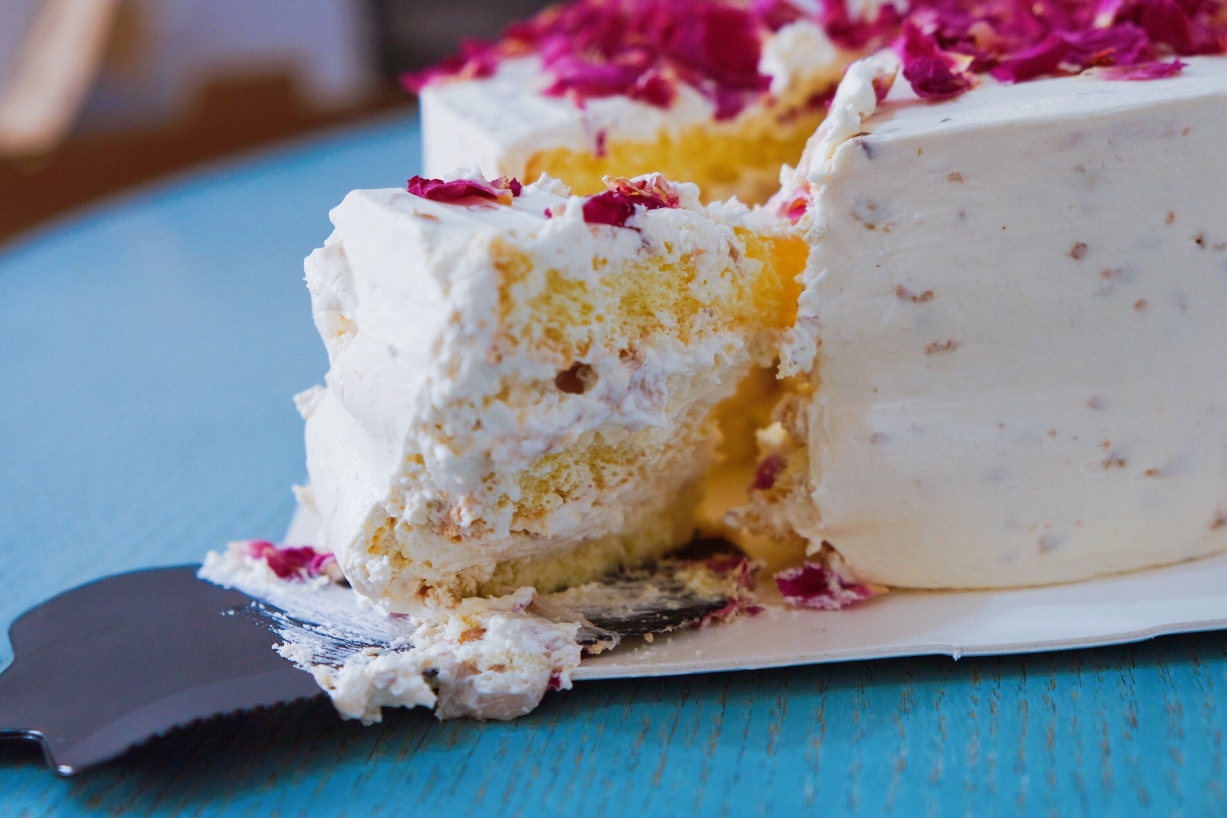 名字很sweet的一家蛋糕定制店 今年小伙伴生日订的就是这家蛋糕 得到3个菇凉一致好评后,自己来买着吃 店内环境温馨,粉色的沙发布置,满满少女心,去的那天是雨天,所以拿着蛋糕匆匆走了,老板还会暖心提醒路上当心 玫瑰荔枝蛋糕 蛋糕软绵绵,奶味浓郁,夹层涂了玫瑰花酱,蛋糕表层也撒上了美腻的可食用玫瑰花瓣,甜度轻柔,吃着清甜,小清新风,适合不喜欢太甜腻口味的小伙伴,而且吃得出荔枝果肉,真材实料,可谓颜值和口味俱佳 虽未曾穿渡星河 但还是有幸与你相逢 请干了这块荔枝的甜蜜