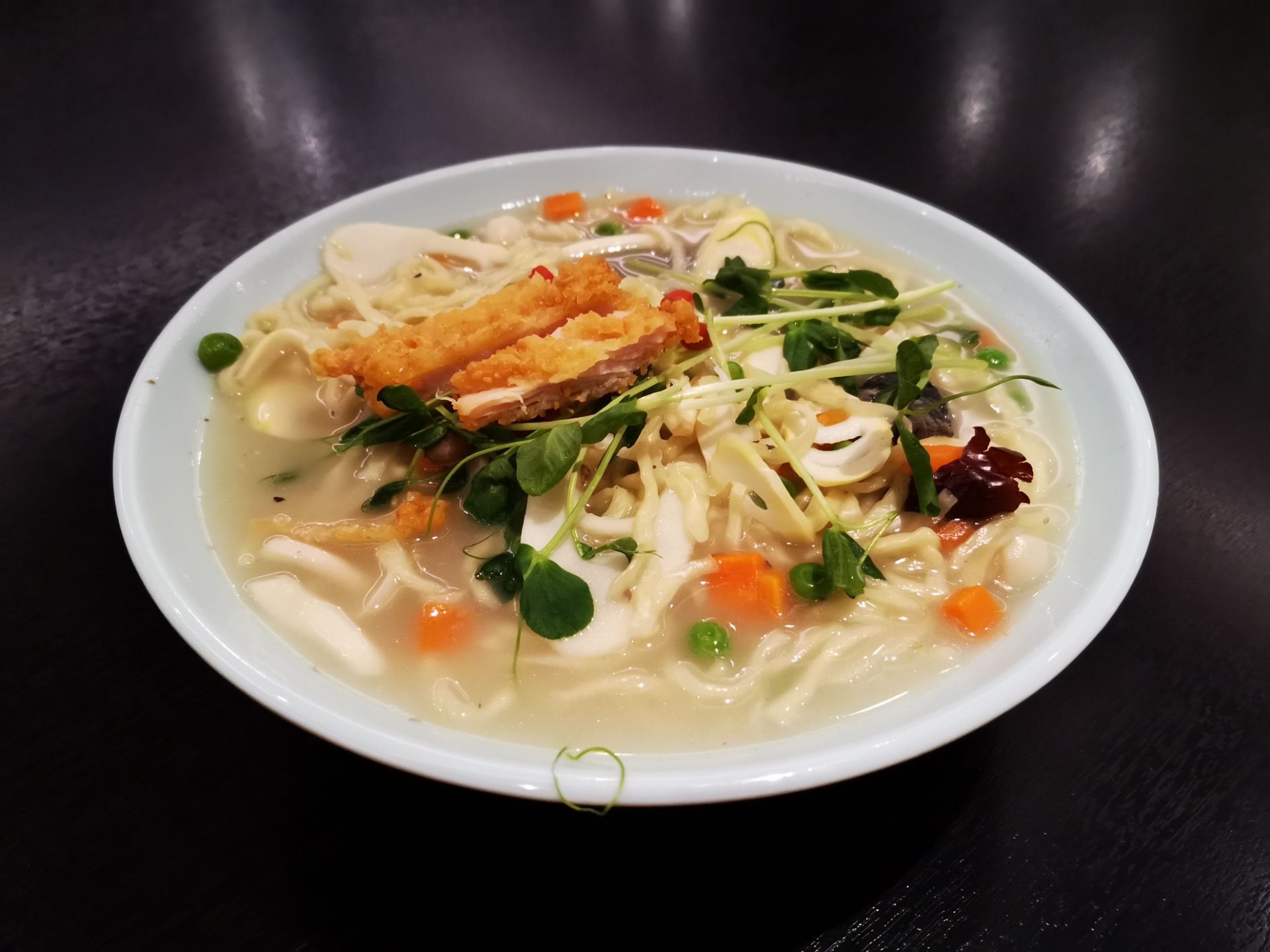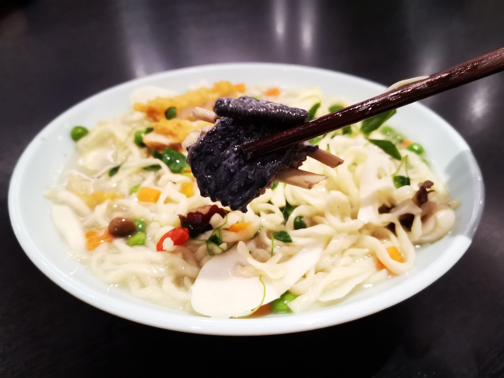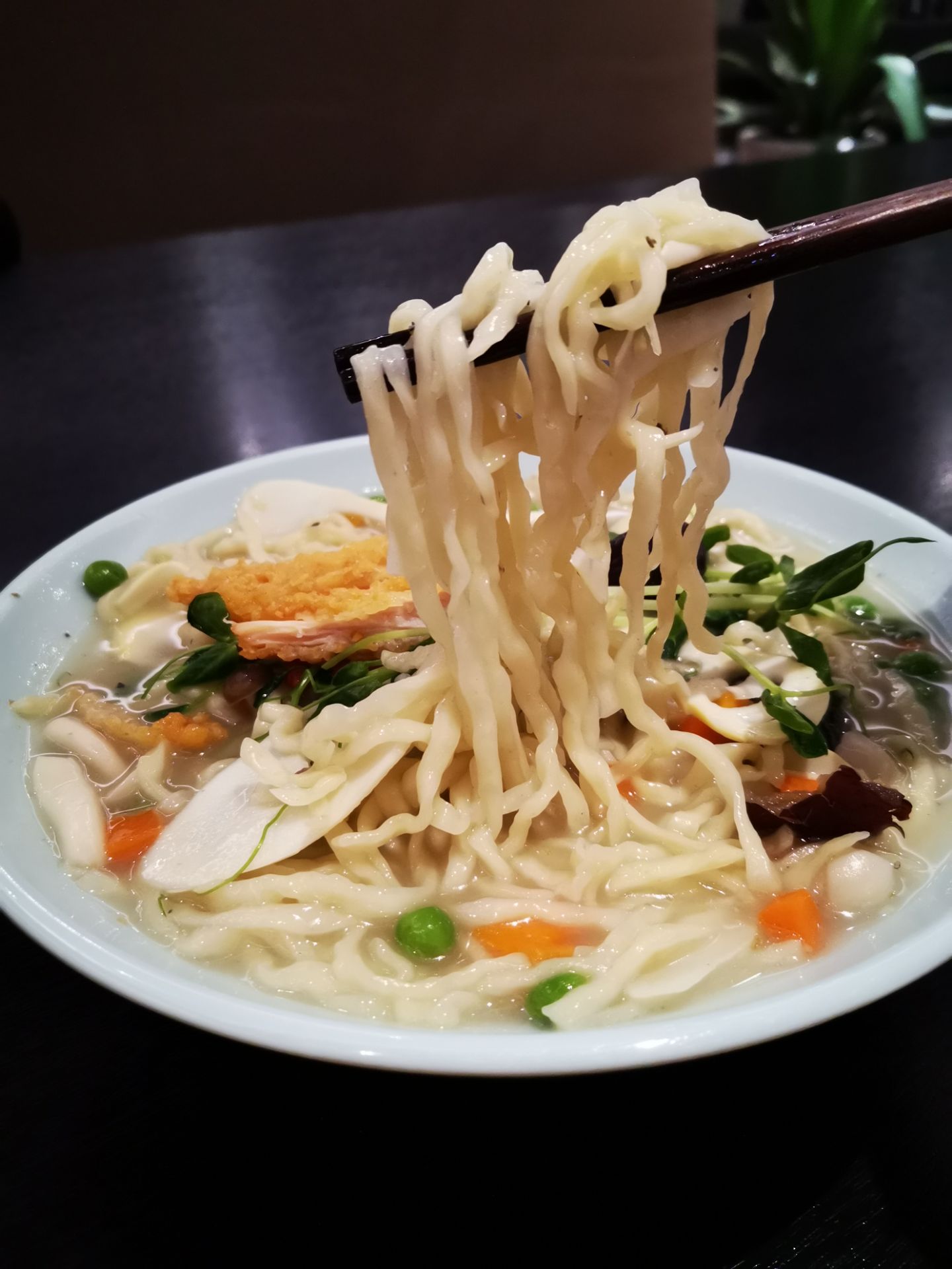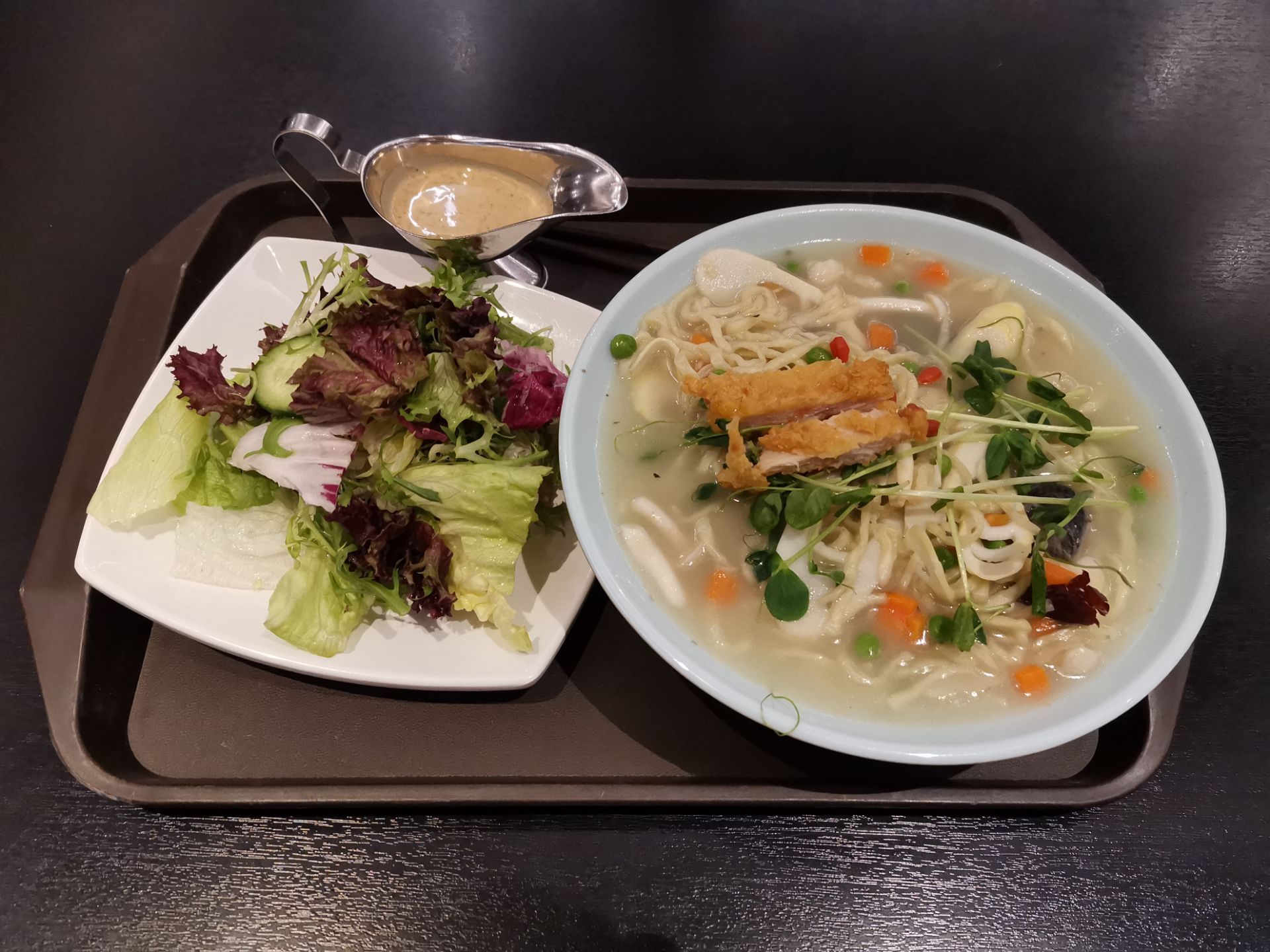 华东院西餐厅早就已经更名为华东院中西餐厅。 餐厅位于3号楼一楼,图书馆的旁边。餐厅内部是一个直角的空间。大冬天一进门,就感受到一股强大的暖气,很多家长带着小朋友在里面吃饭。相比楼上的食堂,无疑,这里的环境要好得多。 点了一份冬季新品——乌鸡菌菇高汤面18元,服务员说可能已经卖完了。于是跑到厨房跟厨师确认了一下才敢下单。支付好后给叫号牌,没等一会儿就响了。一大碗面,分量很足。面是和楼上食堂一样的手擀面,口感很劲道。配料有胡萝卜、青豆、菌菇和乌鸡。乌鸡一共有五六块,非常实诚了。汤也很鲜美。 考虑到蔬菜摄入不足,又点了份蔬菜沙拉,10元。这个就是最普通的蔬菜沙拉,沙拉酱自己淋,还新鲜的。 餐厅不对外哦,需要有华东院饭卡才能消费。关联的视频是上次来吃的。