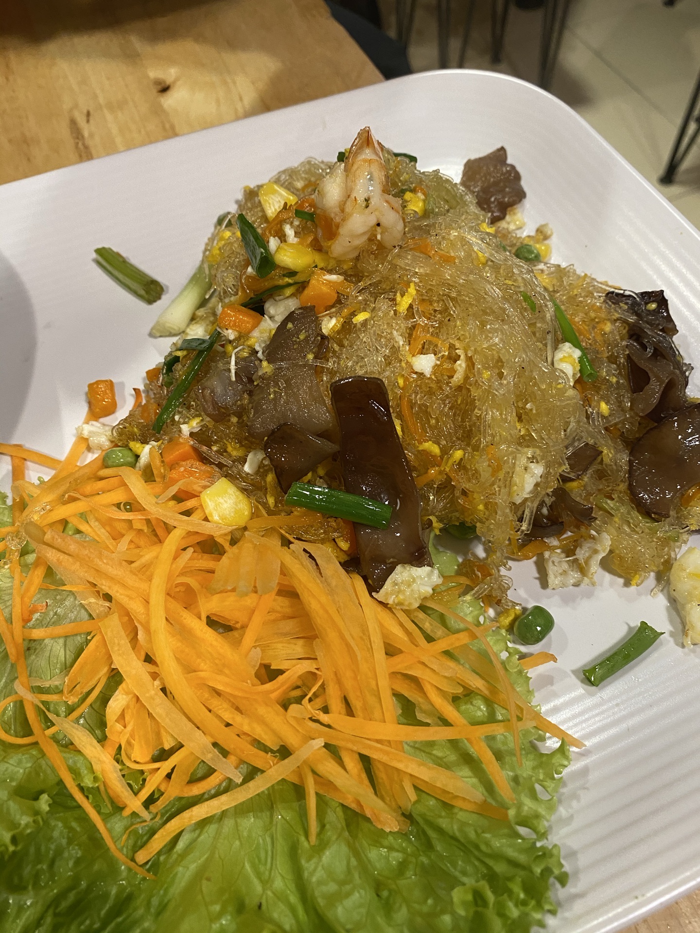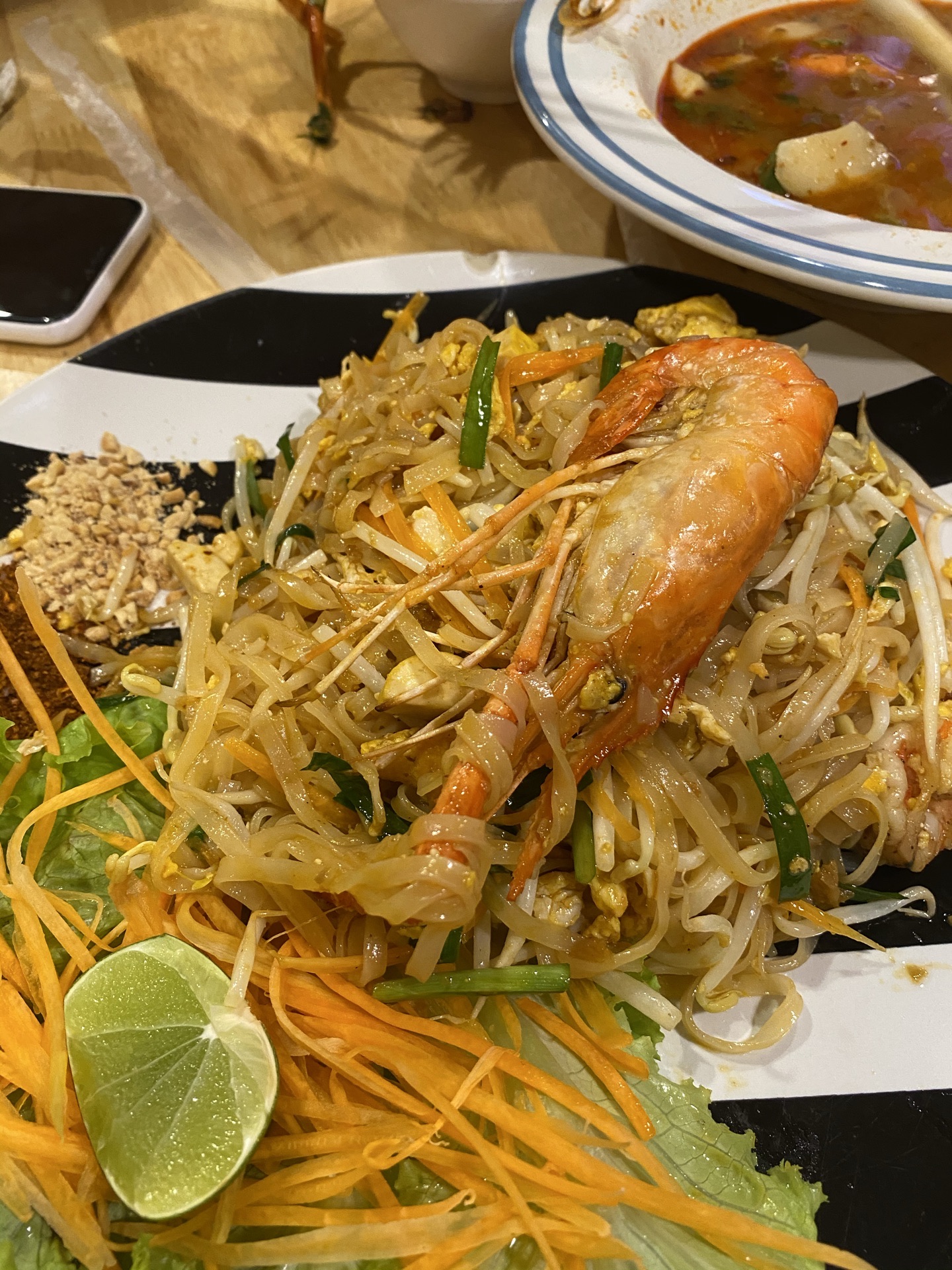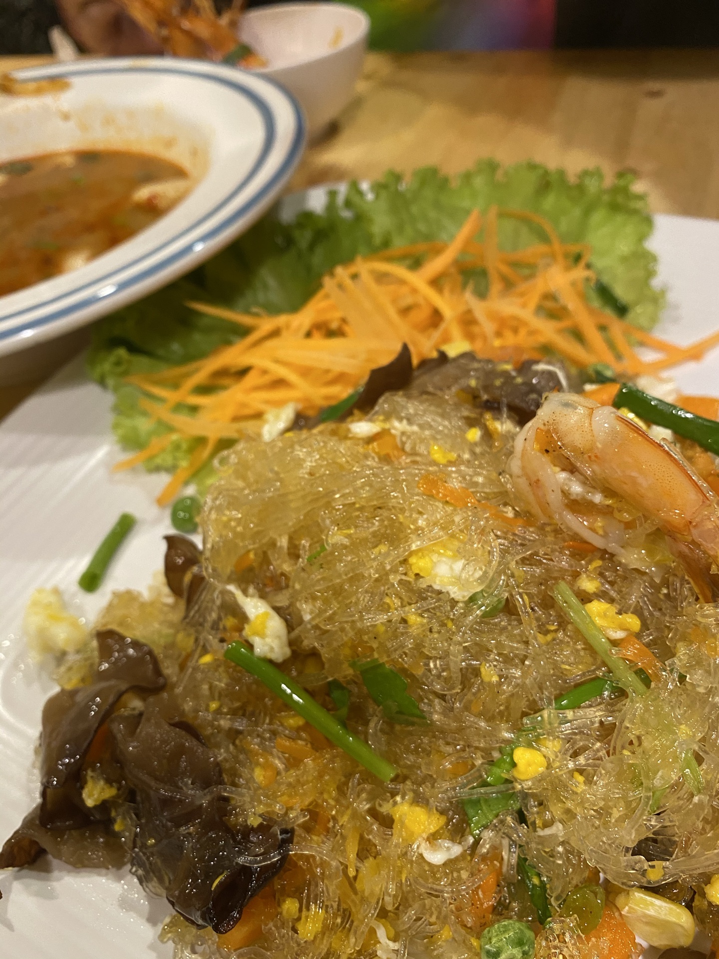 在点评看到的这家店,据说有特别好喝的冬阴功汤,来了泰国怎么能不试试冬阴功汤?! 「冬阴功」第一口就味道很浓!浓浓的酸酸甜甜的味道,真的是很下饭,搭配米饭吃特别好。 「泰式炒裸条」这道菜所有泰国餐厅都有,就跟空心菜在泰国一样不可能不好吃。 「炒粉丝」上来之后一坨粉丝感觉有点儿没有卖相,但是尝了一口之后意外的很好吃呀️!主要调料味道很好可以点个试试。 总之这家冬阴功汤很值得来试试~