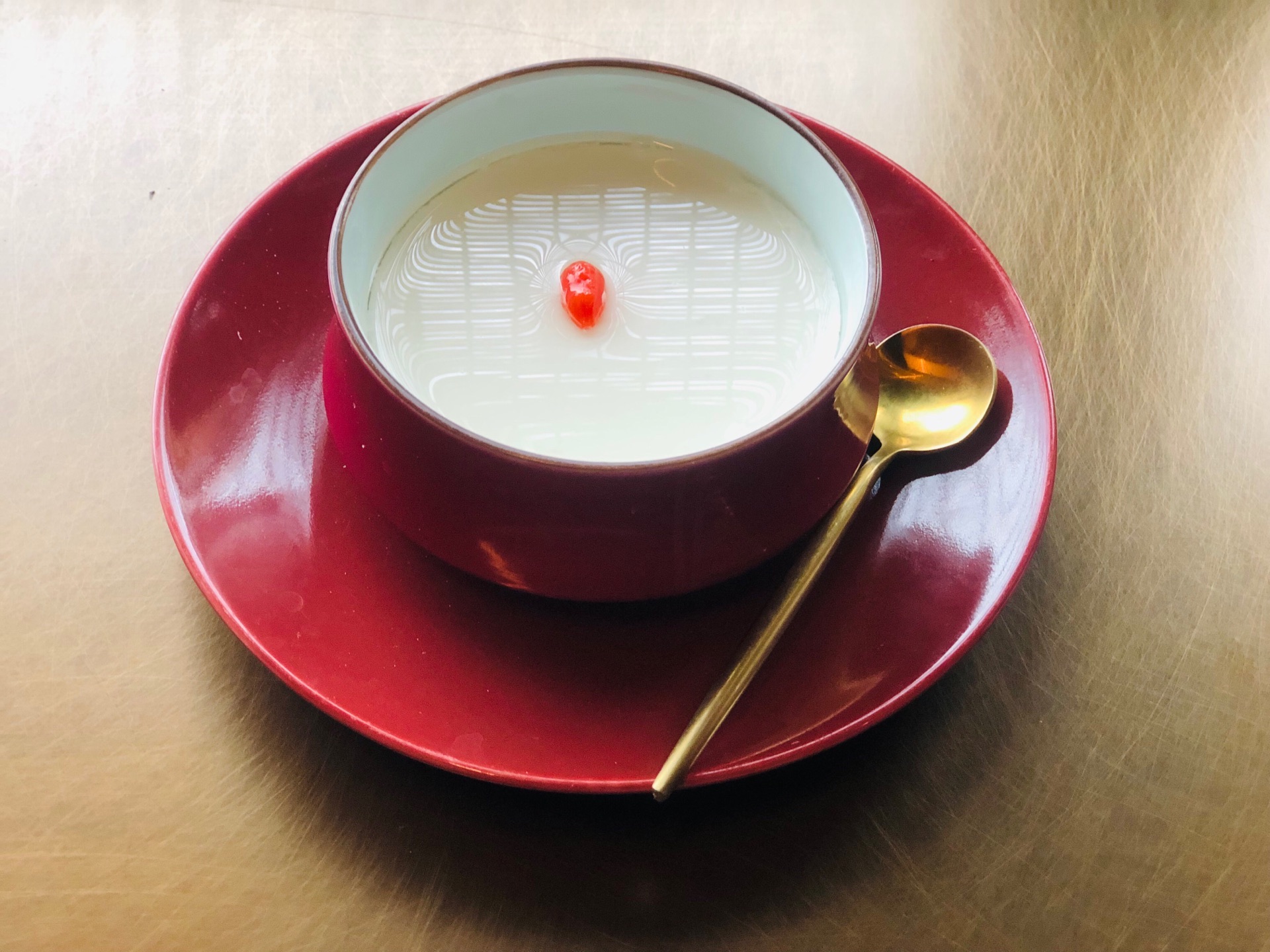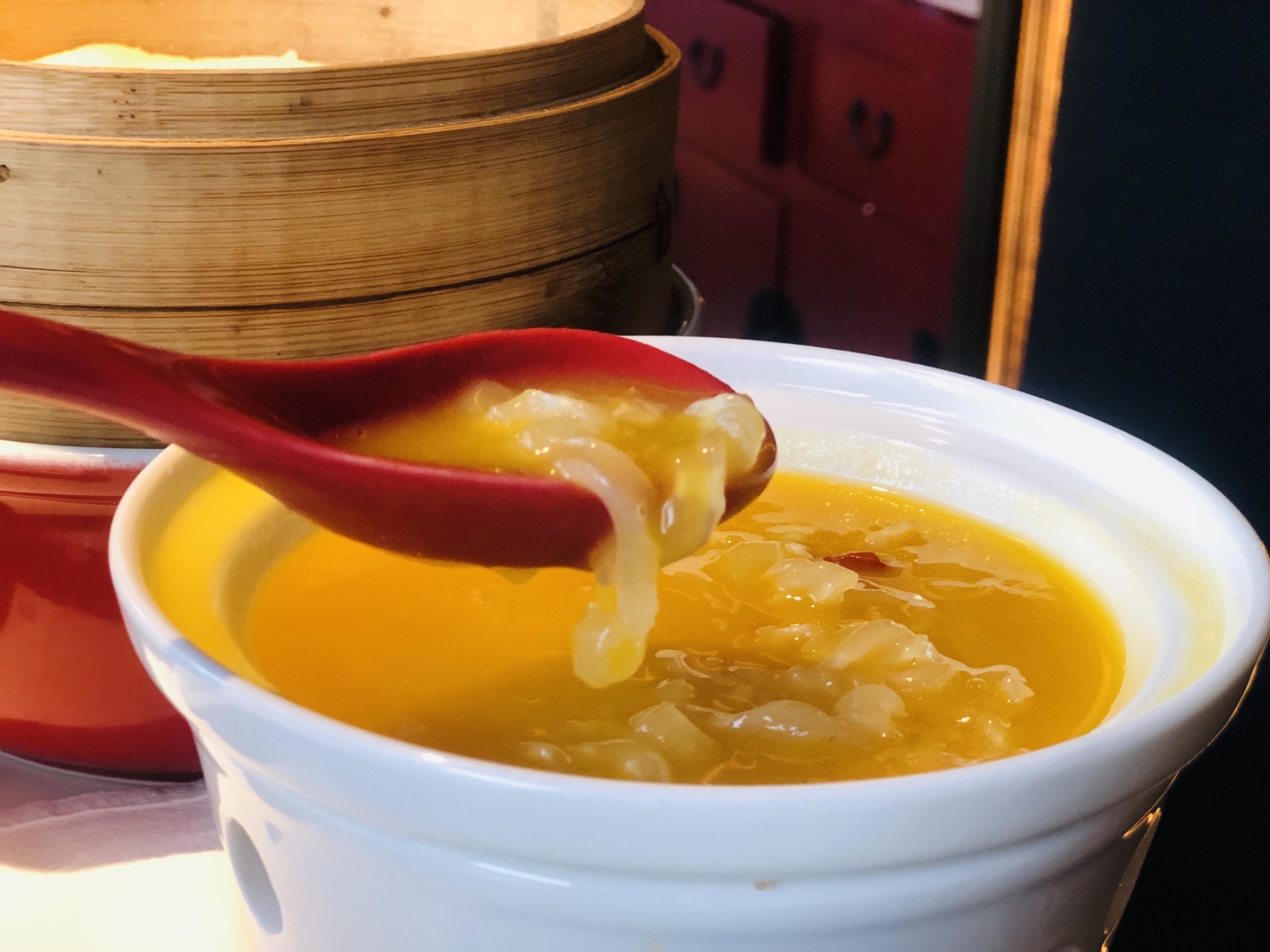 #点评有礼# 红叶、银杏错落着北平的秋,往事如烟似梦像云一样飘过,帝都的金粉世家极尽浪漫,终于让这里成为约会圣地~ [薄荷]环境: 恢弘大气的庭院,并没有一味的突出胡同、记忆…而是着眼北平那些不容易被时间磨灭的自然景观——比如红叶比如金灿灿的银杏叶~ 「京华牡丹烤鸭」 谈京菜绕不开烤鸭,他家是明炉炙烤,所以鸭皮更松脆些。肥硕的鸭子,架到烤炉上,硬生生逼出肥油,鸭皮被油一浸,愈加的酥脆,鸭子肉也烤的略微干松就可以切片了。 片鸭子有讲究,108刀的执念可以不要秉承了,但是每一片都带些皮确实从口味出发比较合意。片好一朵牡丹花,连饼带酱这么一摆,仪式感满满,约会中的两个人都会被惊艳~ 脆鸭皮蘸白糖,有点儿小时候贪甜无度的口味。鸭肉和小葱黄瓜这么一配,红香绿玉,顶好看呢! 卷好的鸭子卷一口嚼上,柔腻甜滑,黏糯香浓,鸭皮咬对了脆劲儿,整个人更是吃得稀里哗啦! 「鱼唇」 酸辣弹柔,隐性挡口,清口又不失滑美,喝到香浓处满口生津~ 「杏仁豆腐」 一顿饭吃的热闹,杏仁豆腐最后出场结尾。清明甘甜,沁人心脾。杏仁的苦中带凉,总能让人自我释怀——有她在,多吃两块肉也不觉得有罪恶感。 [服务铃]服务: 一对一服务的形式,卷鸭子都不用自己动手,全程吃着聊着,自有人斟上红酒。幽暗的灯光,曼妙的氛围,自有别样滋味在心头~