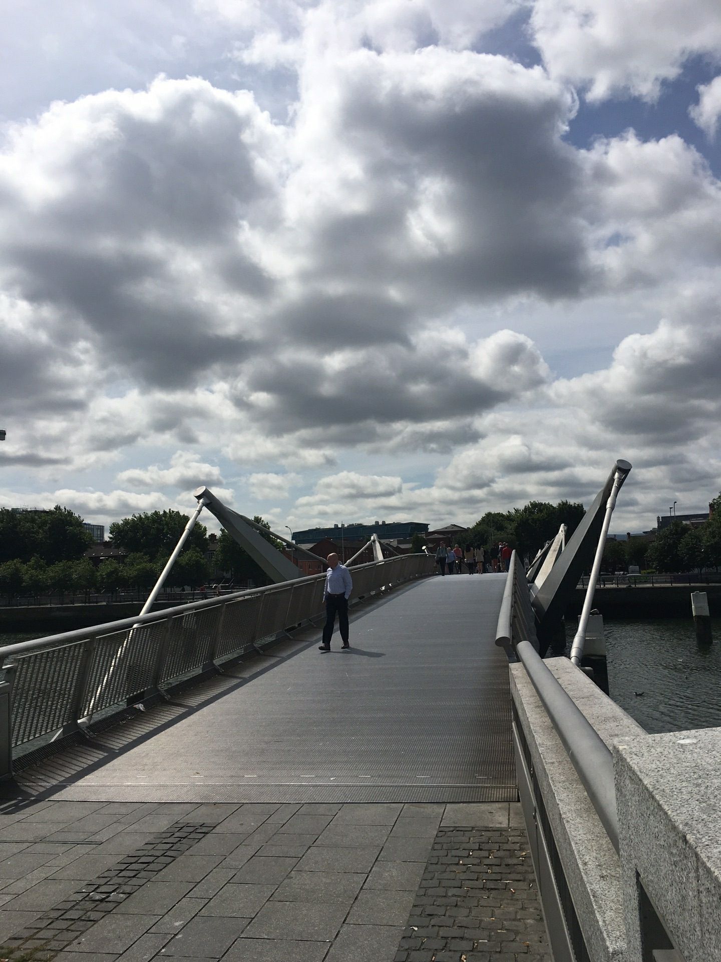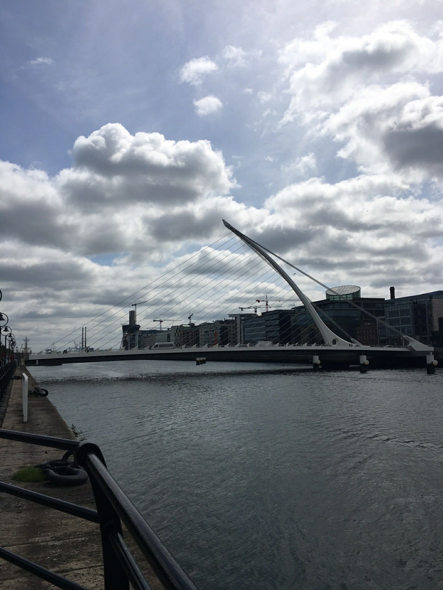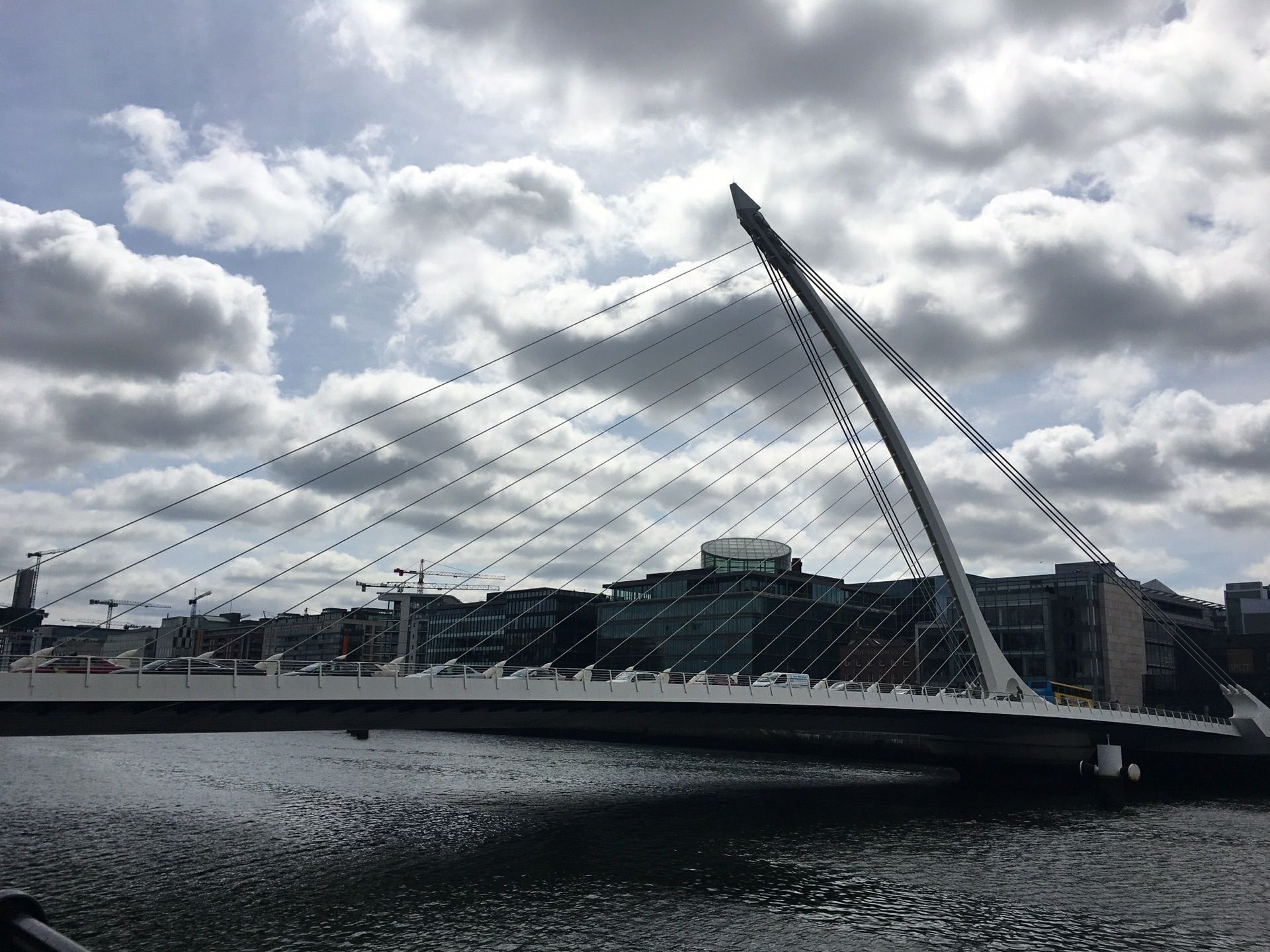 它是一座纯人行的步行桥,也是利菲河上一道亮丽的风景这是都柏林利菲河上非常著名的一座桥梁,被称为塞缪尔贝克特桥,他的样子非常的奇怪,一根斜着的桥干拉起了一根根的铁索,这样造型的铁索桥非常的与众不同。它是一座纯人行的步行桥,也是利菲河上一道亮丽的风景。