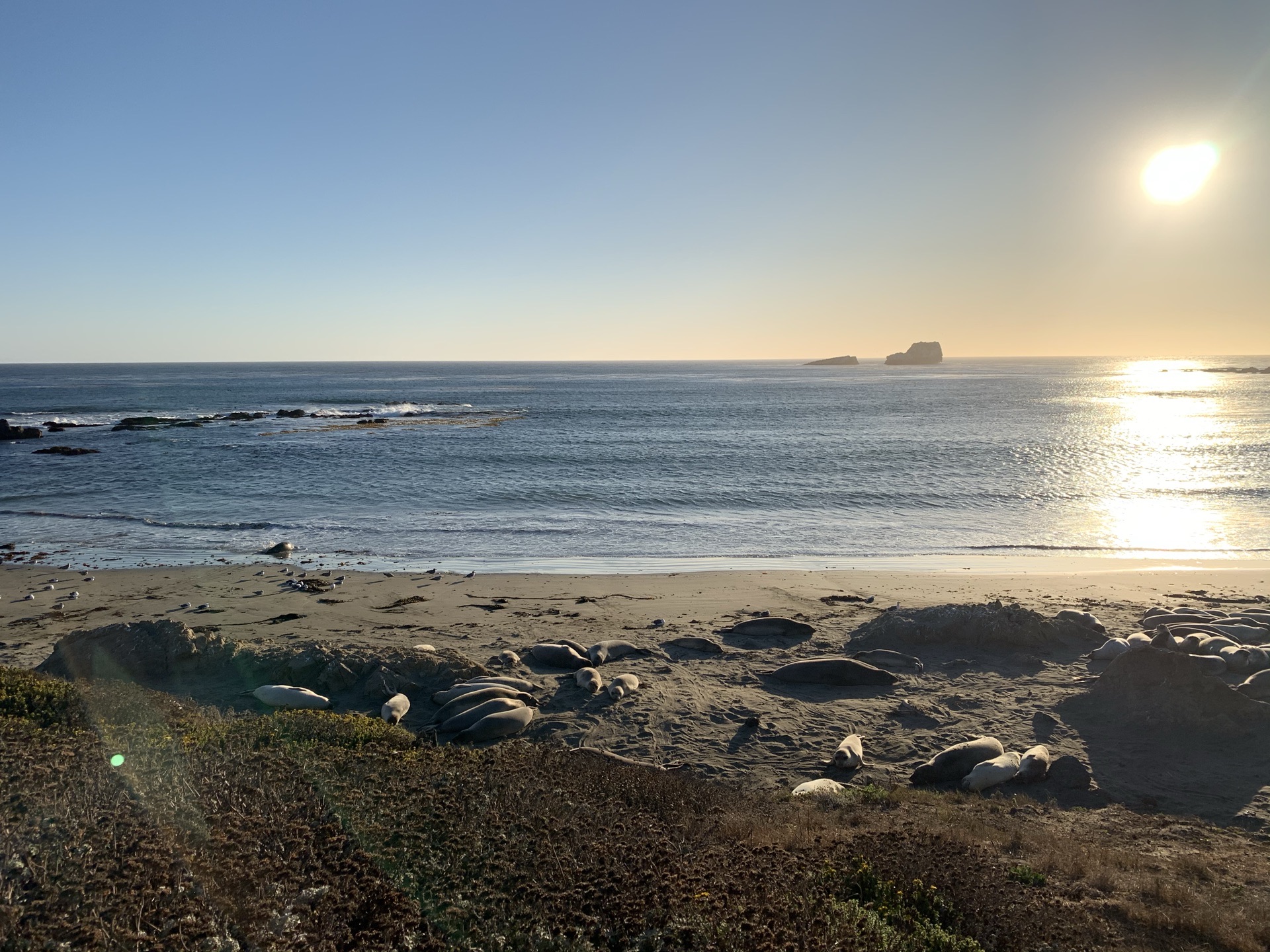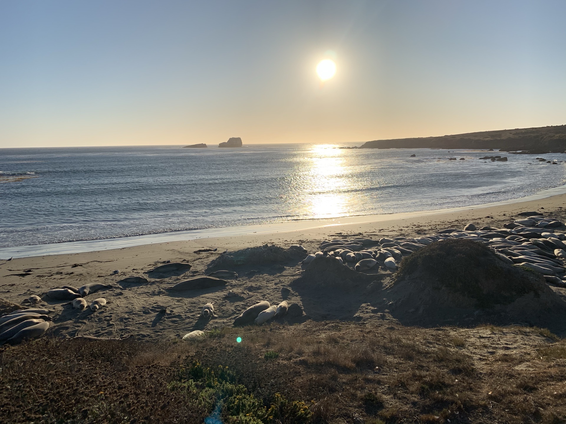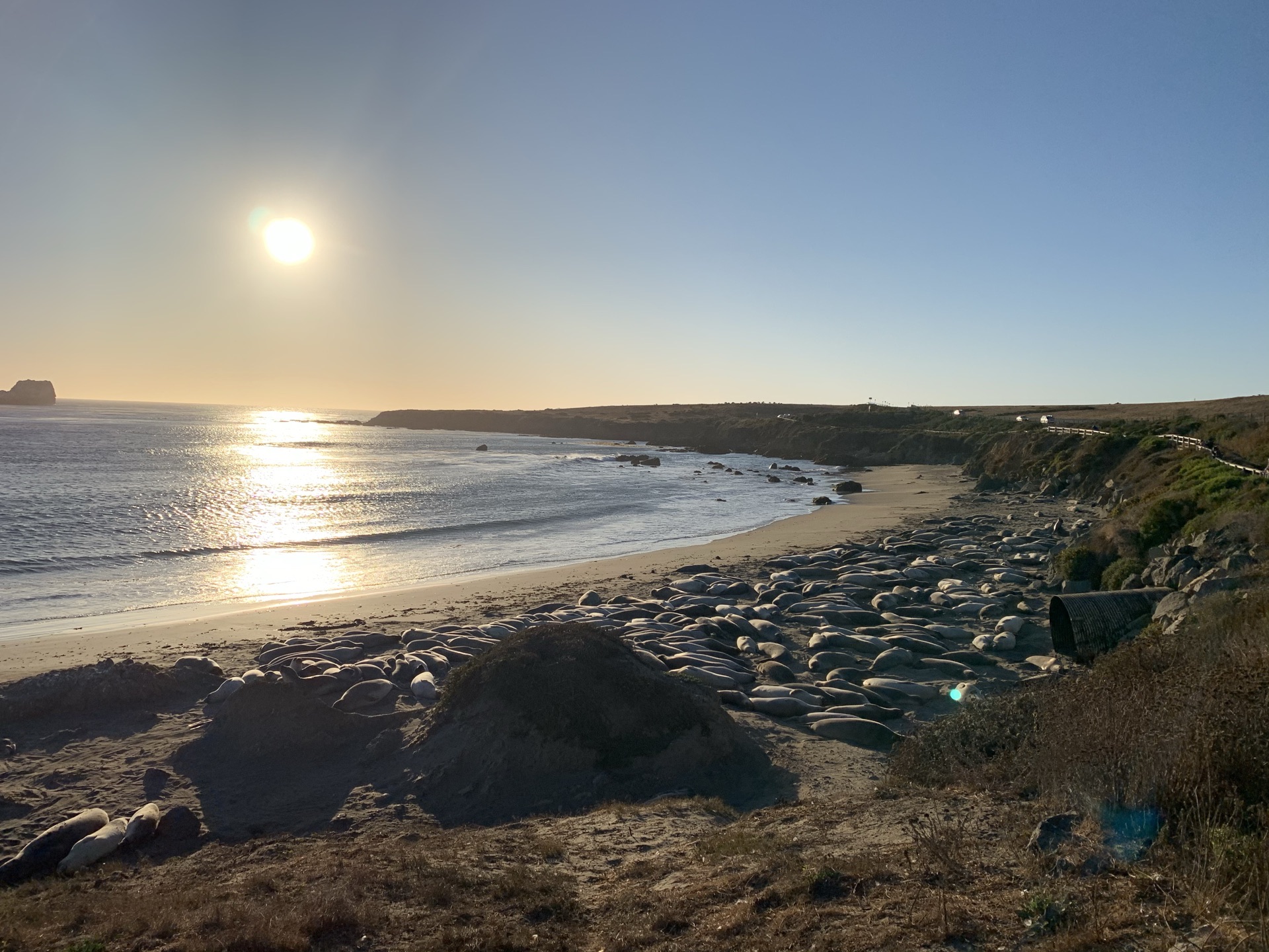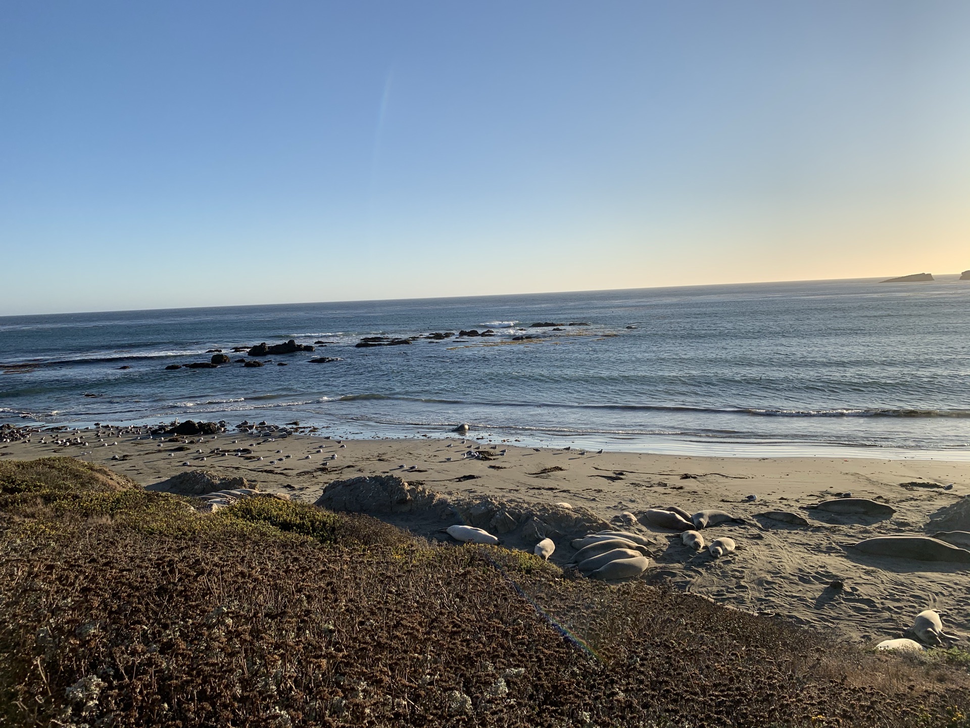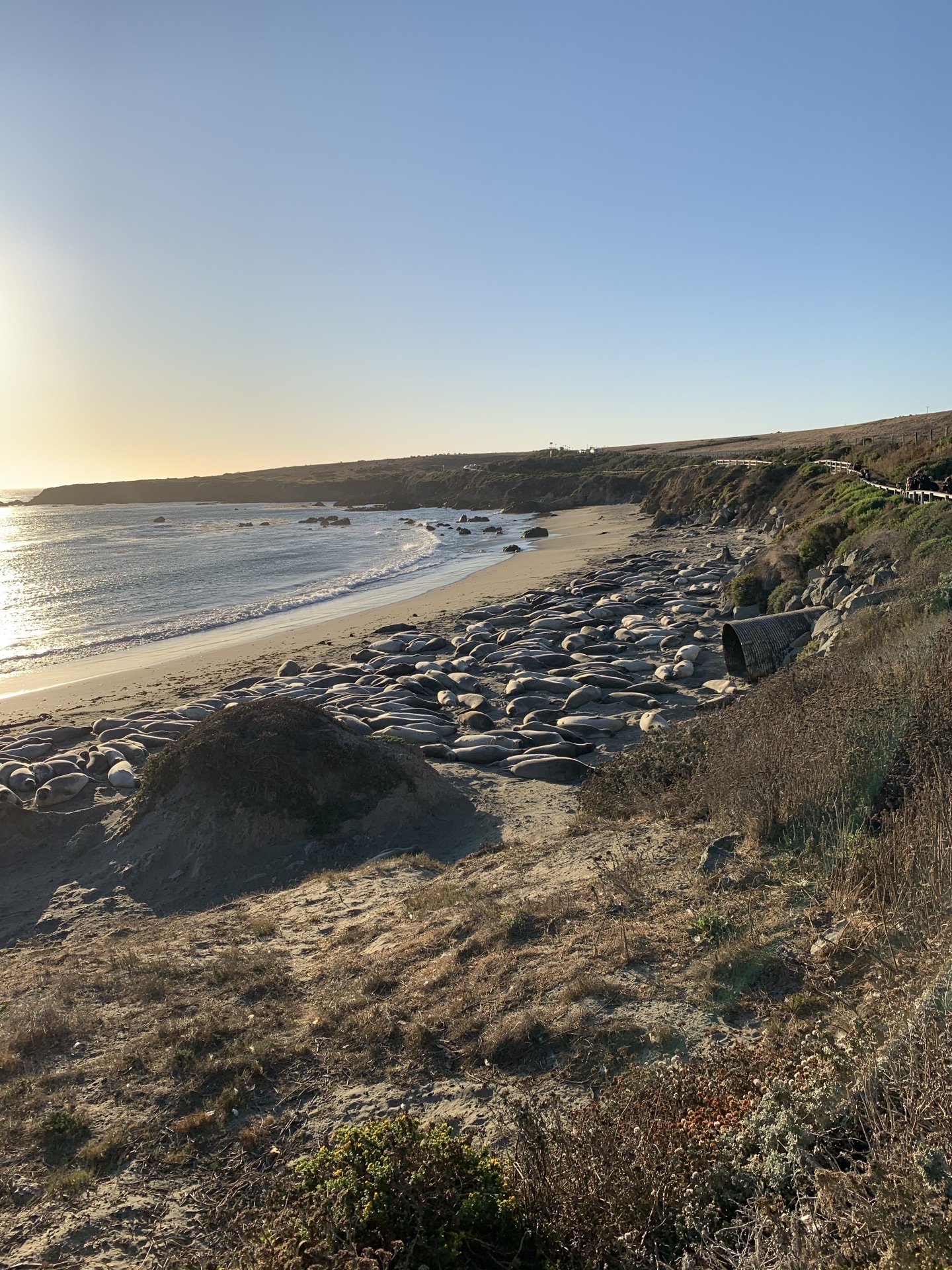 这个景点建议一定要停下来,看一看。 真的很有趣,海滩上齐刷刷的躺满了胖乎乎的海豹,其实我也不知道是海豹还是海狮。 反正就是那种憨憨的没有腿的,蠕动着走的海洋生物。 它们都很悠闲的躺在海边的砂糖上,密密麻麻的,我这种密集恐惧症,真的看着有些不是太舒服。 况且它们真的很臭啊,刚一下车我就闻到了一股恶臭,像是那种从来没有打扫过的的公共厕所的味道,特别恶心。 但是呢,当你看着它们这些没有腿的生物,匍匐前进,或者懒得等海水将它们冲上岸的那种情景,还是会不由自主的想笑。 我就在那儿一个人笑了好久好久,真的是莫名戳中我的笑点了。 很多蚊子在他们身上飞过来飞过去,爬得它们满身都是,但是它们并不在意,一直昏睡。 而,对面的那个小岛上也是很多海狮,,感觉都快给小岛压沉了! 哈哈哈,我想用“死猪”来形容它们,不是别的意思,单纯觉得它们太懒太可爱了,随便你干什么,它们都不为所动。 还有就是,为什么它们喜欢在这里栖息呢?并且为什么这里会有这么多这个动物呢。