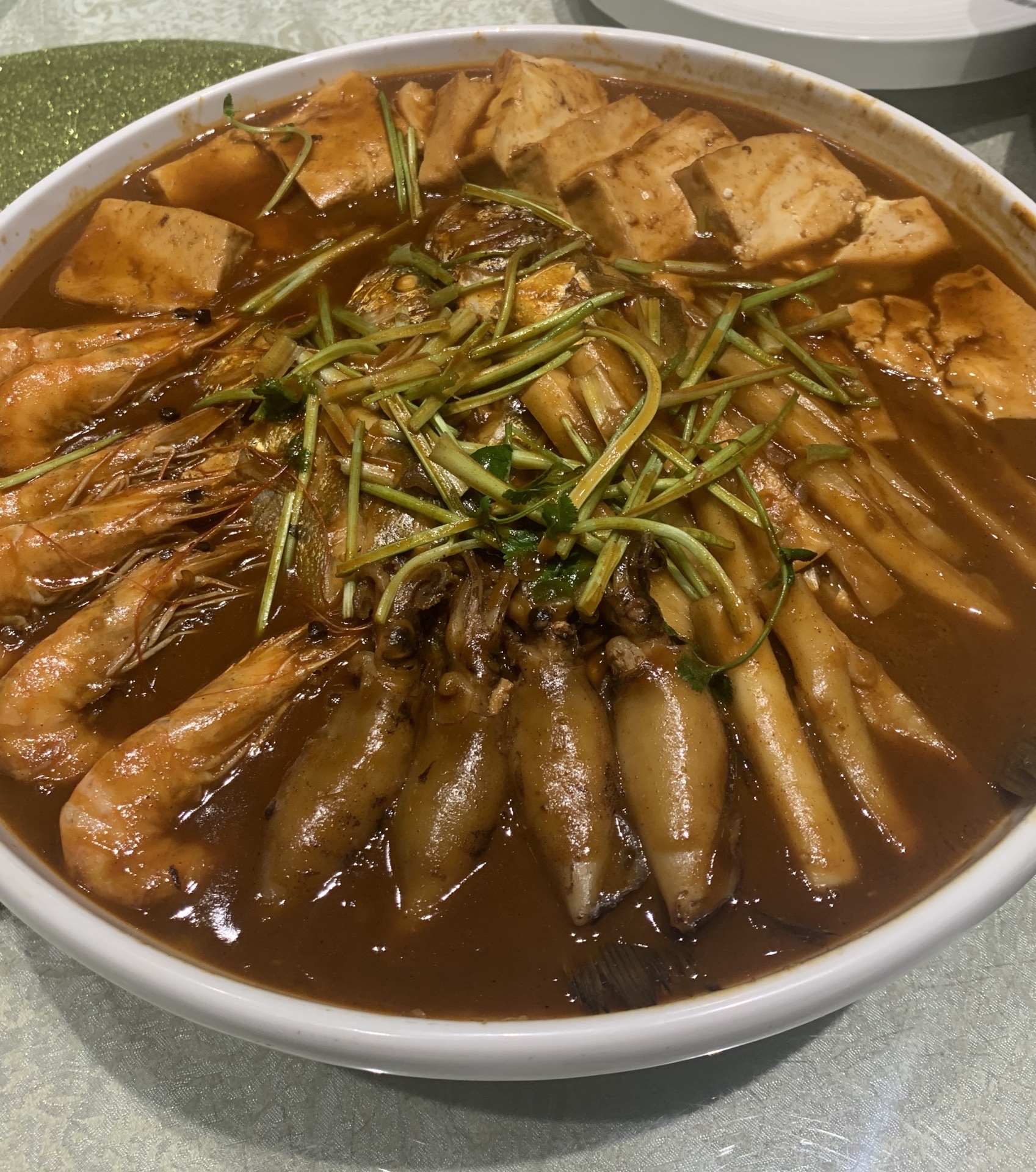 鱼、虾、墨斗鱼和豆腐还有年糕一起炖煮熬制,味道特别不错炒羊肉,精选上等羊肉,慢火铁盘烤制。香气扑鼻,如果你想DIY的话可以找服务员要一些孜然什么的调料,也不错。 鱼、虾、墨斗鱼和豆腐还有年糕一起炖煮熬制,味道特别不错。