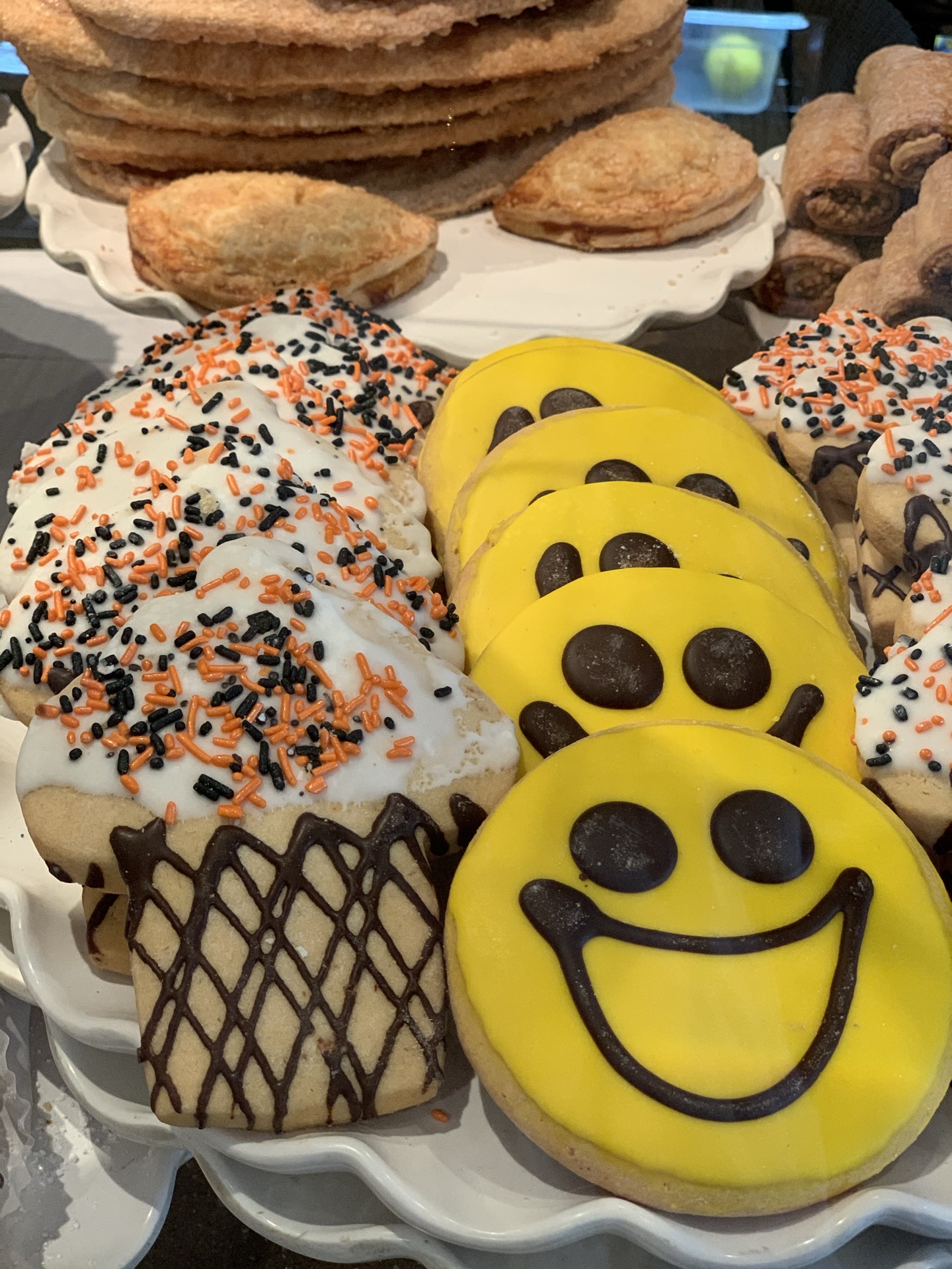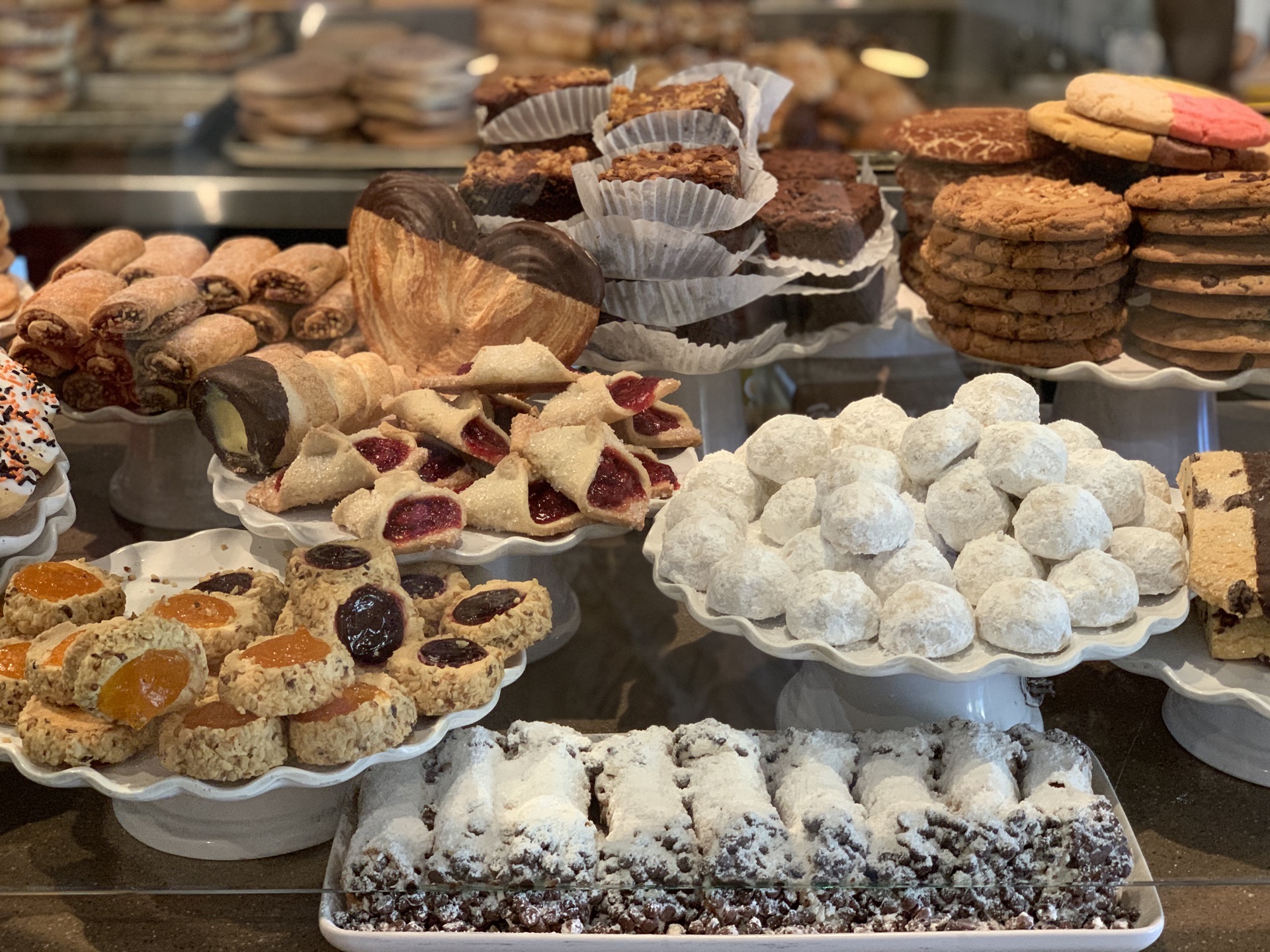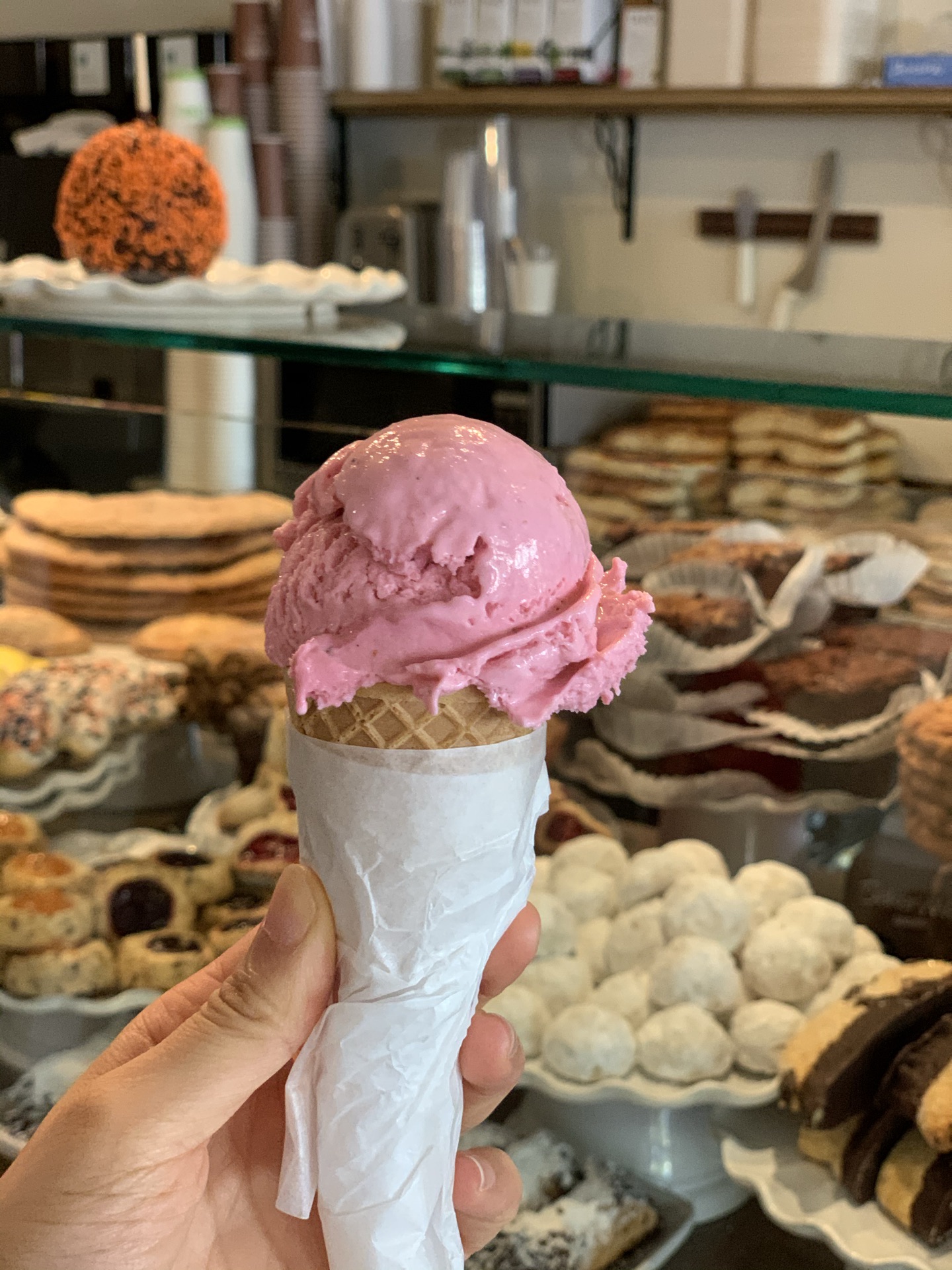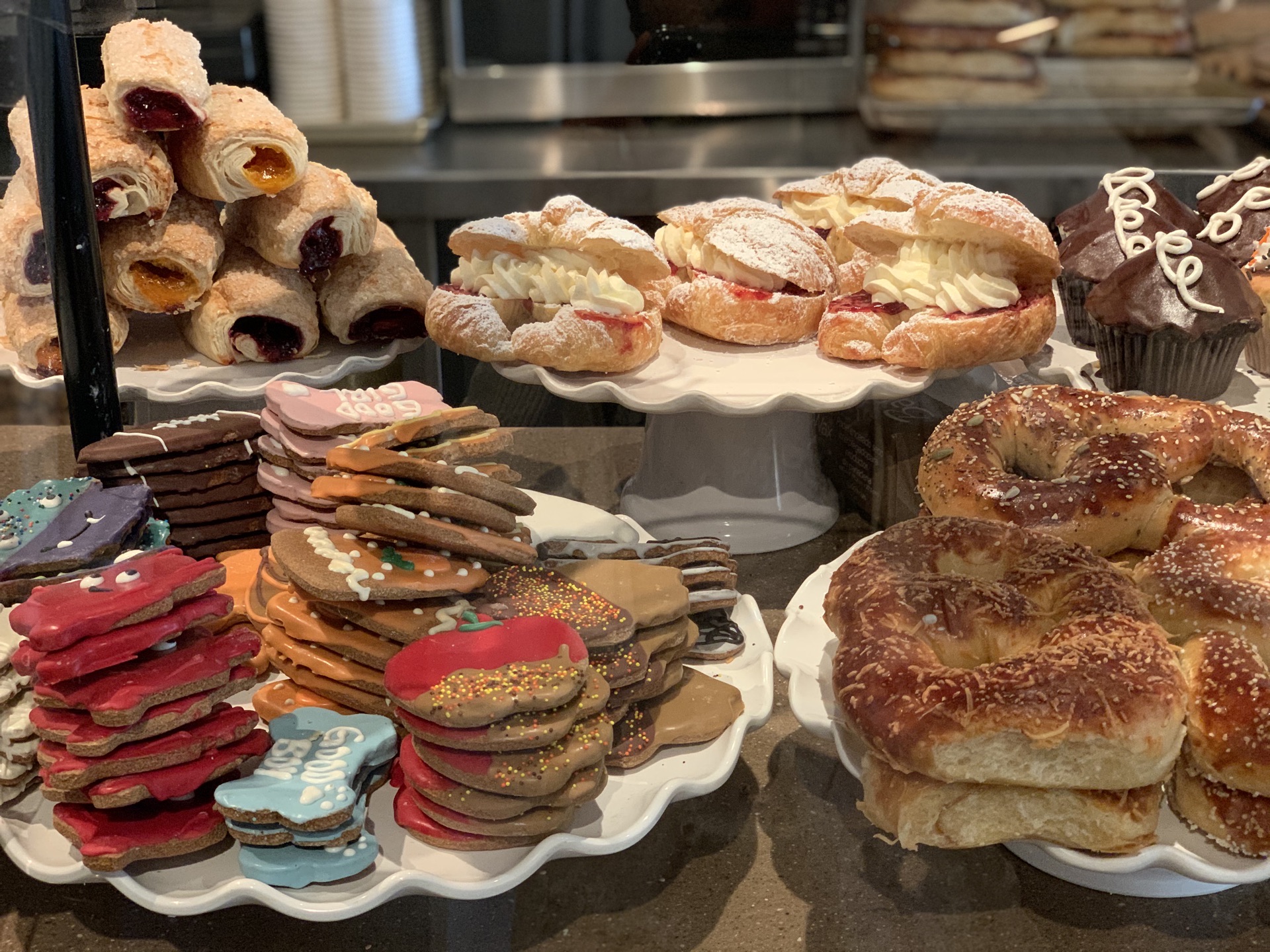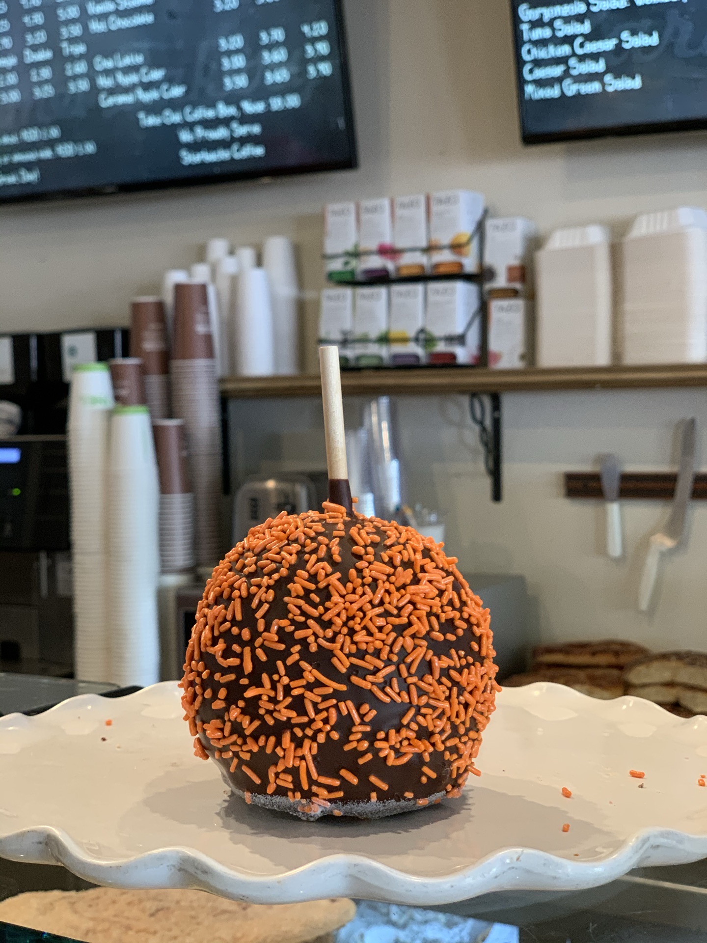 美国的面包店感觉都有些粗犷,真的不能和法式甜品店面包想必,连国内好些店铺都比不上呢。 并且这边的人是真的超级超级喜欢吃甜,所有的甜点都好甜哦,然而他们并不觉得。 难怪大多数都体重超标了呀,真的是很高热量呀。 我们四个人一人选了2款面包,最后一致觉得好吃的也就2款而已,也不说很好吃,只是还可以的。其他都比较甜腻。 恩,具体是哪几款我已经记不得,毕竟是十月去的美国,记忆力真的不行了。 但是面包展示台上有一个大苹果,包裹了一圈的巧克力,然后四周沾满了糖果颗粒,插了一根木棍,像是一个巨大的棒棒糖,很可爱。 我在很多面包店都又看见过同款的甜点,很想尝试,但是怕太甜,觉得自己肯定吃不完,所以没敢尝试。 而后在拉斯维加斯吃自助餐的时候,甜点区也有同款的苹果棒棒糖,果断尝试了一个。 哈哈,不好吃,就是一个华而不实的苹果而已,它以为穿了件华丽的外套,自己就不是苹果了吗! 这家还是卡梅尔小镇上评价很好的面包店了,这水平实在是失望了。