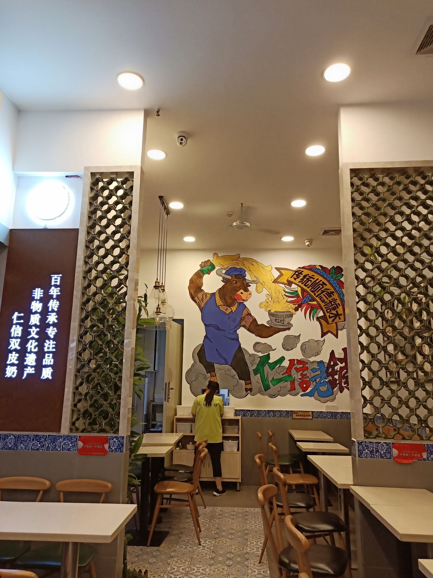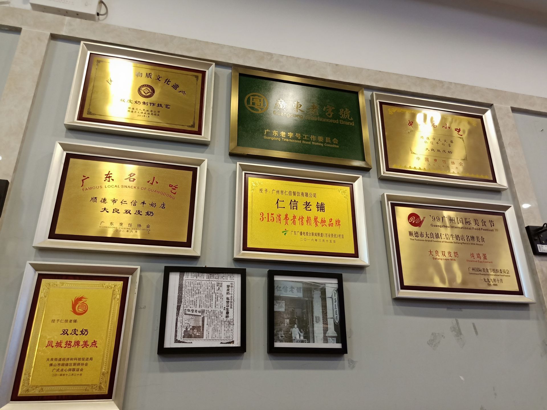 广州人简称它为仁信,一说去仁信,大家都知道是去这个甜品店,最出名的就是姜撞奶,双皮奶非常好吃,这是顺德的一个老牌子,传说儿子继承了店铺为民信,而仁信这个店名就留给了闺女闺女往外发展,儿子的民信留在顺德当地。