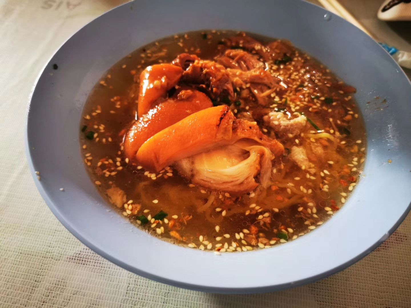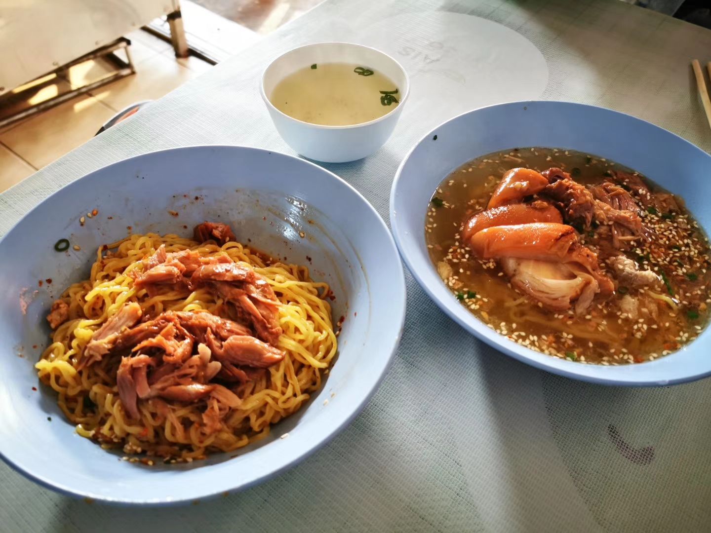 实在搞不懂为什么清迈这边的人这么喜欢吃猪脚饭,猪脚饭大多数都是一些小摊贩里面的比较正宗,浙江杭州猪脚饭是位于大学小摊贩区域里面的。 店铺并不是特别的大,只有几张桌子围在店铺的前面,勉强的能够坐着来吃,可是味道还真的是可以的,有汤猪手面,还有捞猪手面,个人觉得干捞的会比较好吃一点。