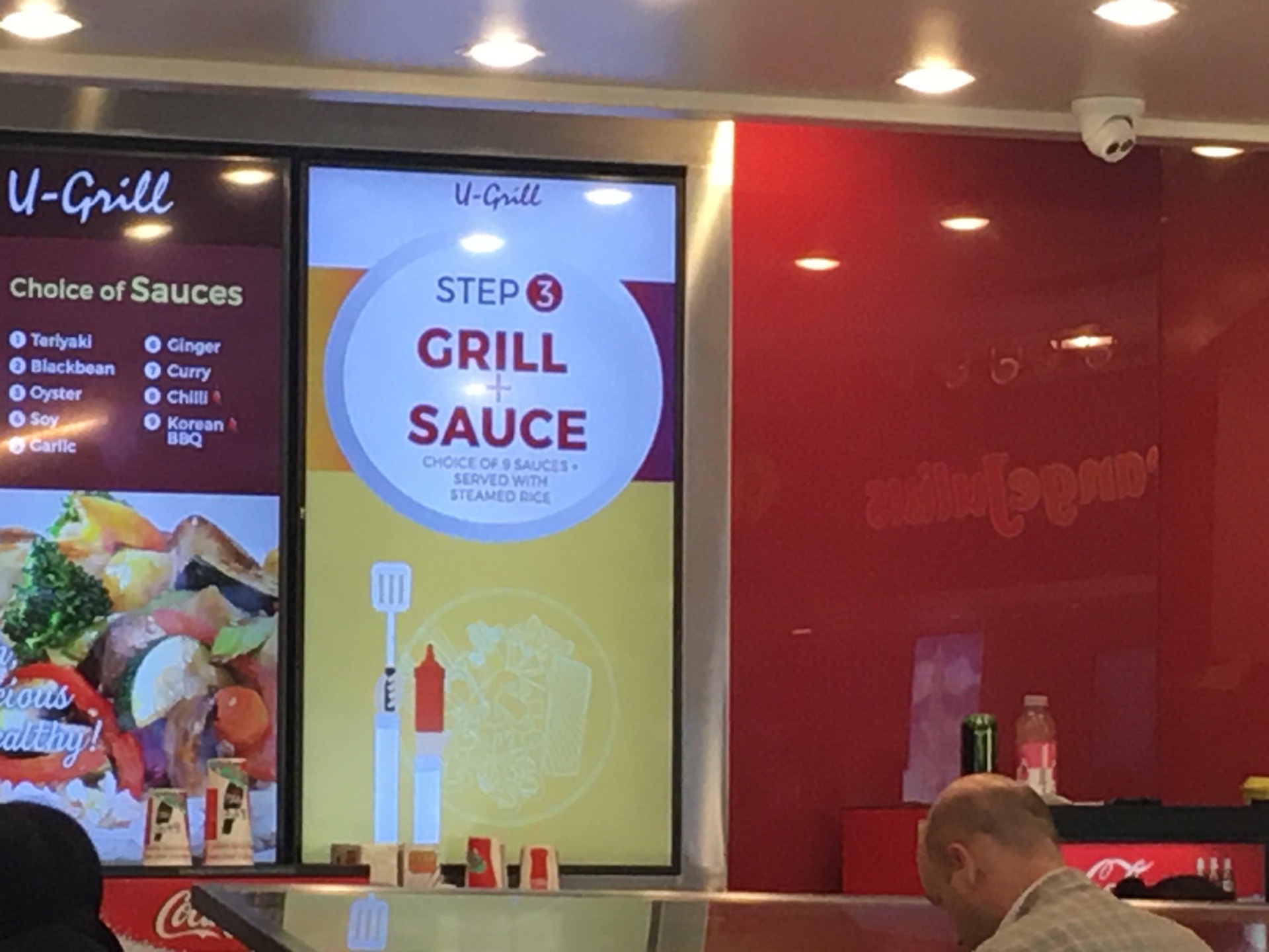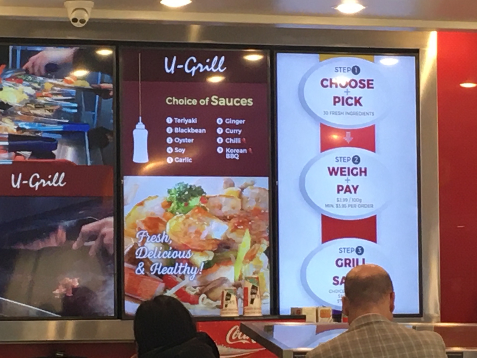 用餐之前有个三部曲:1.选料、2.称重并付费、3.自己烤制并加酱汁,之后就可享用了U Grill中的“U”也就是“you”,you grill就是自己当厨师。用餐之前有个三部曲:1.选料、2.称重并付费、3.自己烤制并加酱汁,之后就可享用了。