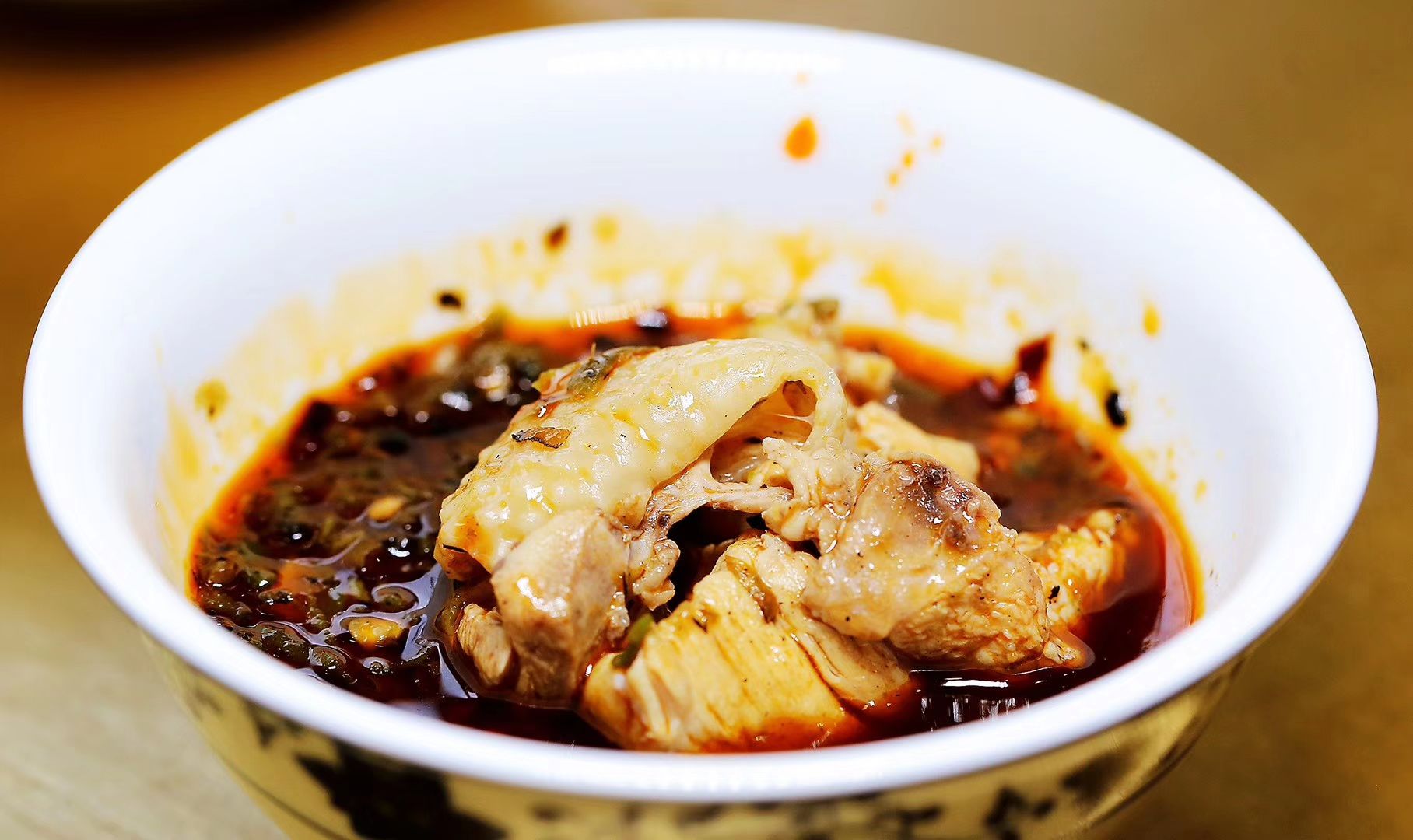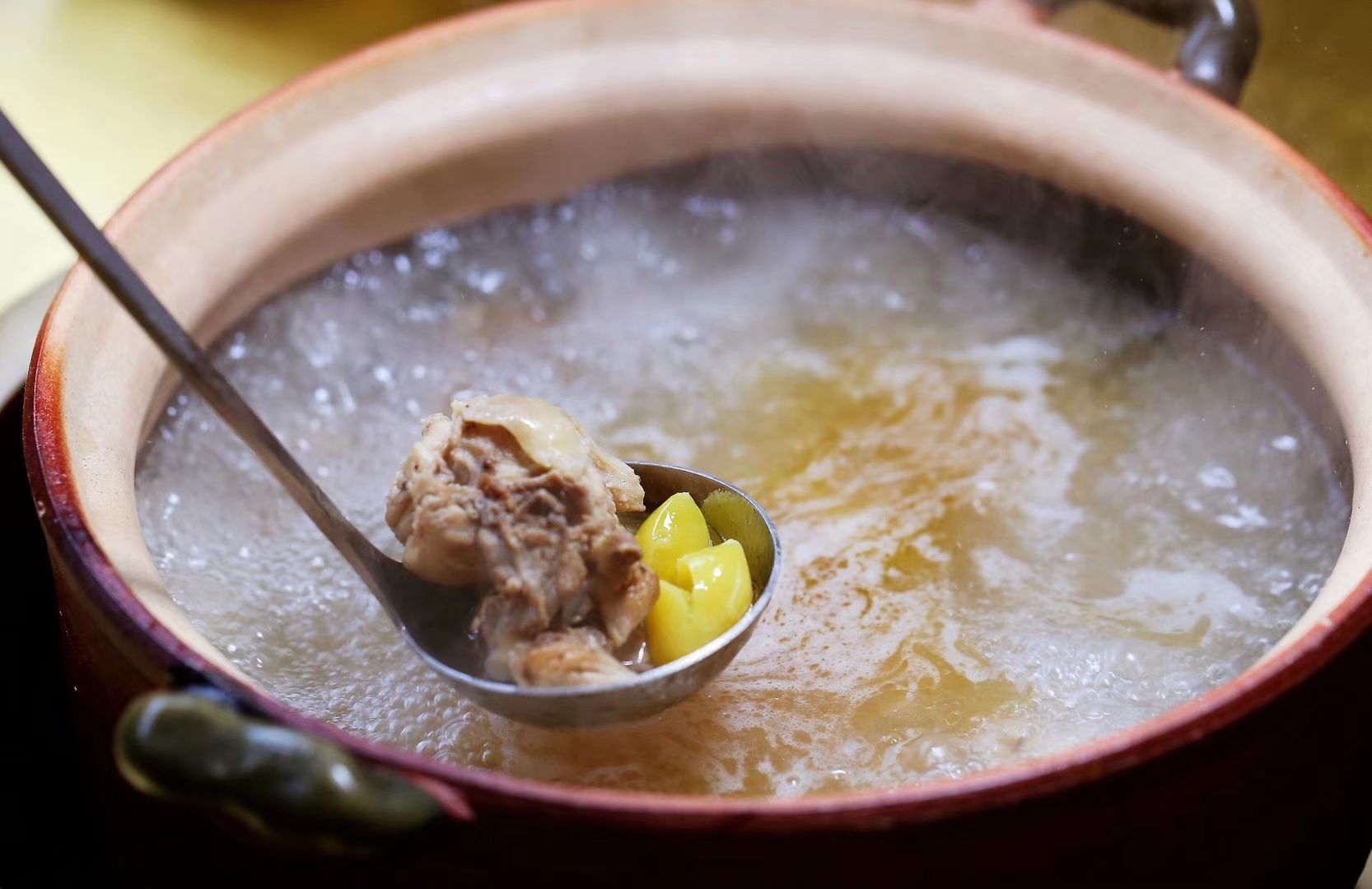 这家汤馆,白果鸡汤从表面一层黄色的鸡油就看得出用心了的,到最后越熬越浓,蘸碟还是烧椒味道,清淡的汤和辛辣的蘸碟很有对比度。很多川式的配菜比较出彩,凉拌白肉、粉蒸肥肠、萝卜牛腩、酸菜炒汤圆,最喜爱小炒鸡,我估计使用的青小米辣,太刺激了。