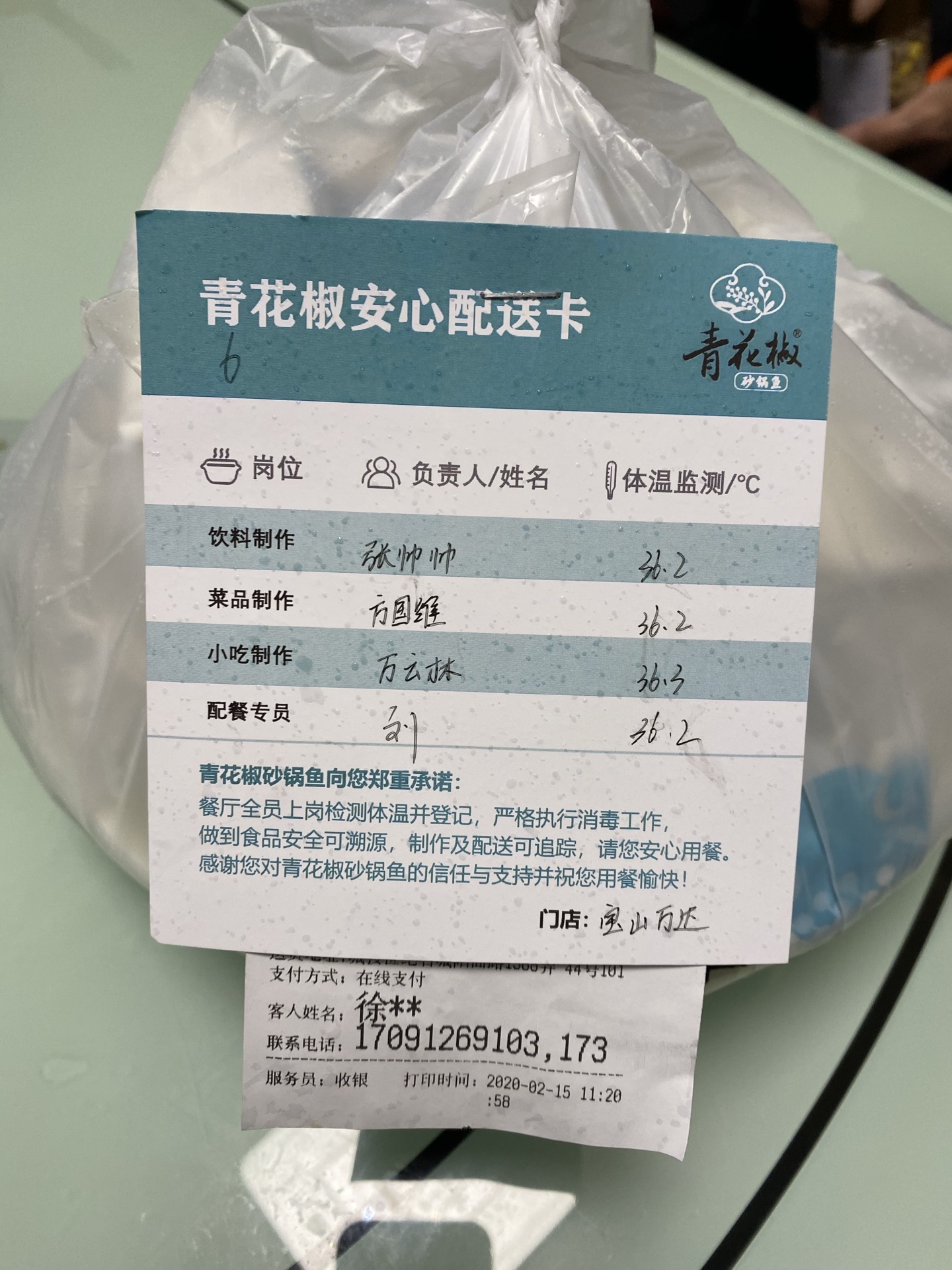疫情期间难得的还开着的餐厅,点了大份青花椒鱼,加了几份蔬菜,非常丰富。 包装很细致,会标明各工作人员的体温,让人放心。 鱼基本没刺,很q弹,稍等清淡了点,不是太辣。 配的魔芋丝量挺大的,好吃。 摇滚小酥肉,量不大,但够麻。