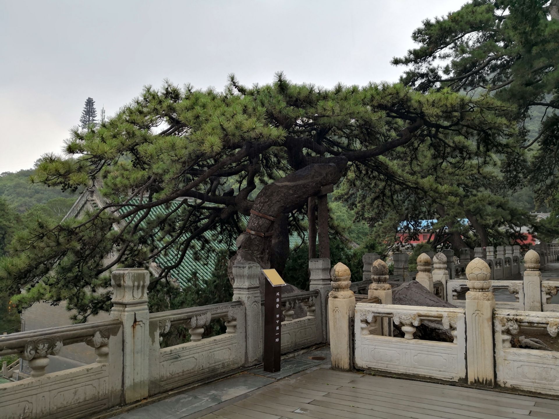 主干蜿蜒横生向石栏杆外、树皮斑驳,宛如一条降雨归来的苍龙,爬过石栏,舒适地卧在一块石碑上歇息卧龙松是戒台寺十大名松之一,有1000多年的树龄了。主干蜿蜒横生向石栏杆外、树皮斑驳,宛如一条降雨归来的苍龙,爬过石栏,舒适地卧在一块石碑上歇息。碑上所刻的“卧龙松”三个大字是清代恭亲王奕訢手书。