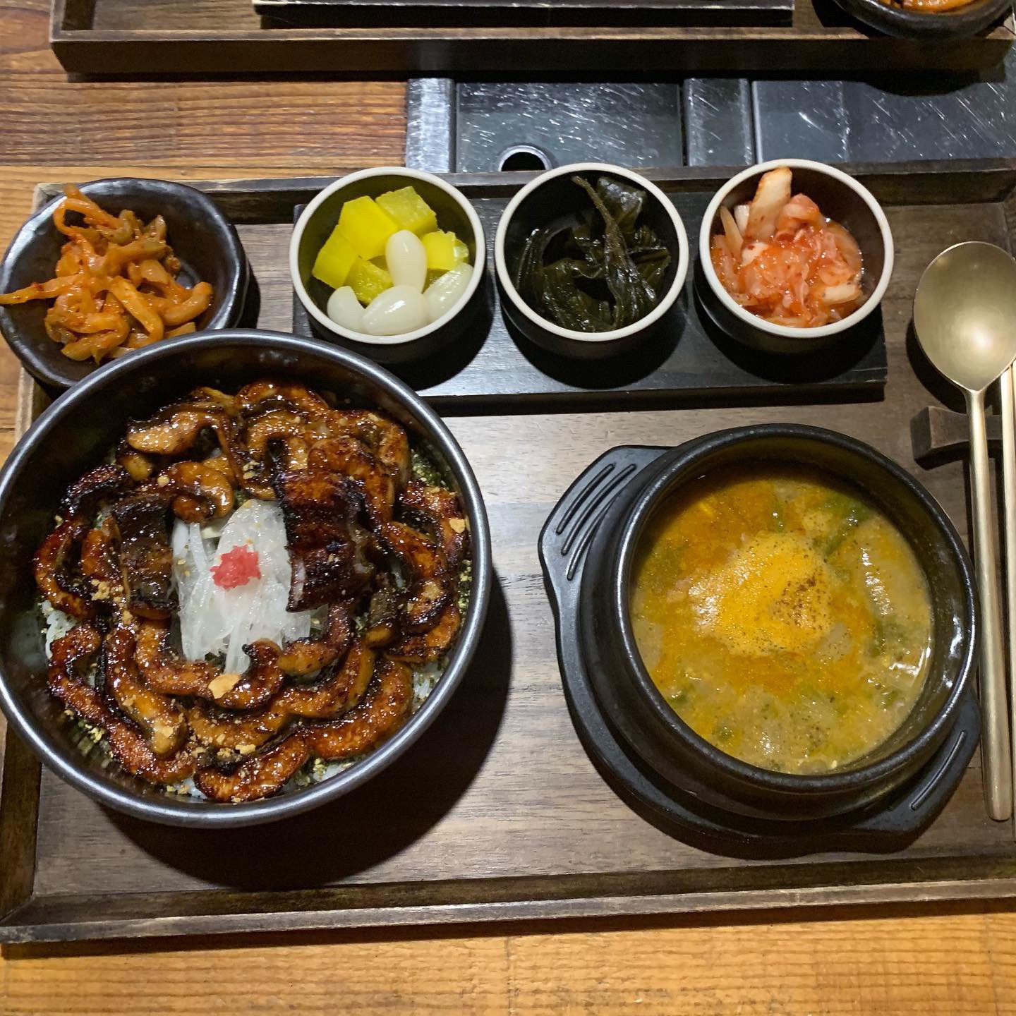 点了肥肥鳗鱼盖饭定食~ 新鲜的鳗鱼吃起来不会很腥~ 鳗鱼真的不要太好吃~ 鳗鱼是现烤的! 酥脆感十足,淋了一点点汁,不会盖过鳗鱼的香味~ 太下饭了,太好吃了… 平常不吃米饭的我,吃了一大碗饭,只剩了一点点~ 四小菜,一汤,一饭=满足~
