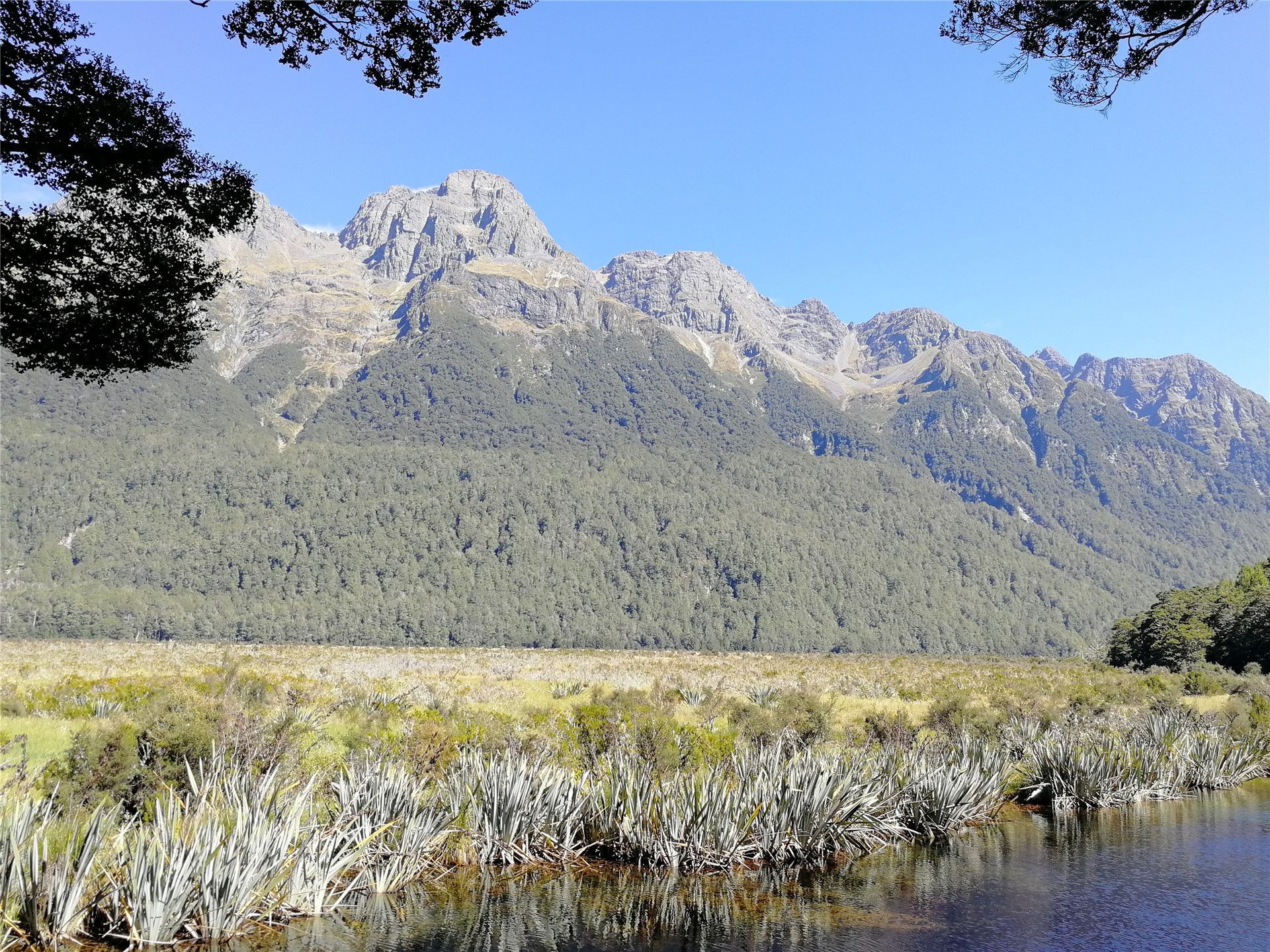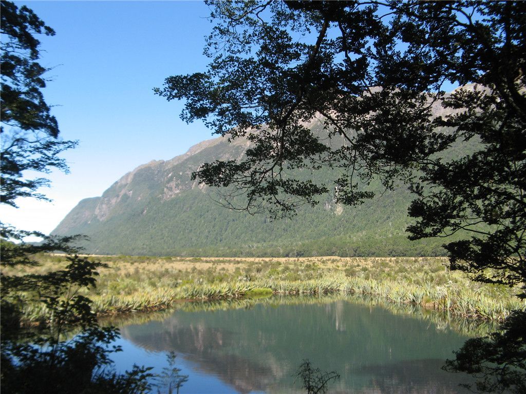 一个很壮观的山谷,是从蒂阿瑙前往米佛峡湾公园第一个值得驻足的地方。沿公路离开蒂阿瑙湖不远,穿过一段森林通道后,突然豁然开朗,宏大的山势,广阔的草原,立马让人眼前一亮。无论是自驾车、旅游团包车,还是两个运营米佛峡湾游轮公司的一日游大巴,都经常在此靠边停车,让客人充分的拥抱大自然。继续旅途又穿过一段森林通道,很快来到镜湖,这里就已靠近山谷的尾部了。