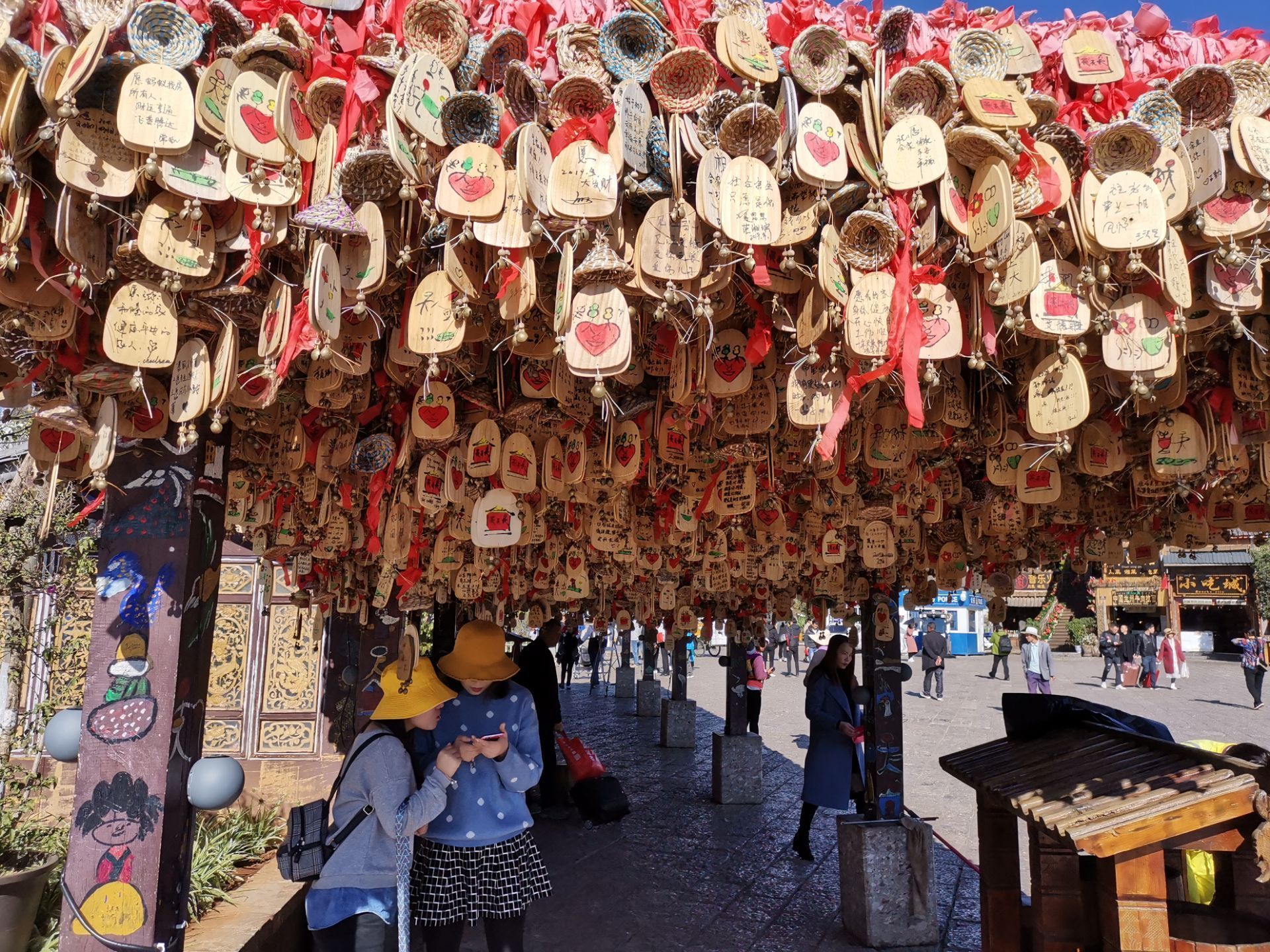 丽江古城大水车广场旁有一个许愿风铃群,大广场旁边很显眼。人很多是古城里游客必去的地方。两张木片加一个风铃,风中摇曳生姿。以前的马帮马匹和骆驼上都挂着风铃,听到风铃声就是马队平安回来了,是吉祥的标志。现在这些许愿牌给喧闹的古城平添一抹亮丽的色彩和祥和的氛围,因为它象征着浪漫与美好。