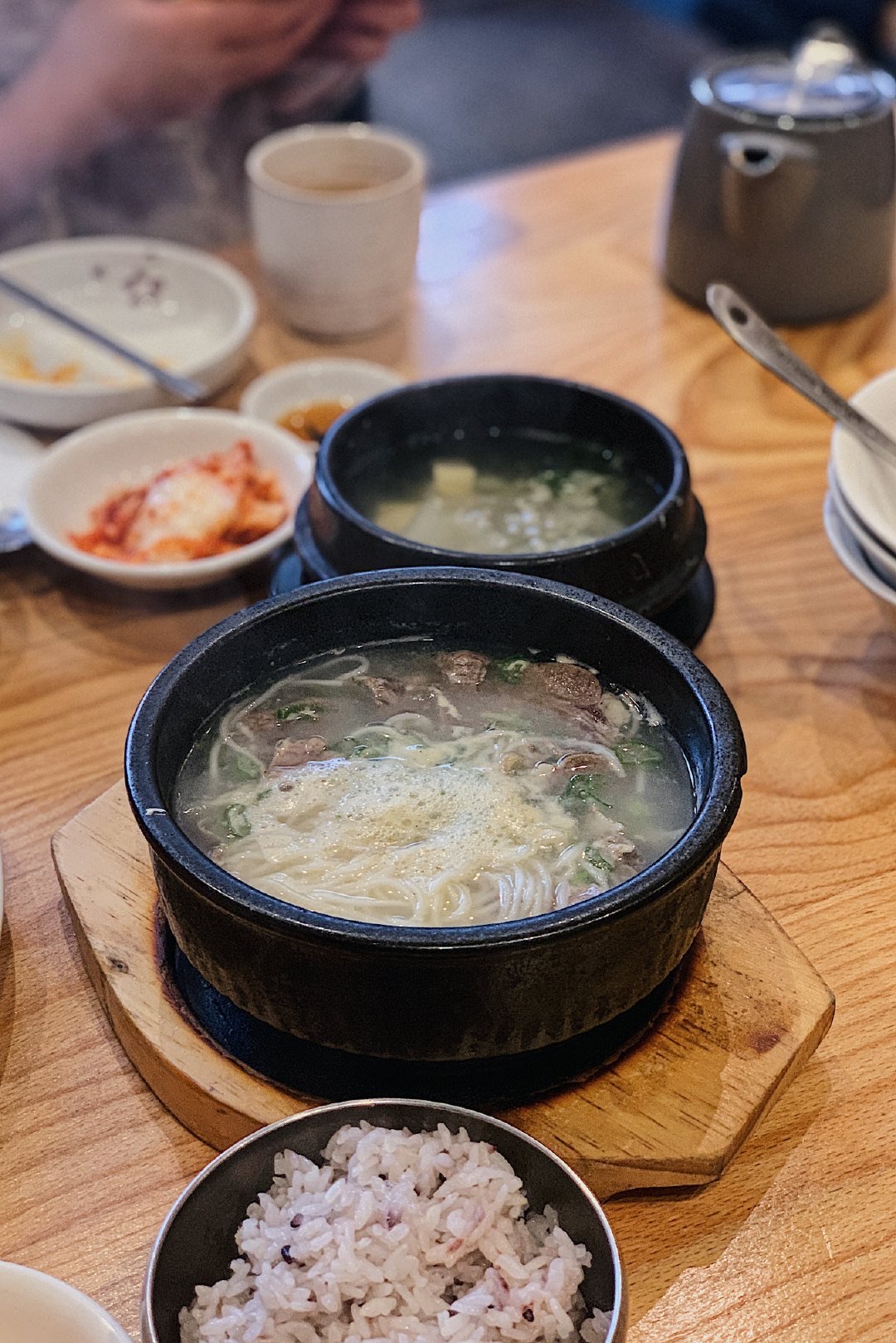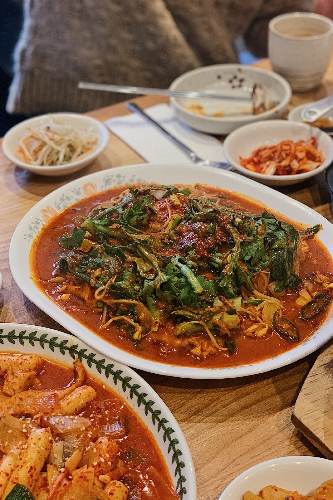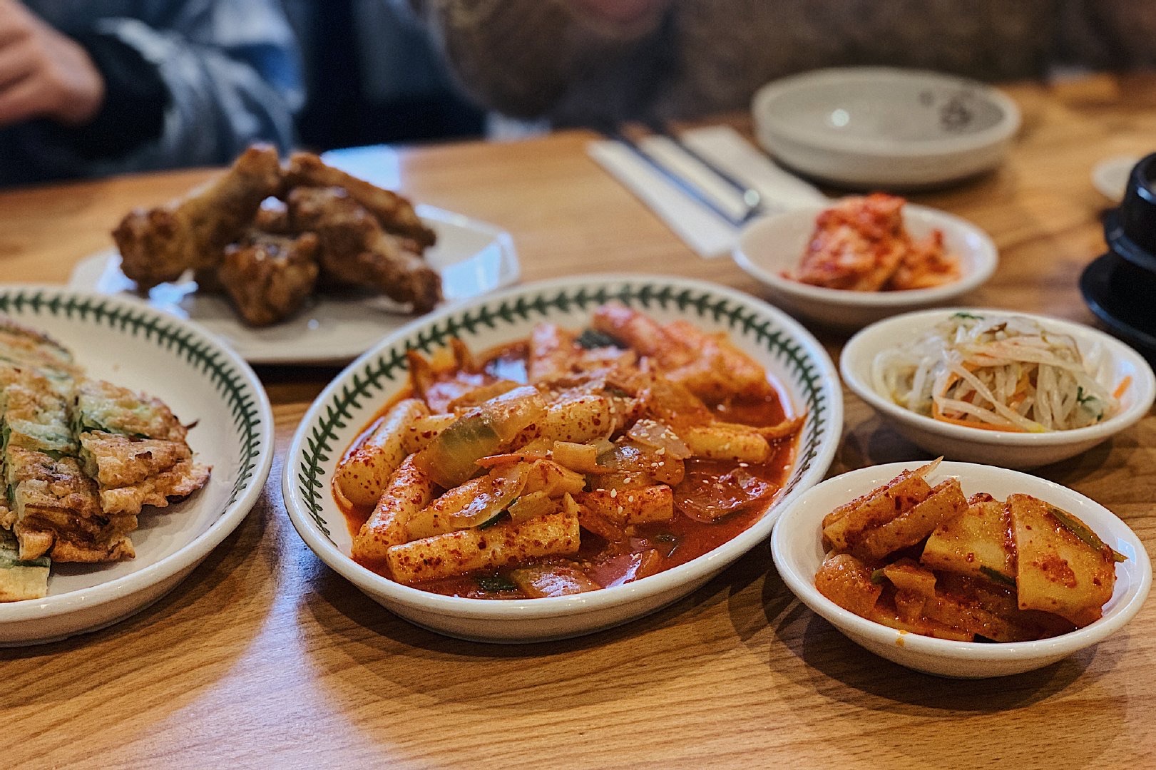这里的韩餐,和首尔市内的韩餐完全不是一个水平。 最推荐的是海鲜葱饼(파전),面糊炸得外酥里嫩,除了最边角上的四小块,几乎每口都可以咬到可口小章鱼。放上一片泡菜一起吃:一份煎饼,两种快乐。 辣炒年糕也推荐。难得辣椒酱和辣椒粉的比例正好,酱汁温和,不刺激不呛口,也不会甜得诡异。年糕的口感也是正好的软糯并稍带嚼劲,鱼饼一如既往是重点争夺项目 韩式辣炖鱼是招牌菜,一盘一条鱼。头部的肉有蒜瓣口感,我更喜欢些;尾部肉更软嫩些。酱汁依然美味,汤汁淘饭瞬间消灭半碗。我觉得比鱼本身还要好吃,毕竟鱼还是没有很新鲜的!哦对,他们家的米饭也蛮好吃的杂粮饭,口感饱满。 酱油炸鸡。我比较喜欢这种酱汁少,比较利索的炸鸡的,所以推荐给喜好相同的朋友。 雪浓汤就一般。