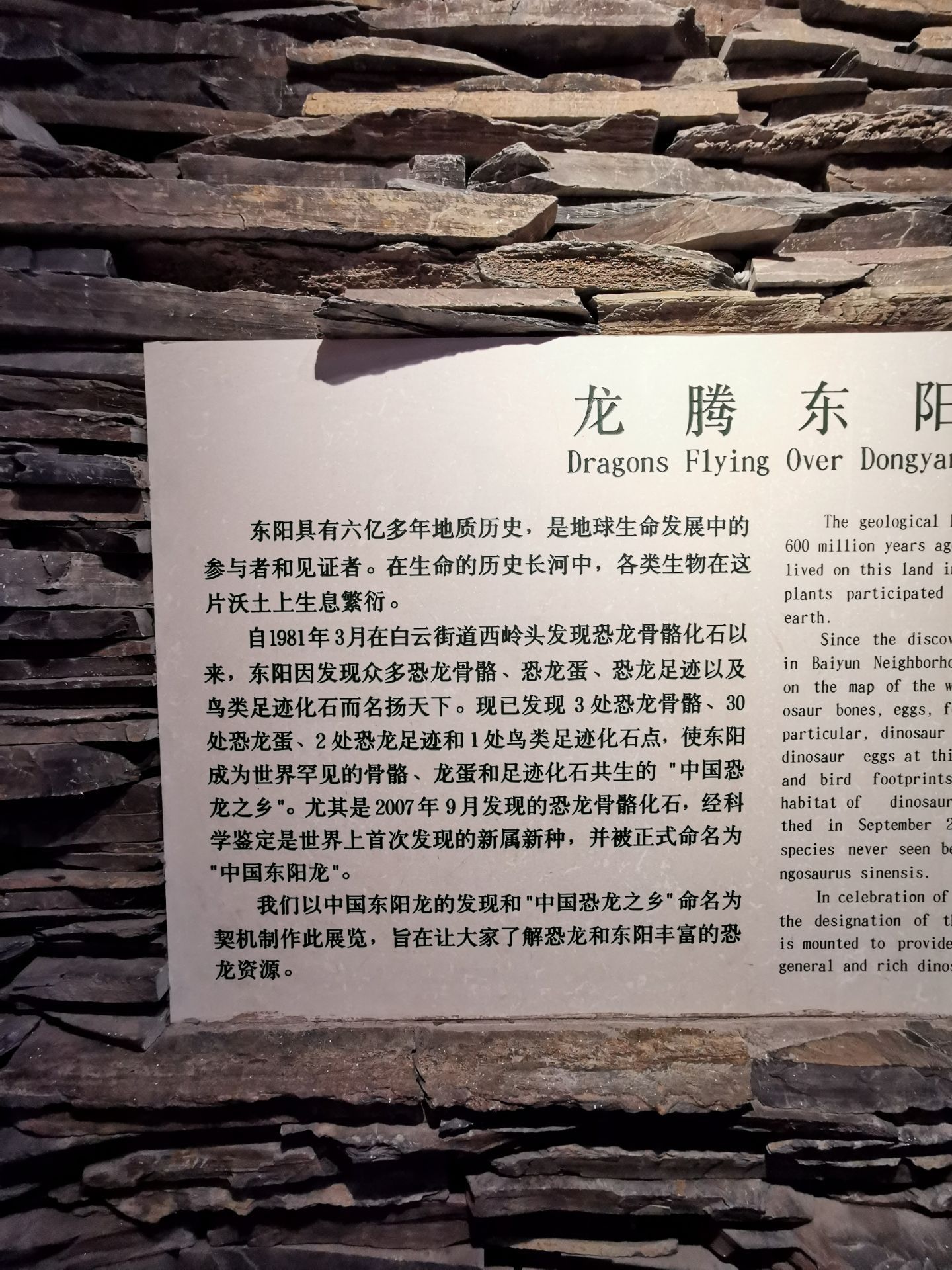 东阳博物馆是免费开放,集收藏、陈列、研究于一体的综合性博物馆,现有馆藏文物28000多件。馆内设“龙腾东阳恐龙展”固定展览,东阳是恐龙之乡。恐龙展厅占一半左右,以“中国东阳龙”的发现、发掘、清理、复原为主题,系统介绍恐龙这类远古生物在东阳的生活情景,以及与恐龙有关的科普知识,有所收获。