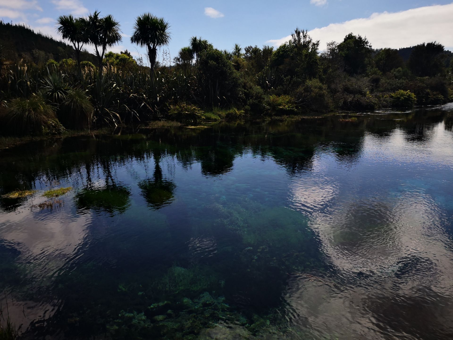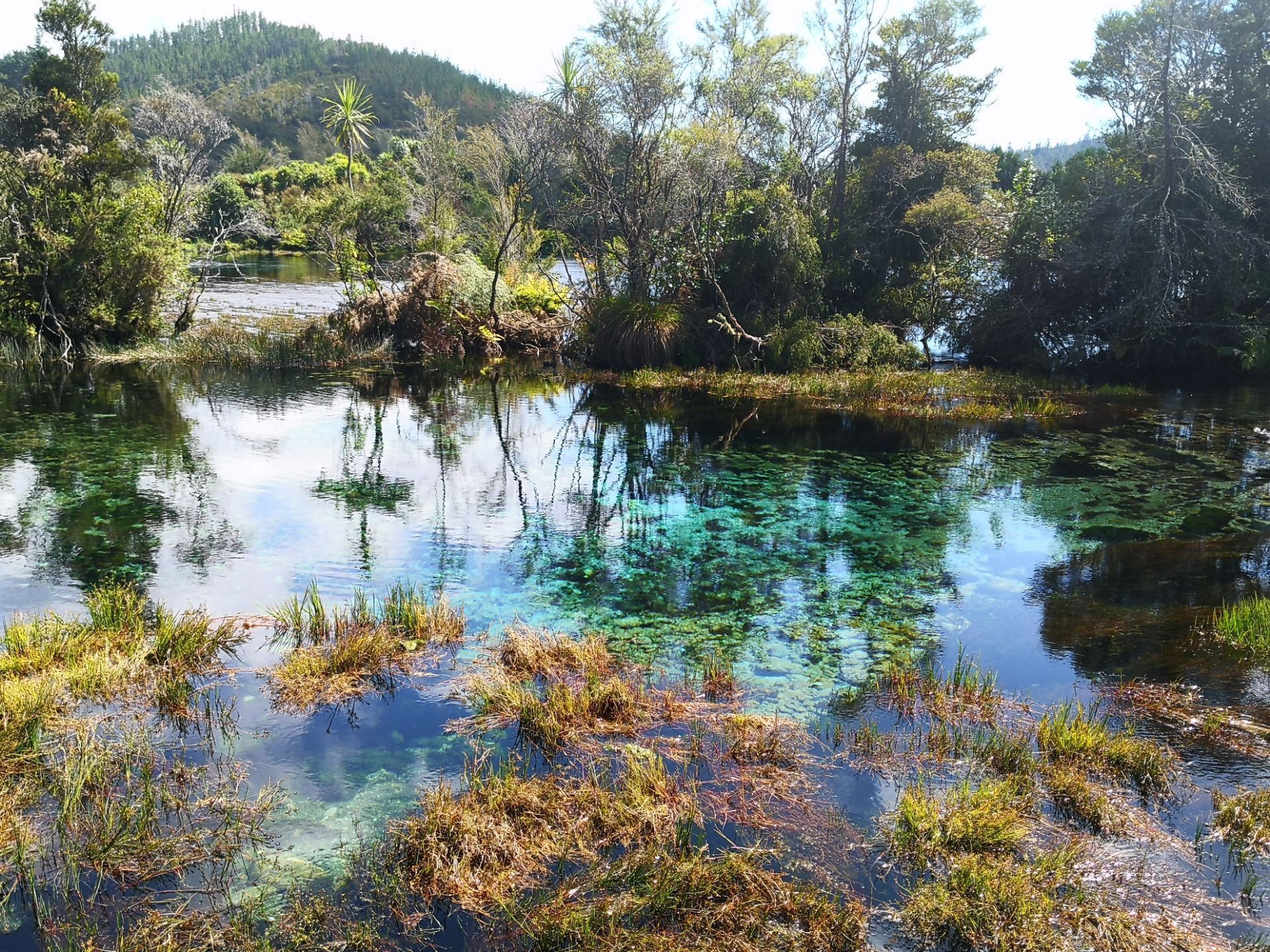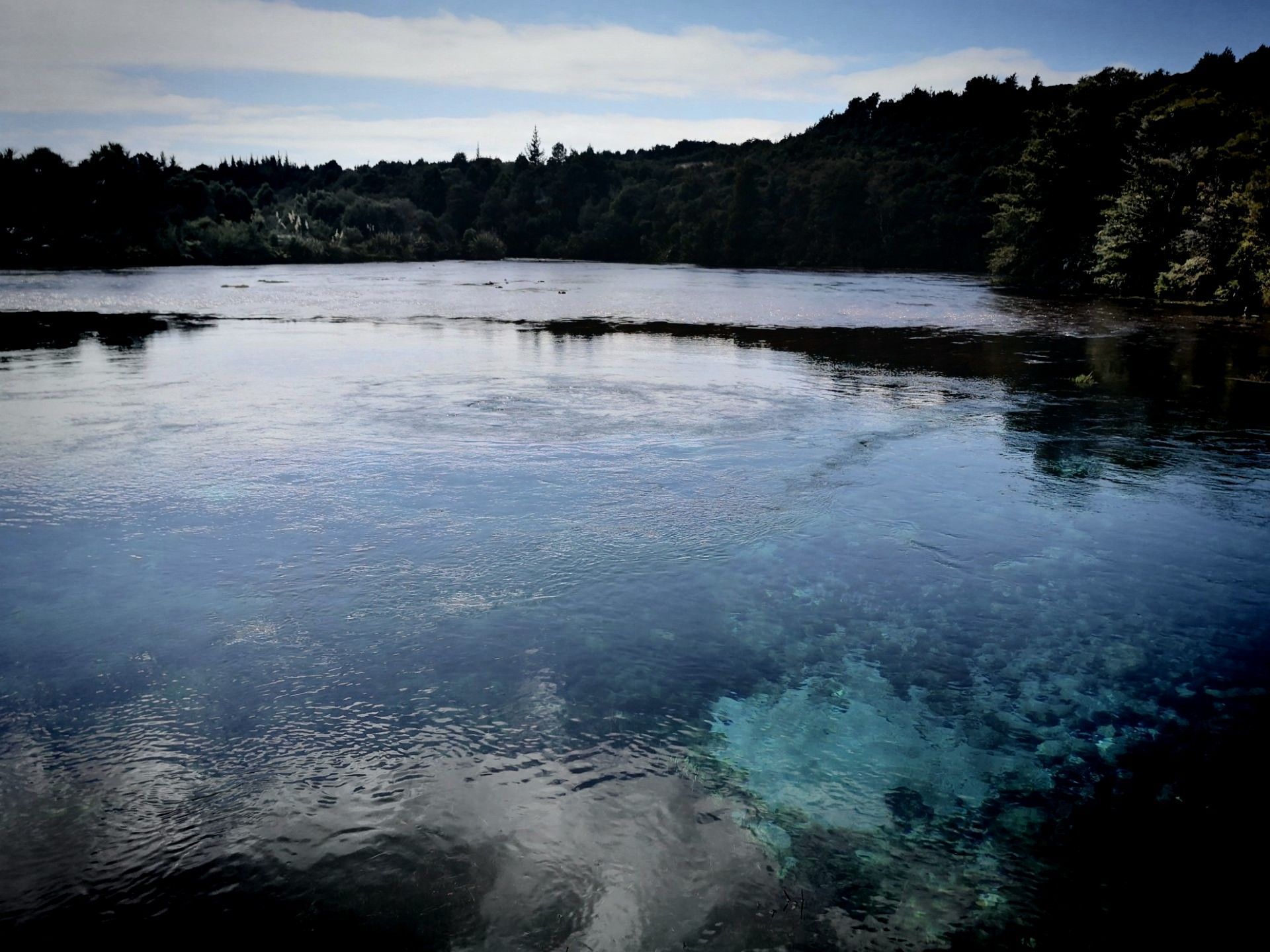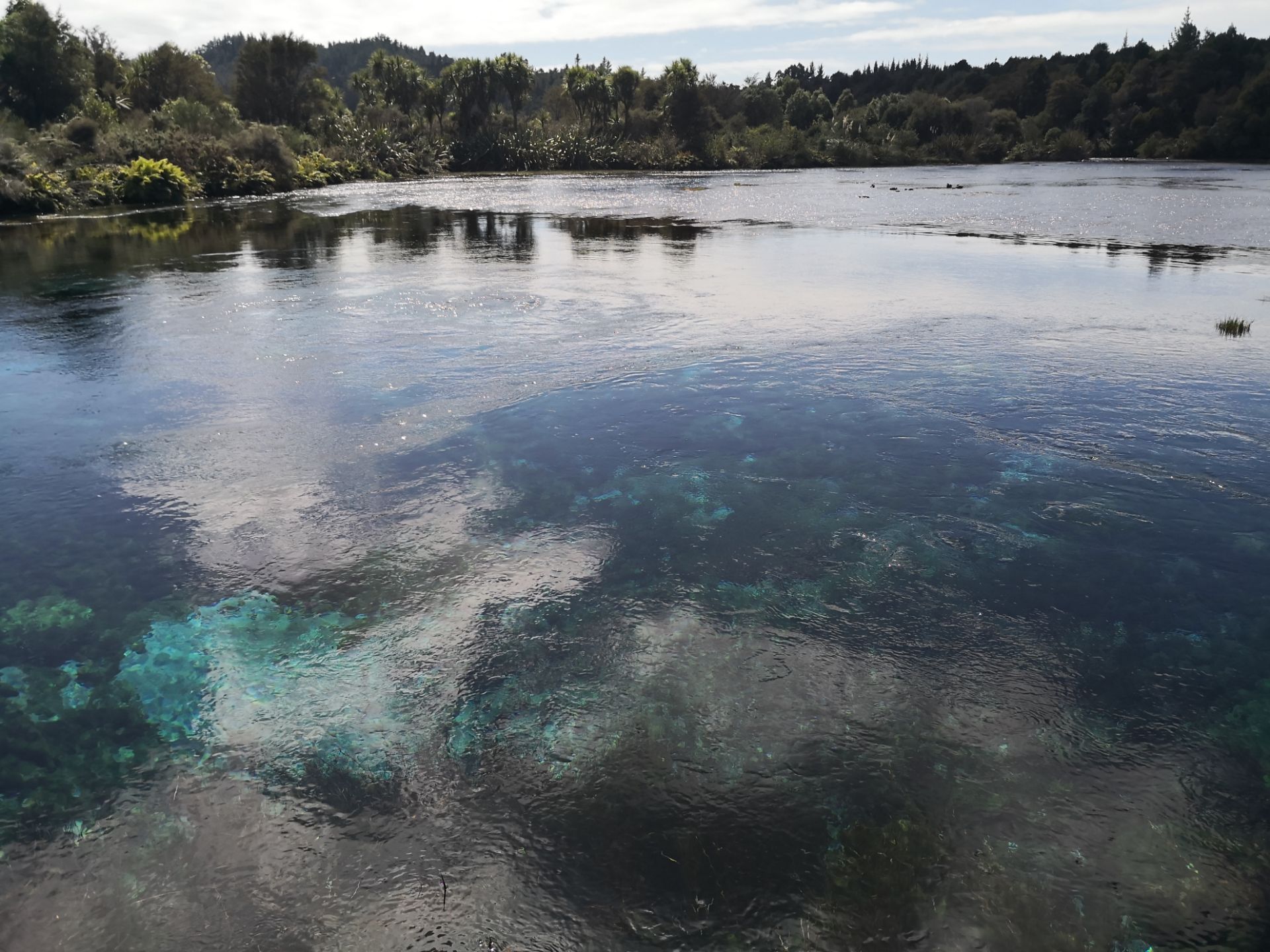 葡葡醛位置在新西兰南岛黄金湾附近,离阿贝尔塔斯曼国家公园很近,这里据说是一个个圣地出产南岛最大水量的温泉,主要确实很大,从地下竟然就相当于冒出一条河,而且这条河还挺宽 河水清澈见底,加上阳光的照射,配合上水底的浮藻,透出绿色和蓝色,以及各种其他的颜色,像一个浮踪的调色盘一样