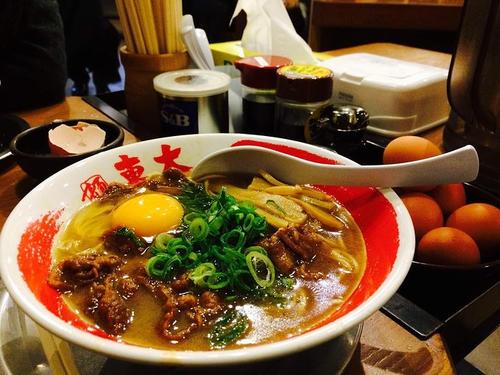 日本拉面要先买票,在机器上点你想吃的餐,然后投钱,以后会给你一张小票,拿小票去排队就餐。特色黑酱油加季节限定食材,感觉味道和卖相很一般啊,但是看旁边的日本人吸溜的一个半劲,可能这个味道比较适合本地人吧。