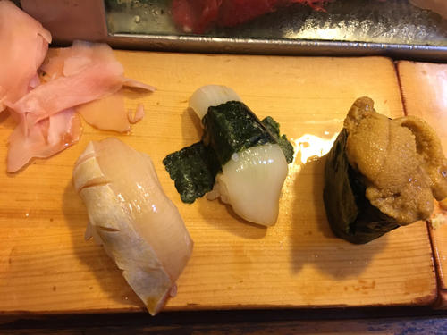 ...,而是主打主厨推荐套餐,鱼、虾、贝类都很新鲜,师傅的手速很快,总觉得让我也不自觉加快了就餐速度一位师傅负责三四个客人,一个捏好就放到我们各自的餐盘里。店内并无菜单提供,而是主打主厨推荐套餐,鱼、虾、贝类都很新鲜,师傅的手速很快,总觉得让我也不自觉加快了就餐速度。