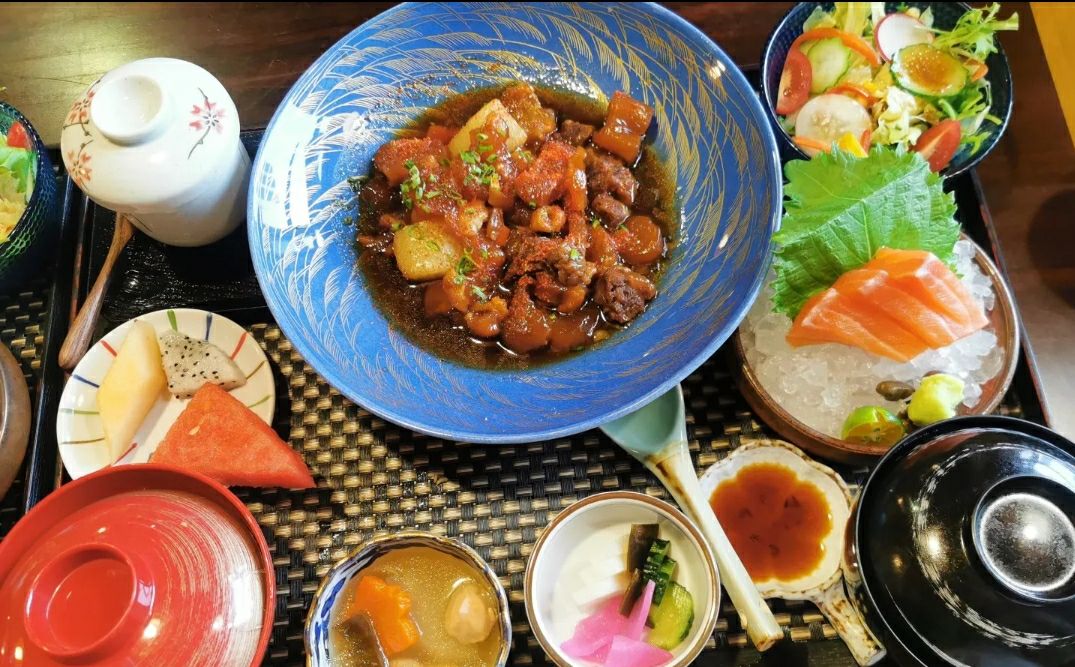 赵记老铺始创于清光绪二十一年,由多尔衮的第十一代传人爱新觉罗振国创建。 赵记老铺清水蟹店 位置在星海广场商服区C栋2号 墙上有一只大红螃蟹 很是显眼 店内环境没的说 逼格够高 服务人员也都穿的和服 点了两份定食套餐 一份日式煮碟鱼头套餐 鲽鱼肉嫩味道鲜美 里面的豆腐还很入味 还点了一份南蛮鸡套餐 鸡肉炸的还挺鲜嫩 肉不柴也不干 配合着蔬菜沾着沙拉酱 确实不错 每一份套餐都配有小咸菜 水果 味增汤 三文鱼 鸡蛋糕