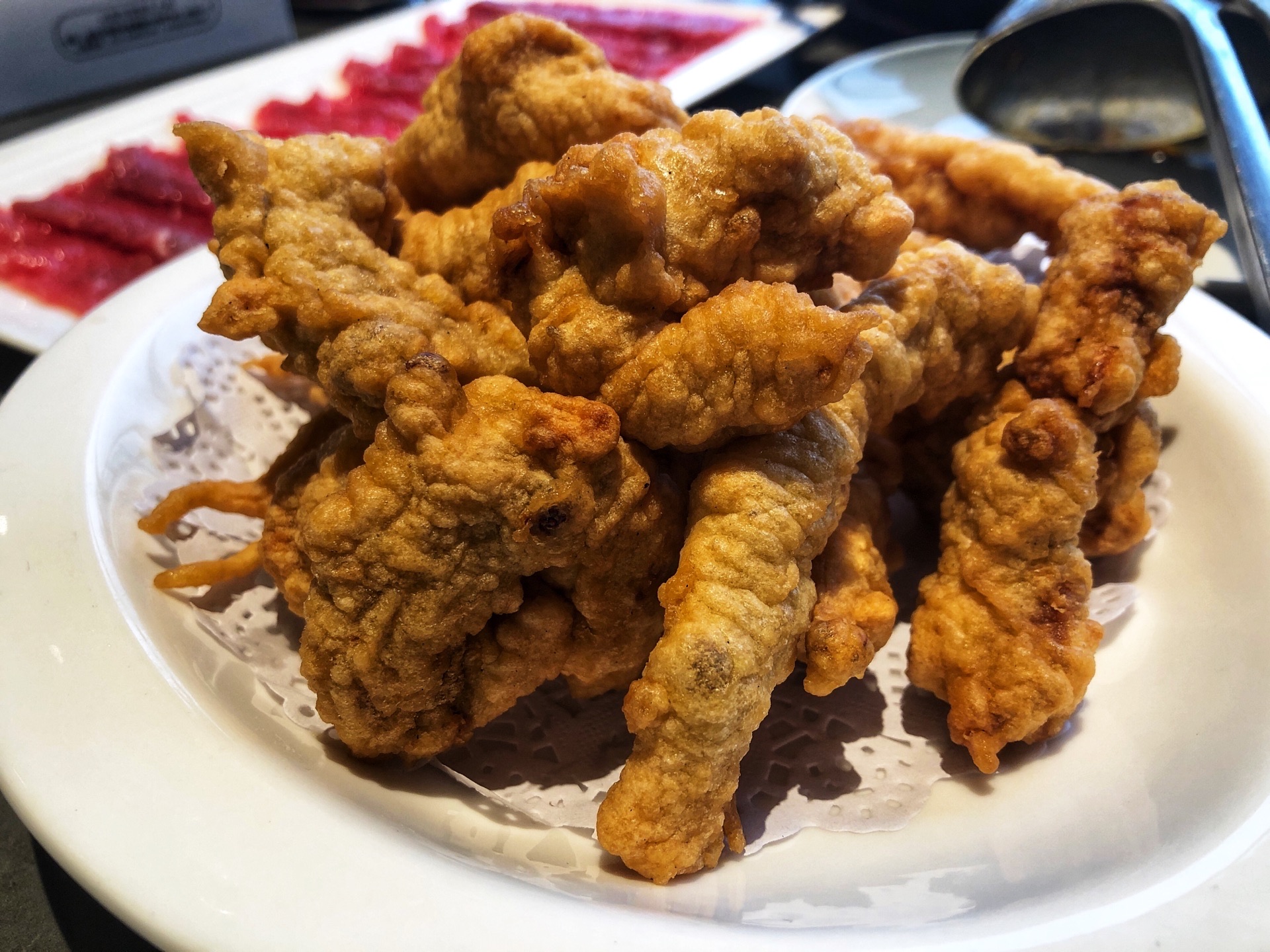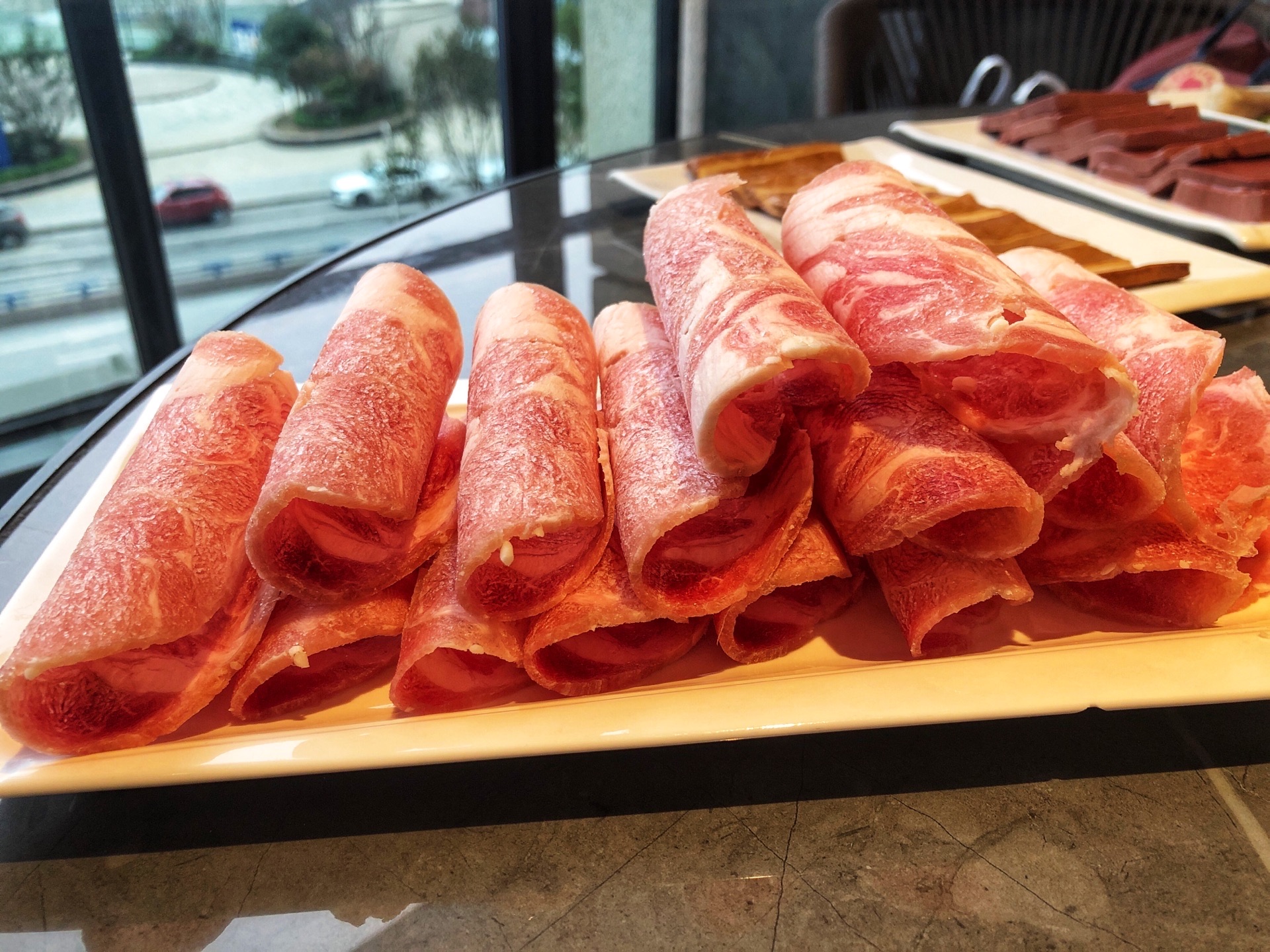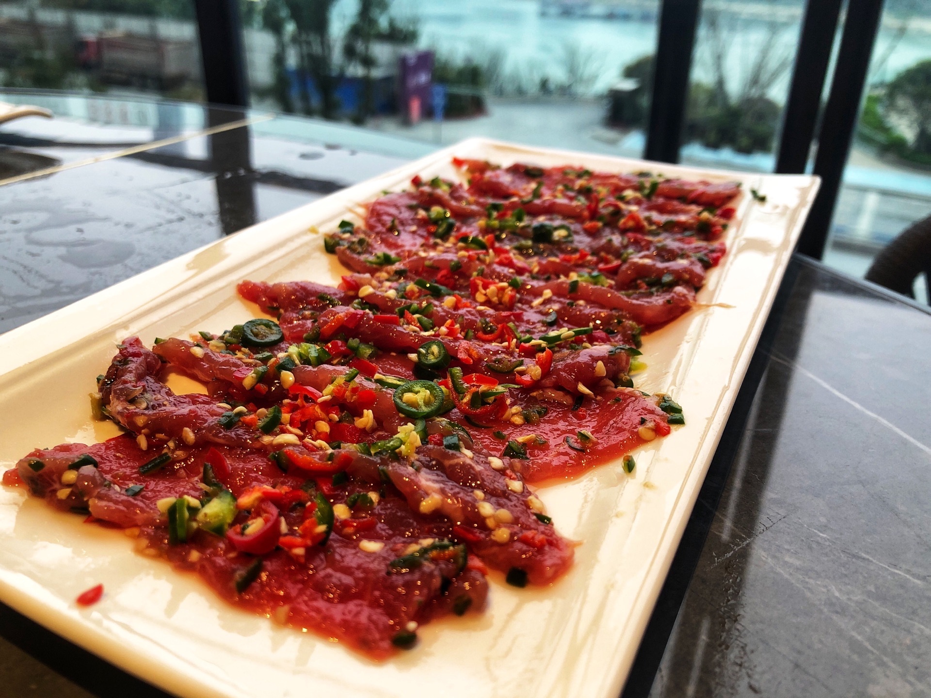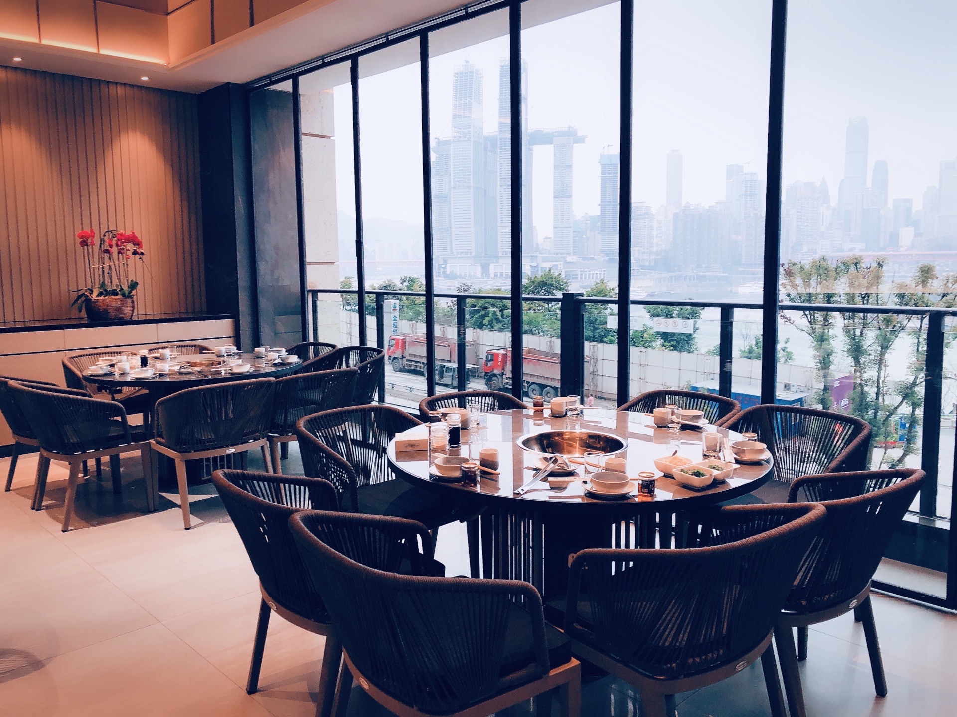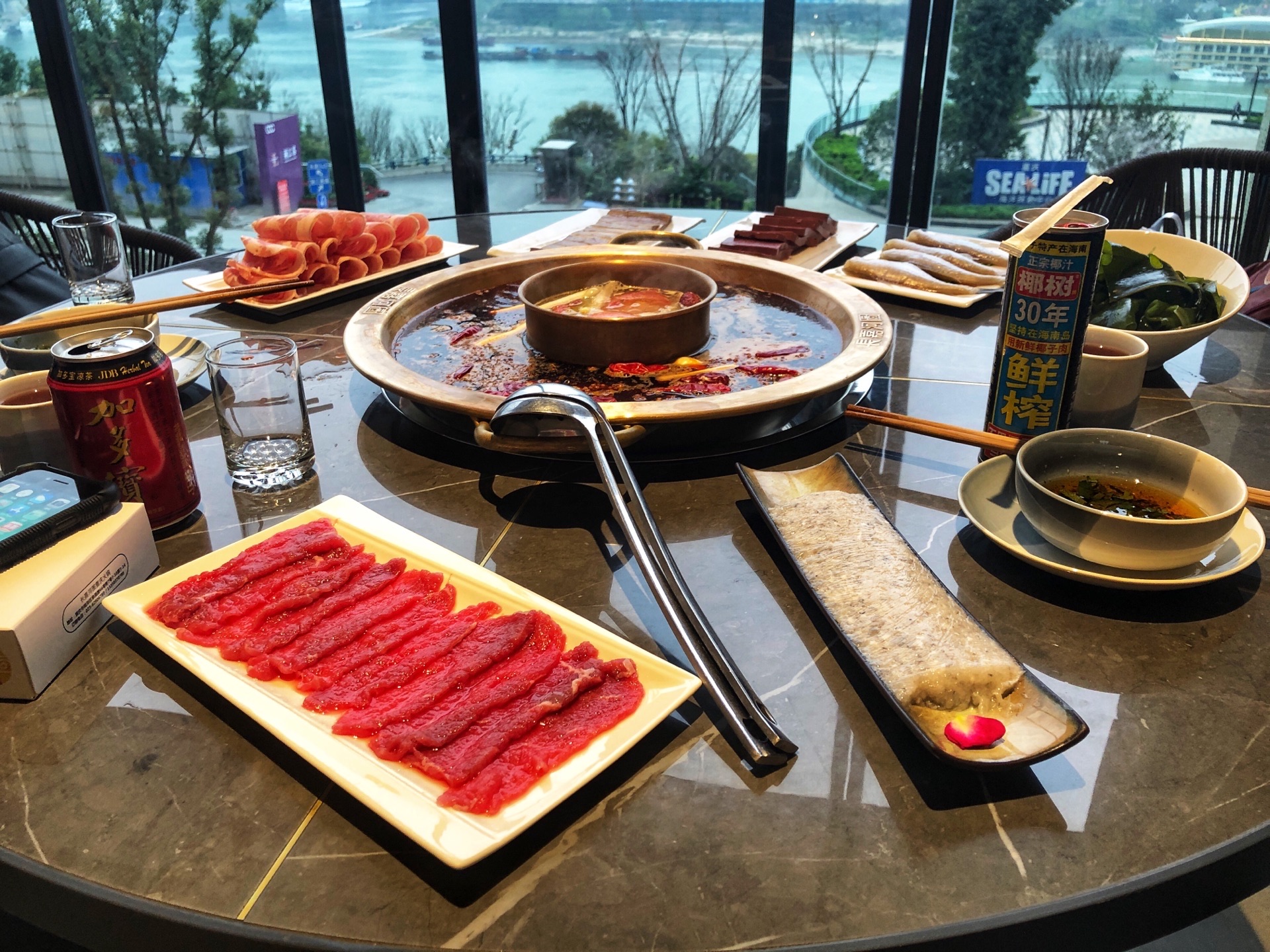 2019年3月某天,从弹子石老街逛完,找到这么一家环境比较好,好像也是必吃榜的餐厅~~ 餐厅环境属于现代轻奢风~餐厅人不多,给我们两个人一个大圆桌,靠近窗边,能看到江景~ 点鸳鸯锅会被重庆人笑话,但是我们怕太辣肠胃受不了,还是选了大骨鸳鸯锅~~ 一定要点耗儿鱼,其他就随意搭配了酥肉、虾滑、牛羊肉、鸭血、海带芽、豆干等~~