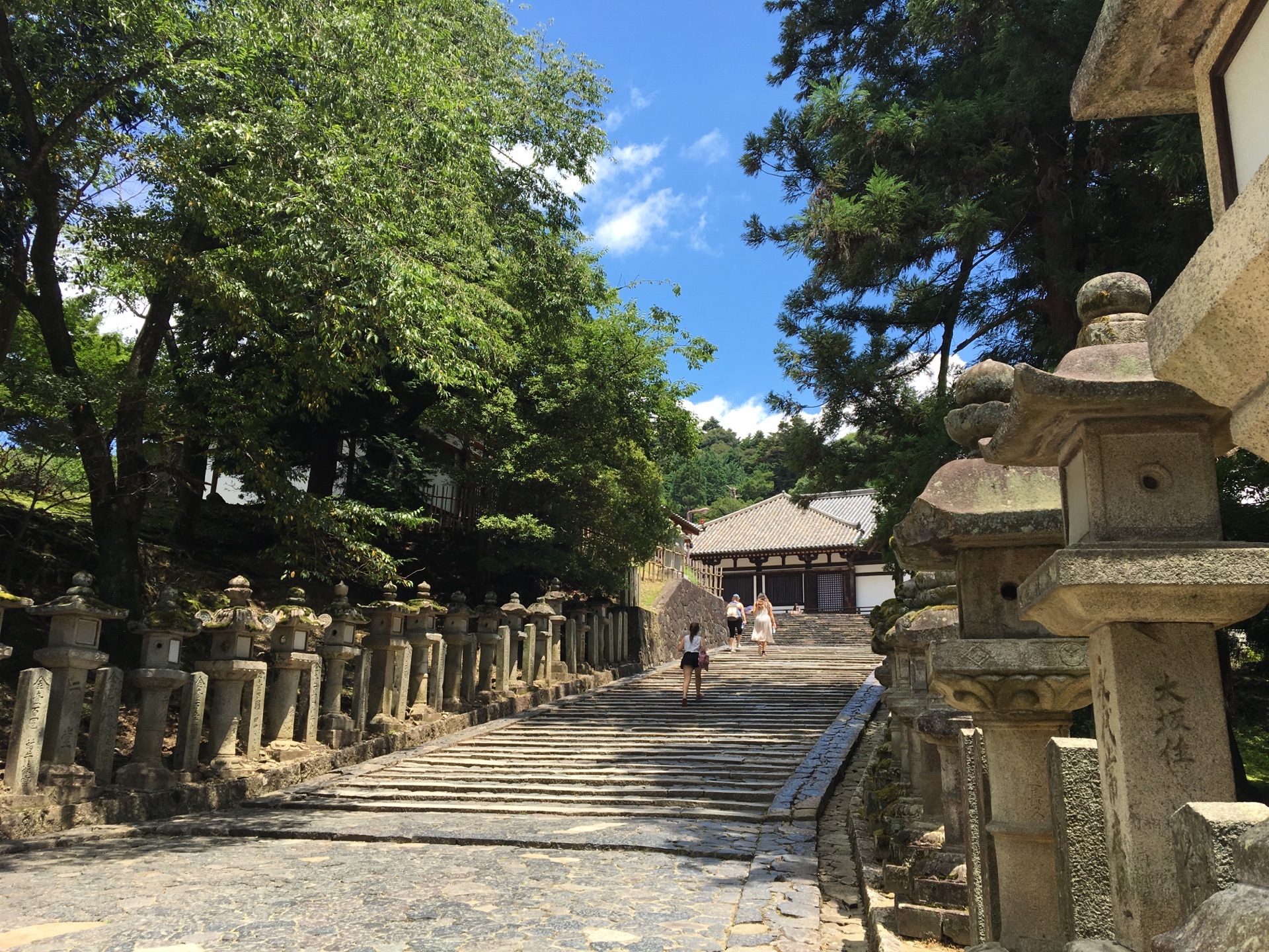 从东大寺前往二月堂,会经过一段缓缓的石台阶,两旁有很多的石灯笼。再继续往上走,两边都有很多的石碑,上面写的是什么什么人捐助了多少钱,信众们真的都是很虔诚的,修建寺庙是绝对的舍得。二月堂是奈良居高赏风景的好地方,站在上面有一种心旷神怡的感觉。
