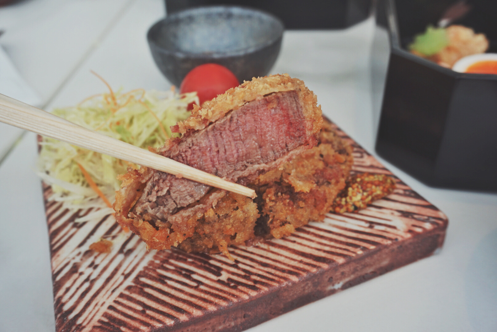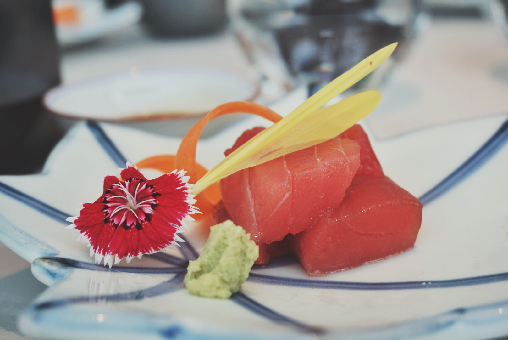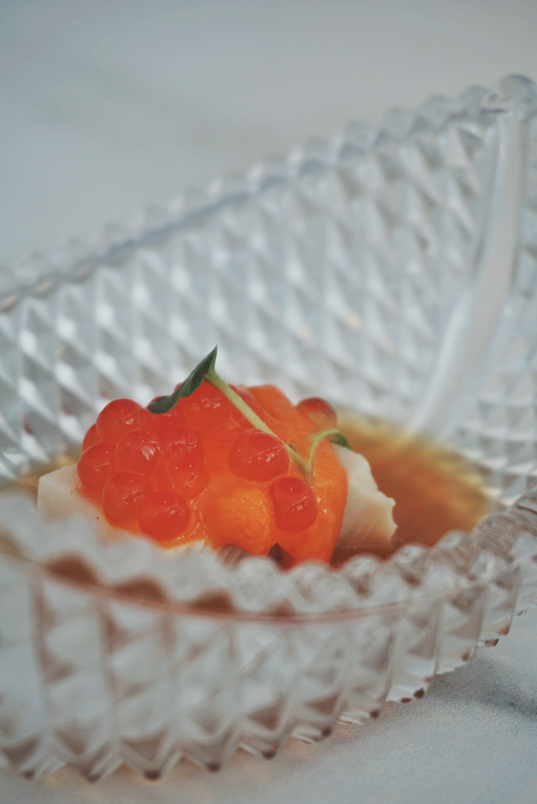 环球中心68楼上新开的米其林二星日料餐厅, 电梯直达,瞬间冲上云霄的感觉… 趁着试营业来体验一把午市套餐, 约了靠窗位,风景独好,和东方明珠比肩, 刚入坐,服务员就端上欢迎紫苏茶和擦手毛巾, 还询问了是否有忌口,很贴心了… 前菜是胡麻豆腐配海胆鲑鱼籽, 海胆很新鲜,鱼籽入口爆裂开,鲜咸味很赞, 豆腐也是细腻,口感绵密… 刺身是三文鱼大脂,非常肥厚, 芥末是现磨的山葵,放在刺身上直接吃… 八寸拼盘,定食套餐做得很精致, 每个都是小小的,却用心雕琢, 大虾、三文鱼、鳗鱼,每一款都不错, 搭配米饭,自己还可以DIY… 炸牛排,用的是M5和牛,外面酥脆, 里面的牛肉差不多五分熟口感, 沾着秘制调料超好吃! 甜品有两款,芝士蛋糕非常细腻, 很 mini,一口一个! 还有一个是盐焗冰激凌, 吃起来第一口很微妙,再吃就上瘾了, 搭配了火龙果和蓝莓,下面还有橙子果肉, 造型口味都完美值得打Call!